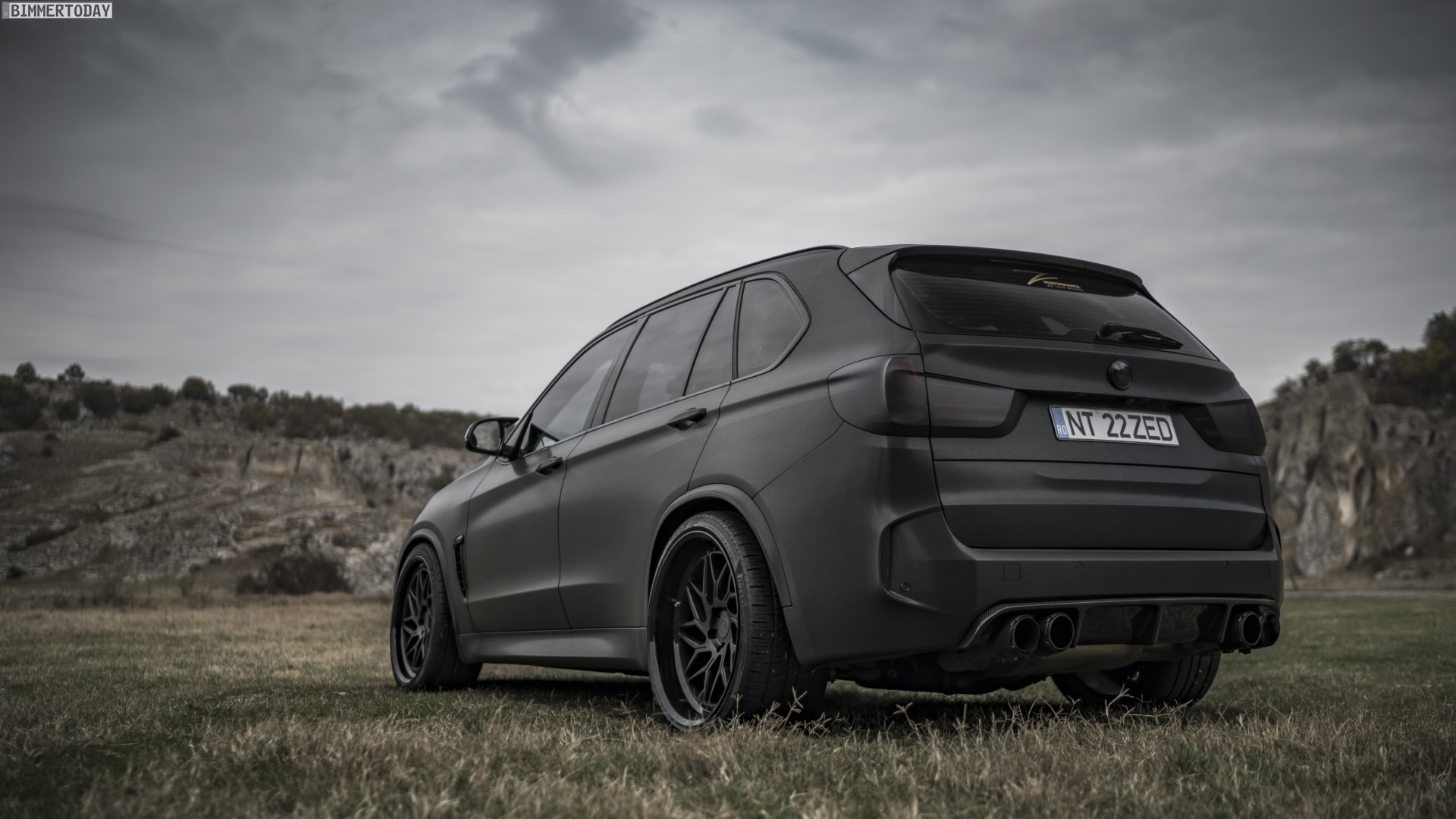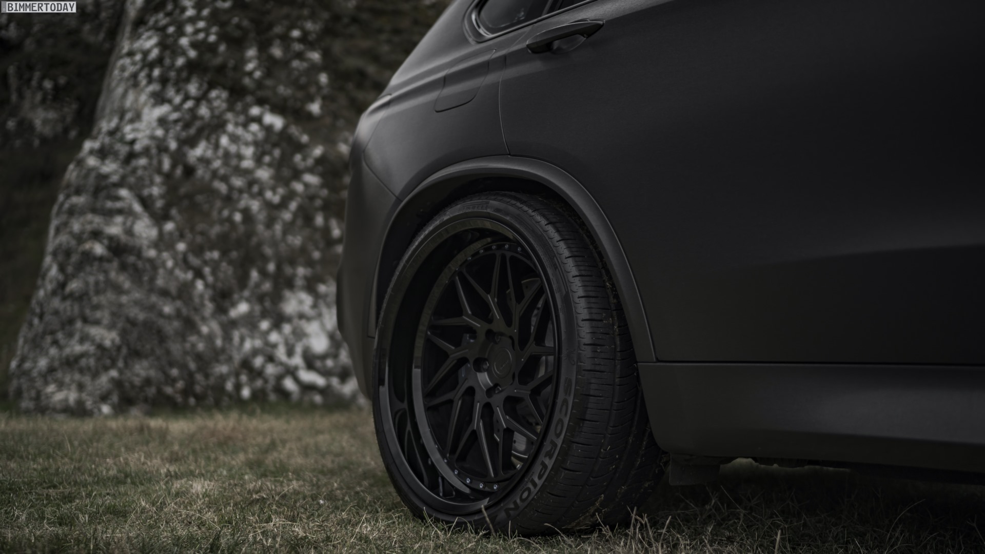 Bei den mehrteiligen Leichtmetallrädern handelt es sich um 22 Zoll große Felgen vom Typ ZP.Forged 12 Deep Lip in mattem Schwarz, die auch die riesigen Radhäuser des BMW X5 M mühelos ausfüllen. Die blaue Verschraubung der Felgen setzt einen der wenigen farbigen Akzente, ist aber auch nur bei genauerem Hinsehen zu erkennen. Für humorlose Traktion sorgt die Pirelli Scorpion Zero-Bereifung mit 285 Millimetern Breite vorn und sogar 325er-Walzen an der Hinterachse.
