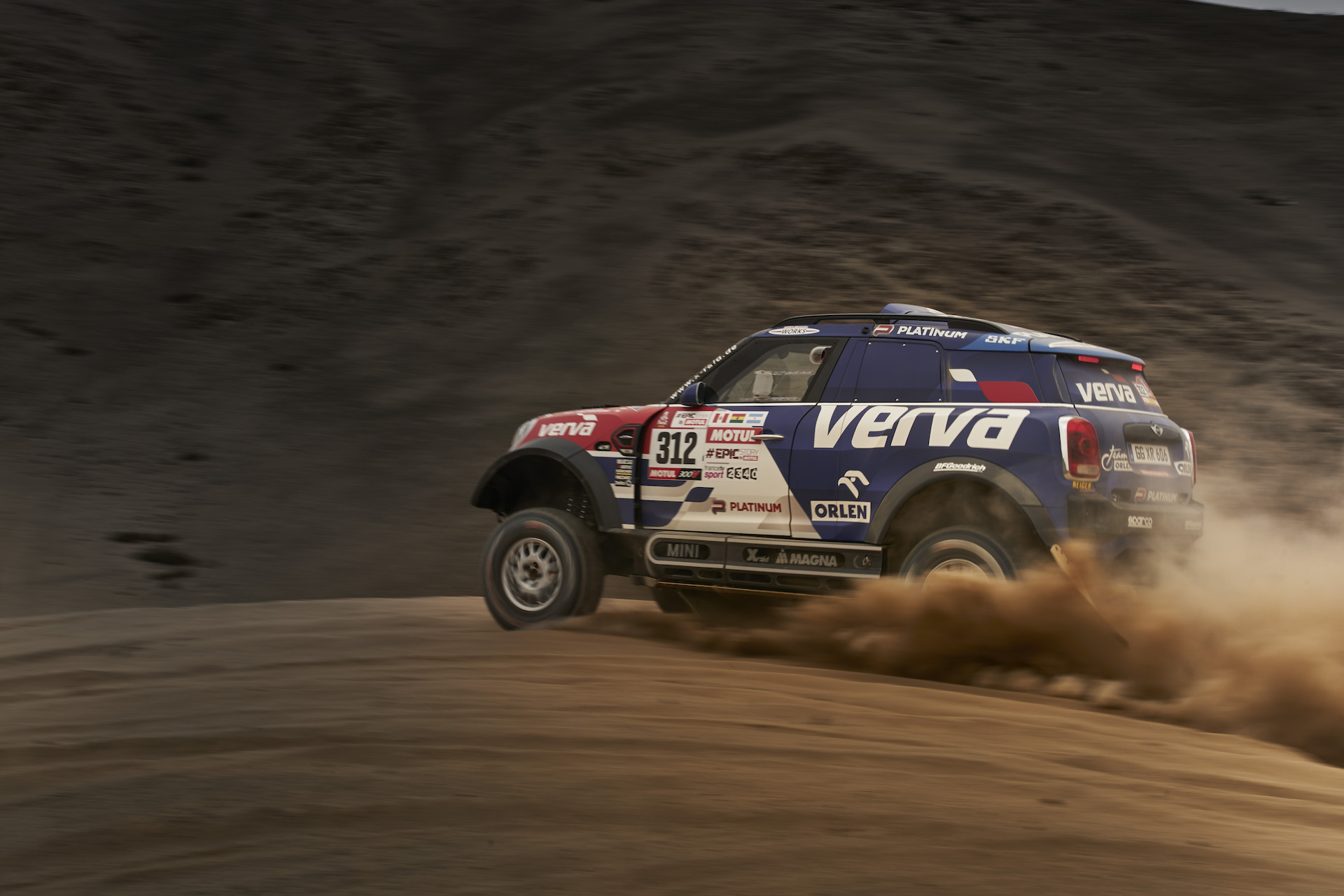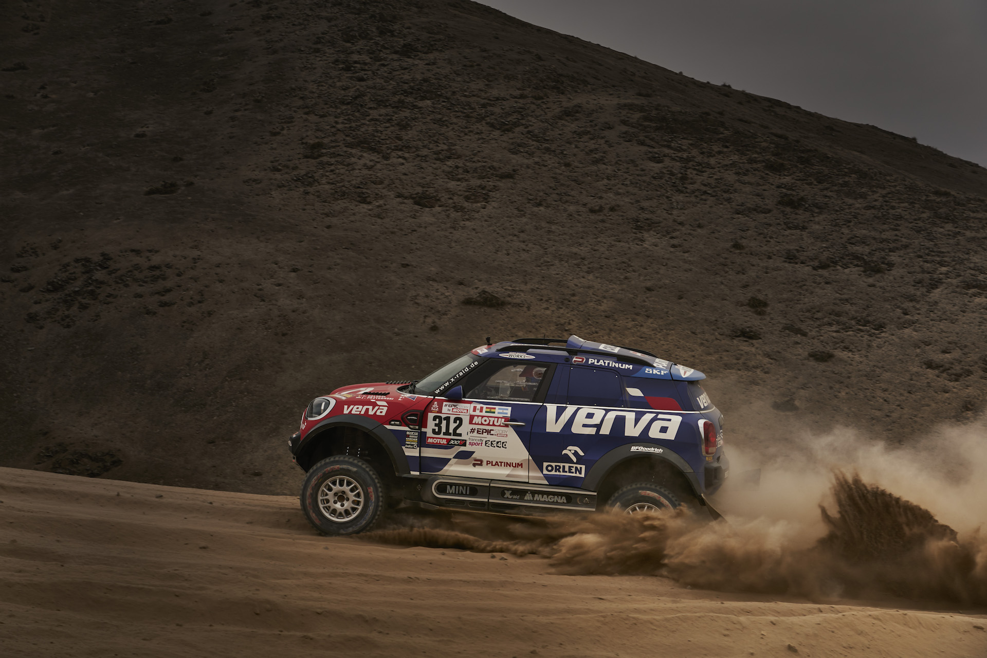 Ein X-Raid-Techniker bedeutet uns, dass es nun an der Zeit sei, T-Shirt und Hose bei brühenden 30 Grad gegen einen gut gefütterten Rennanzug zu tauschen. Einige Minuten später klettern wir in den blau-roten Orlen-Mini mit der Startnummer 312, dem Arbeitsgerät des polnischen Rallye-Rennfahrers Jakub Przygonski, der nach diversen Dakar-Einsätzen auf dem Motorrad nun zum dritten Mal am Steuer eines Autos teilnimmt. „Kuba“, wie der 32-Jährige hier genannt wird, hat heute bereits einige Trainingsrunden absolviert und wirkt völlig entspannt – obwohl ihm zwei harte Wochen Dakar-Dauereinsatz mit völlig ungewissem Ausgang bevorstehen.