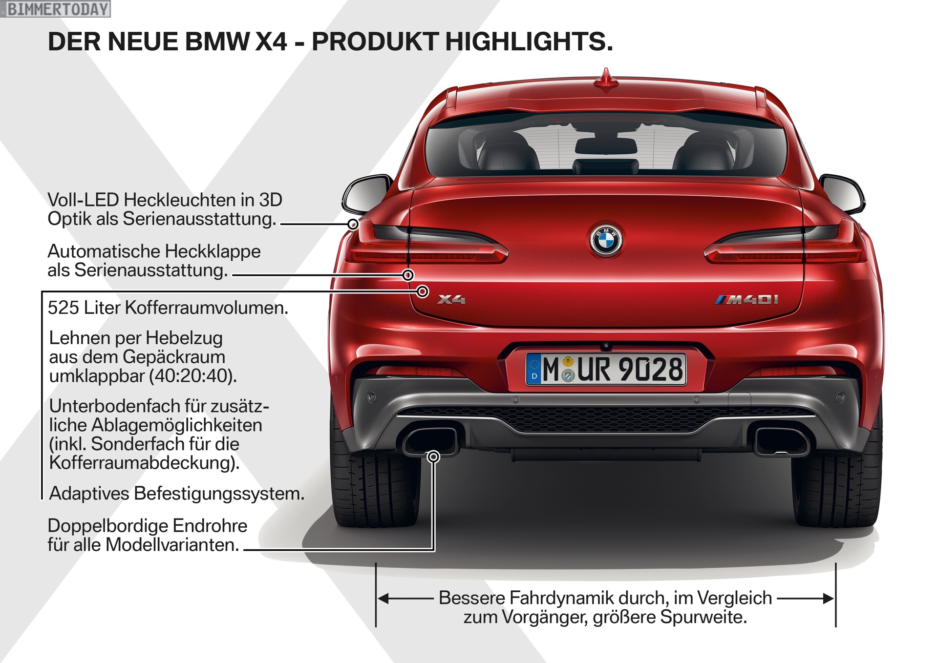 Mit einer Länge von rund 4,75 Meter ist der neue BMW X4 2018 rund 8 Zentimeter länger als sein Vorgänger, gleichzeitig ist er drei Millimeter flacher. Das Resultat sind etwas gestrecktere und flachere Proportionen in der Seitenansicht. Dank einer um knapp vier Zentimeter auf rund 1,92 Meter gesteigerten Breite steht der neue X4 außerdem stämmiger auf dem Asphalt. Trotz der insgesamt größeren Abmessungen konnte das Gewicht je nach Motorisierung um rund 50 Kilogramm reduziert werden.