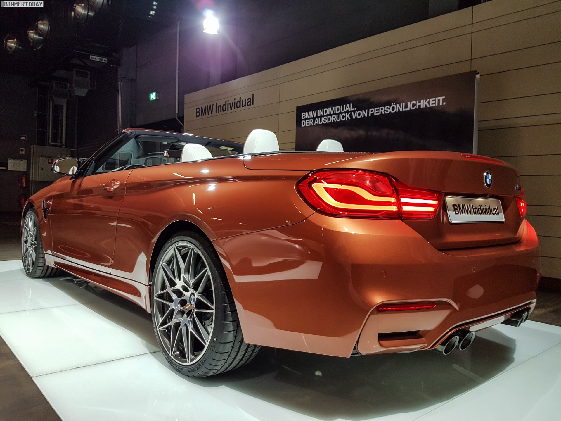 Der an Kupfer angelehnte Farbton macht das derzeit im Garchinger BMW M Showroom ausgestellte M4 Cabrio F83 LCI zu einem absoluten Exoten und garantiert viele neugierige Blicke. BMW Individual Byzanz Metallic harmoniert hervorragend mit den schwarzen Akzenten des Competition Pakets, die schwarze Einfassung der Nieren mit ebenfalls schwarzen M Doppel-Streben setzen einen spannenden Akzent zur Lackierung. Die 20 Zoll großen Leichtmetallräder im Design Sternspeiche 666 M sind ein bekannter Bestandteil des Competition Pakets.