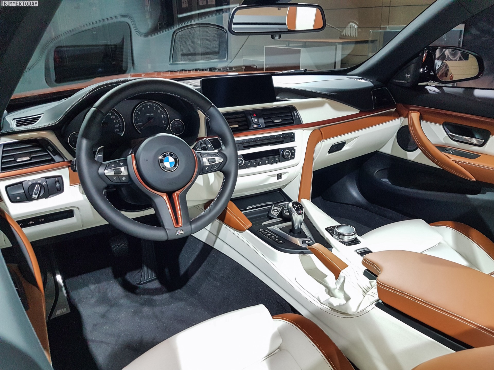 Auch der Innenraum des gezeigten BMW M4 Cabrio beeindruckt mit exklusiven Details. Neben einer zweifarbigen Lederausstattung wird auch die Außenfarbe erneut aufgegriffen: Die Akzentleisten am unteren Rand der Interieurleisten glänzen ebenso in Byzanz Metallic wie die Zierspange auf dem M Sportlenkrad. Weitere Details wie der Leder-Balg des Handbremshebels oder die belederte und mit Kontrastnähten verzierte Instrumententafel werten das Interieur zusätzlich auf.
