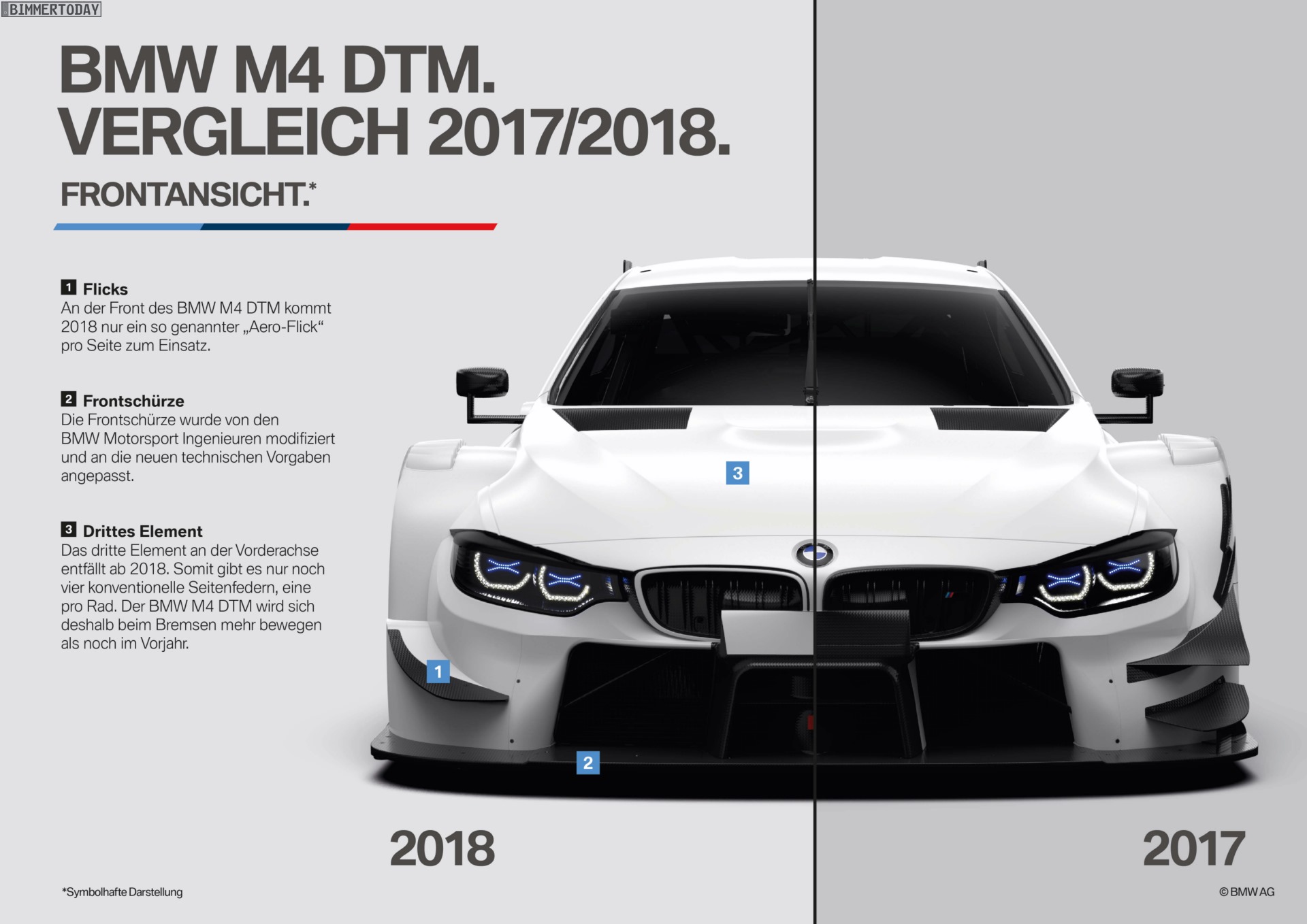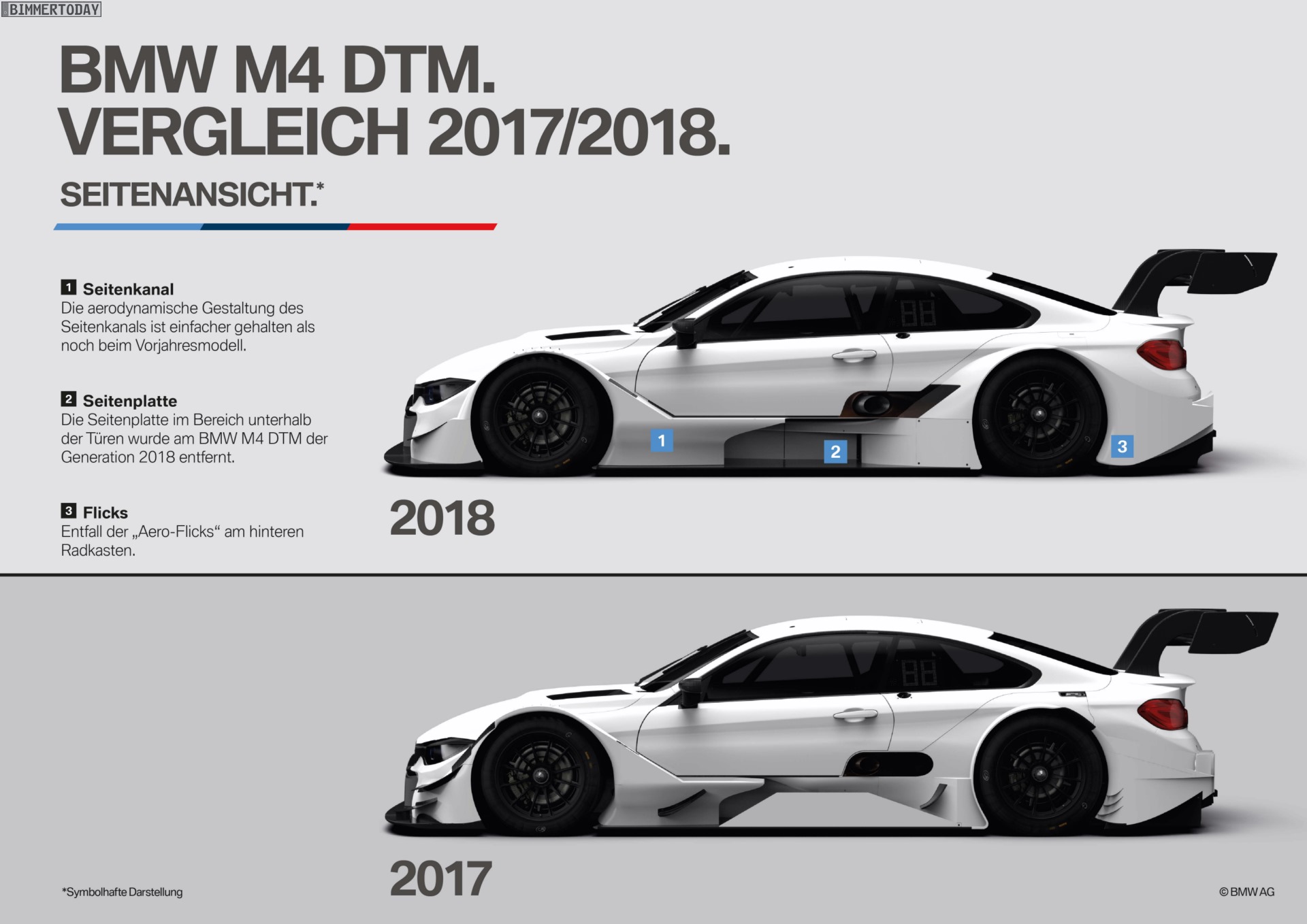 Wie die Vergleichs-Bilder von BMW Motorsport zeigen, wurde die Komplexität der Aerodynamik in vielen Details reduziert. Weniger Flicks an der Front und den hinteren Radkästen, ein einfacher gestalteter Seitenkanal unterhalb der Türen und ein entschärfter Diffusor am Heck reduzieren den Abtrieb des BMW M4 DTM 2018, gleichzeitig konnte auch der Luftwiderstand reduziert werden.