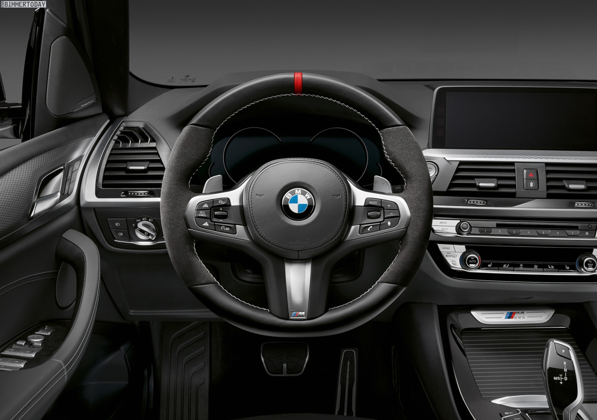 Der Innenraum der SUV-Modelle lässt sich unter anderem mit dem BMW M Performance Lenkrad aufwerten. Der Lenkradkranz ist im Griffbereich unterfüttert und mit hochwertigem Alcantara bezogen, der obere und untere Teil des Lenkrads ist ebenso wie die Lenkradblende mit schwarzem Leder bezogen. Eine rote 12-Uhr-Markierung und graue Kontrastnähte betonen den dynamischen Look zusätzlich. Für die Mittelspange stehen alternativ zur Ausführung in Carbon und Leder auch offenporiges Carbon und eine reine Hochglanz-Carbon-Variante zur Wahl. Passend dazu gibt es auch eine Schaltwippen-Ausführung in Carbon hochglänzend.