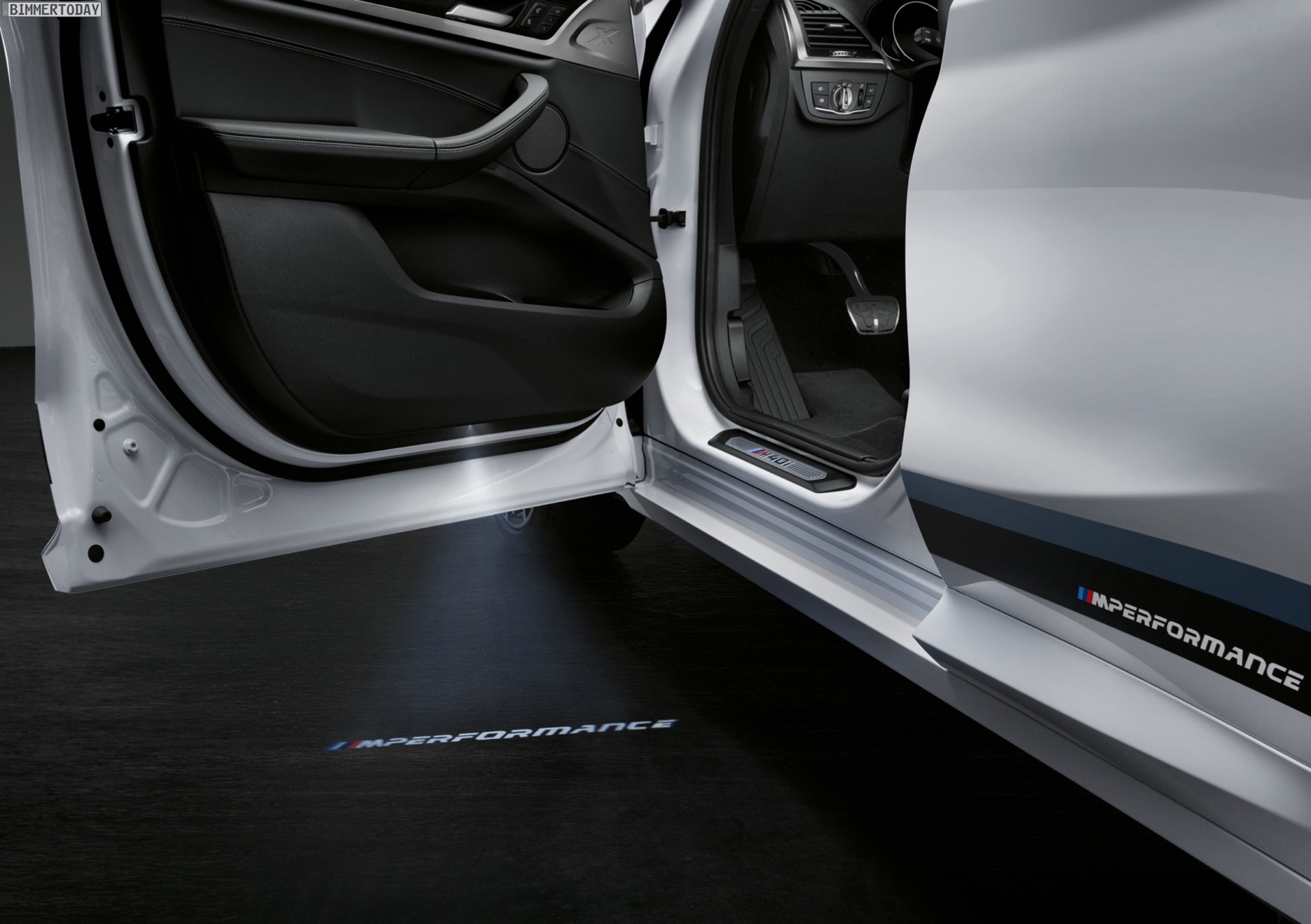 Für die Seitenansicht bietet BMW M Performance neben einer Dekor-Beklebung in Schwarz auch mehrere exklusive Felgen an. So sind für den BMW X2 bis zu 20 Zoll große Leichtmetallräder erhältlich, darunter das oben abgebildete Styling 717 M mit gewalztem Felgenbett und Lackierung in Mattschwarz. Für BMW X3 und X4 stehen unter anderem die 19-Zoll-Felgen Doppelspeiche 698 M in Orbitgrau oder die 21 Zoll großen Schmiederäder Y-Speiche 701 M Bicolor zur Wahl. Ein weiteres Detail zur Individualisierung stellen die Tür-Projektoren dar, die bei geöffneten Türen ein M Performance Logo auf den Asphalt projizieren.