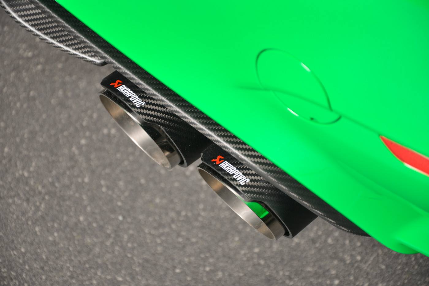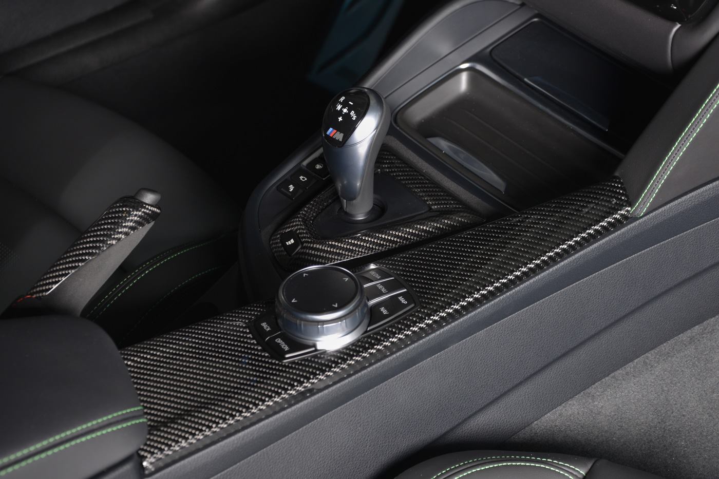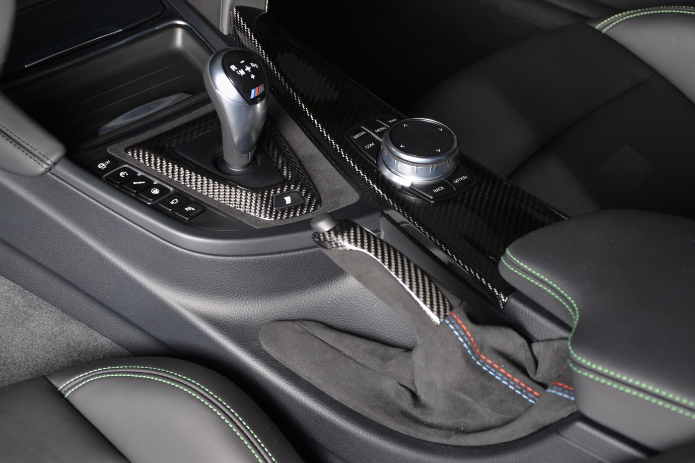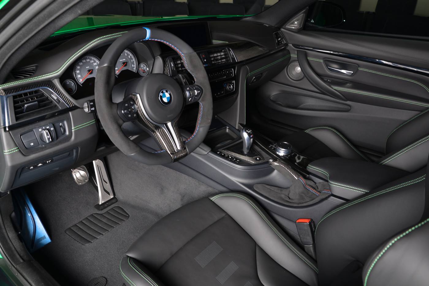 Dank der Competition Paket-Felgen im Design Sternspeiche 666 M, den Carbon-Aufsätzen für die Frontschürze und Außenspiegel und dem großen Carbon-Frontsplitter erhält das serienmäßige Carbon-Dach des BMW M4 Coupé einige optische Gegenspieler auf Augenhöhe. Am Heck trägt der Mittelklasse-Sportler aus Garching einen Diffusor-Einsatz und eine Abgasanlage von Akrapovic, was für die zum Auftritt passende Lautstärke sorgen dürfte. Dass der weitgehend schwarz gehaltene Innenraum von grünen Kontrastnähte aufgelockert wird, ist im Angesicht der Außenlackierung in Signal Green keine Überraschung.