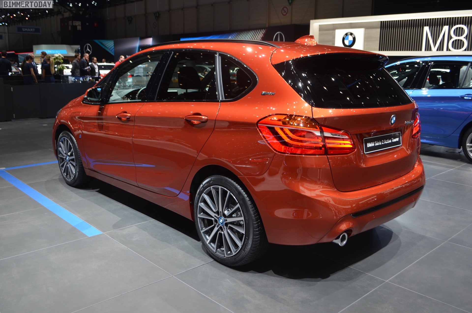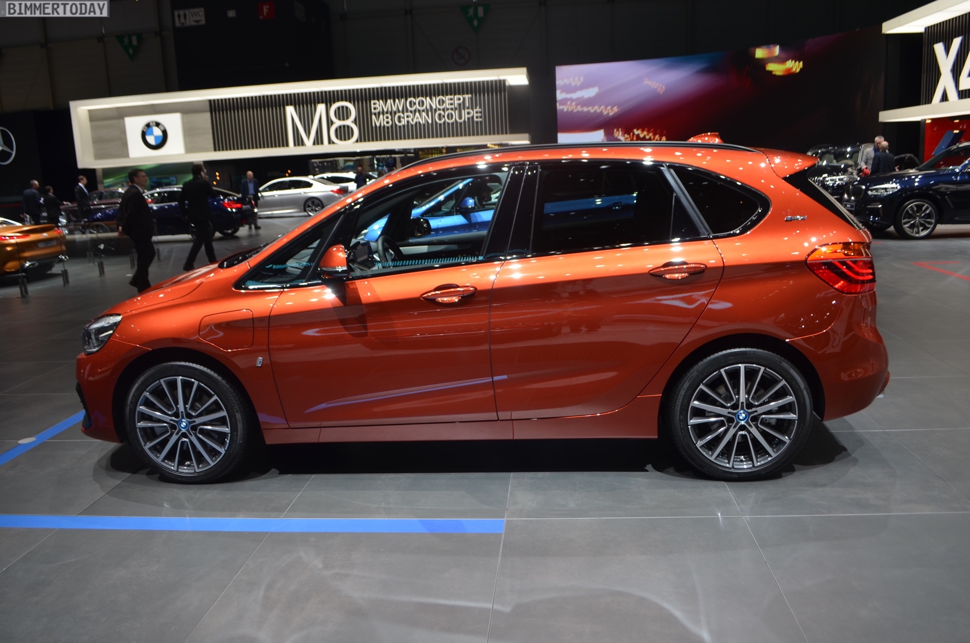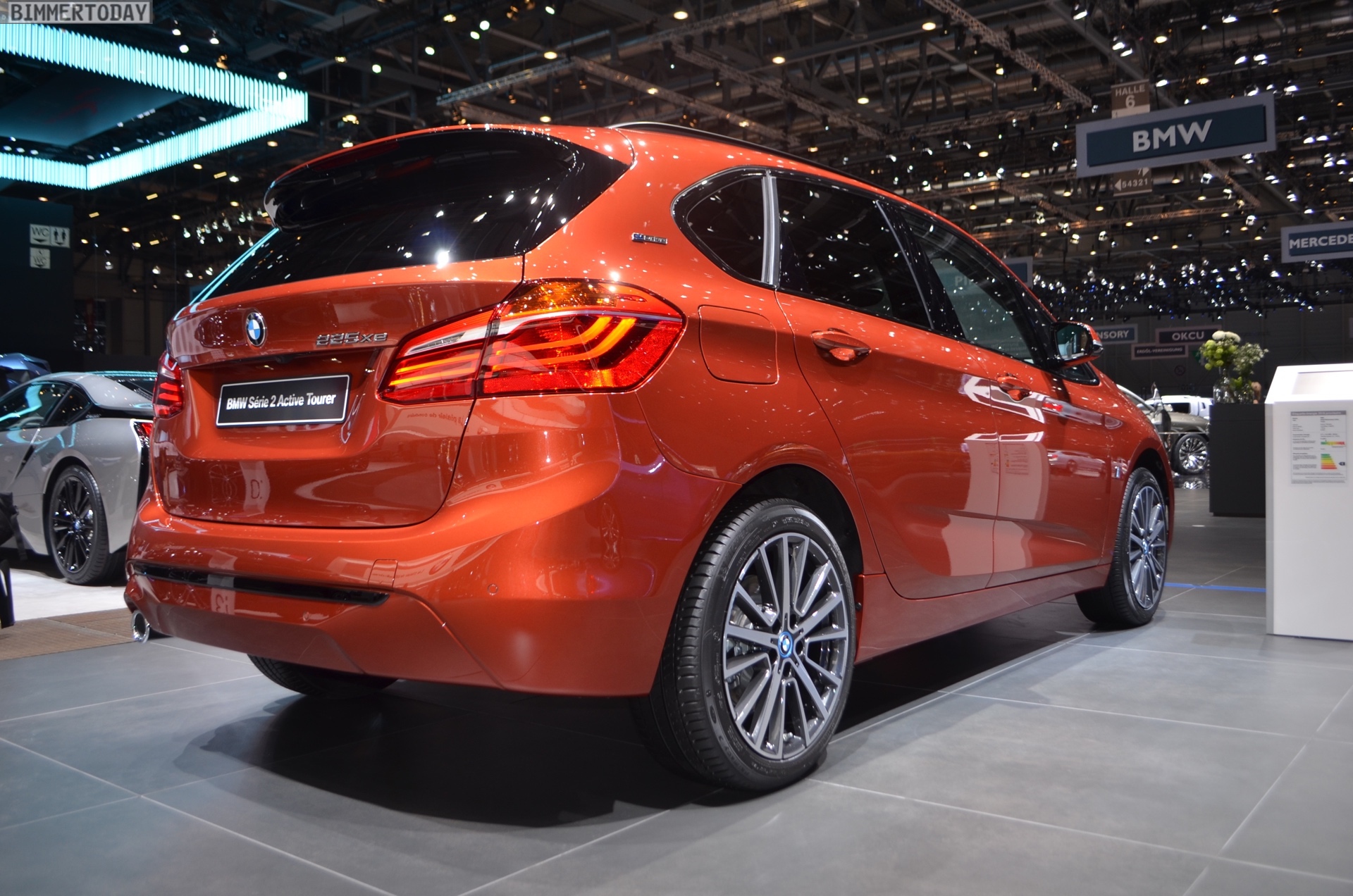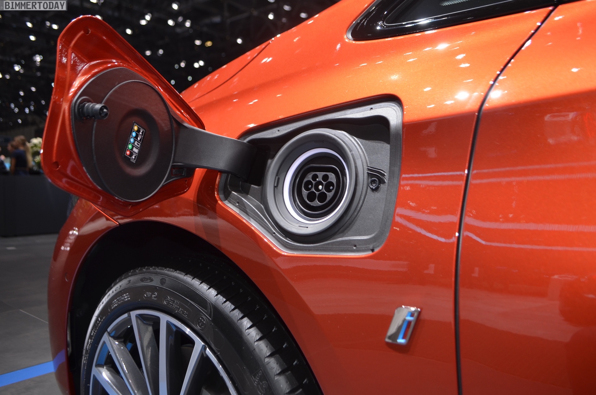 Zur Weltpremiere präsentiert sich der aufgefrischte BMW 2er Active Tourer als 225xe iPerformance mit Plug-in-Hybrid-Antrieb. Die mit dem Facelift neu ins Farb-Programm des Active Tourer aufgenommene Lackierung Sunset Orange wird dadurch mit Hybrid-spezifischen Details wie den blauen Nieren-Streben und blau umrundeten BMW-Logos auf den Felgen kombiniert. Die 18 Zoll großen Leichtmetallräder im Style 512 sind aber prinzipiell auch für alle anderen Antriebe erhältlich.
