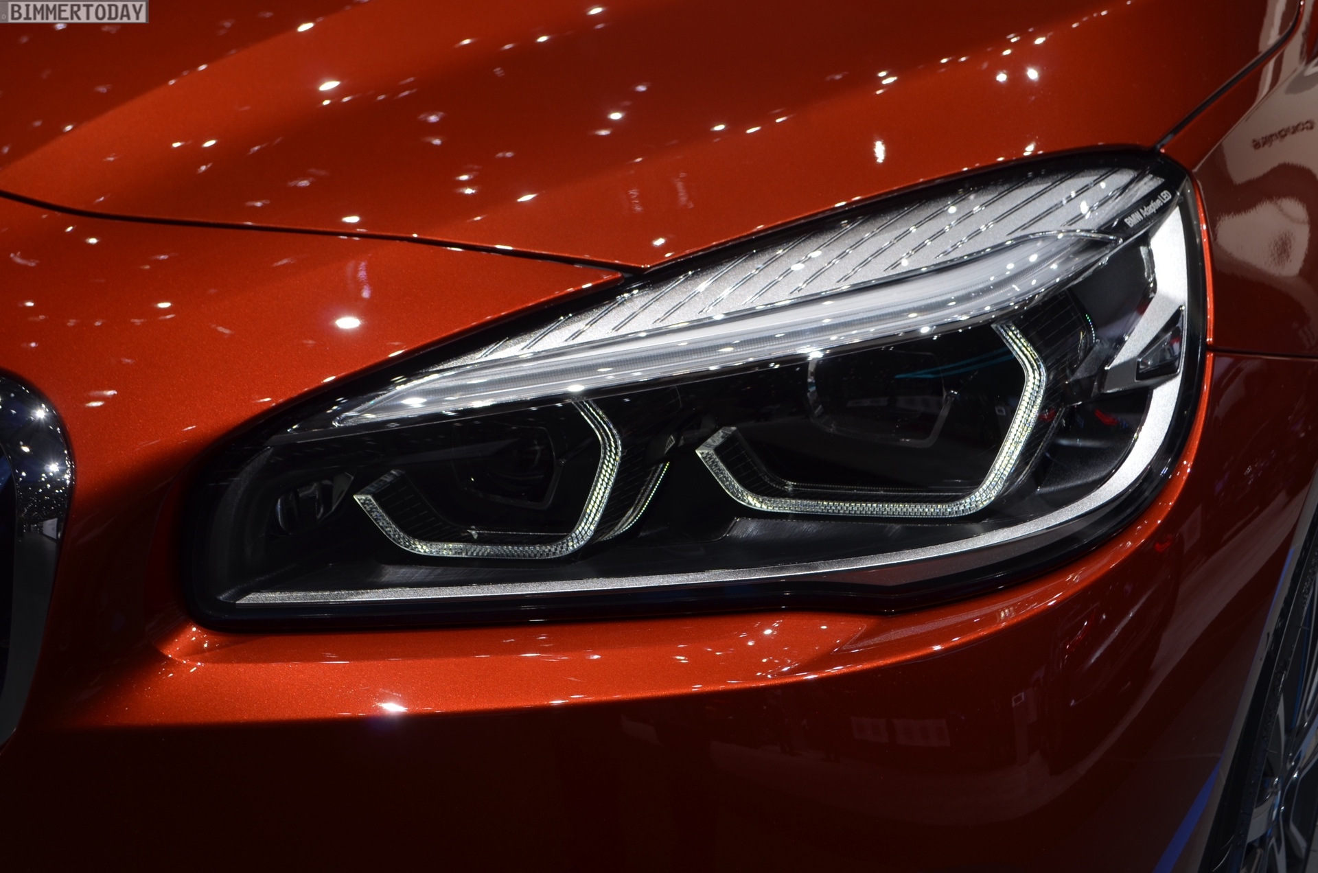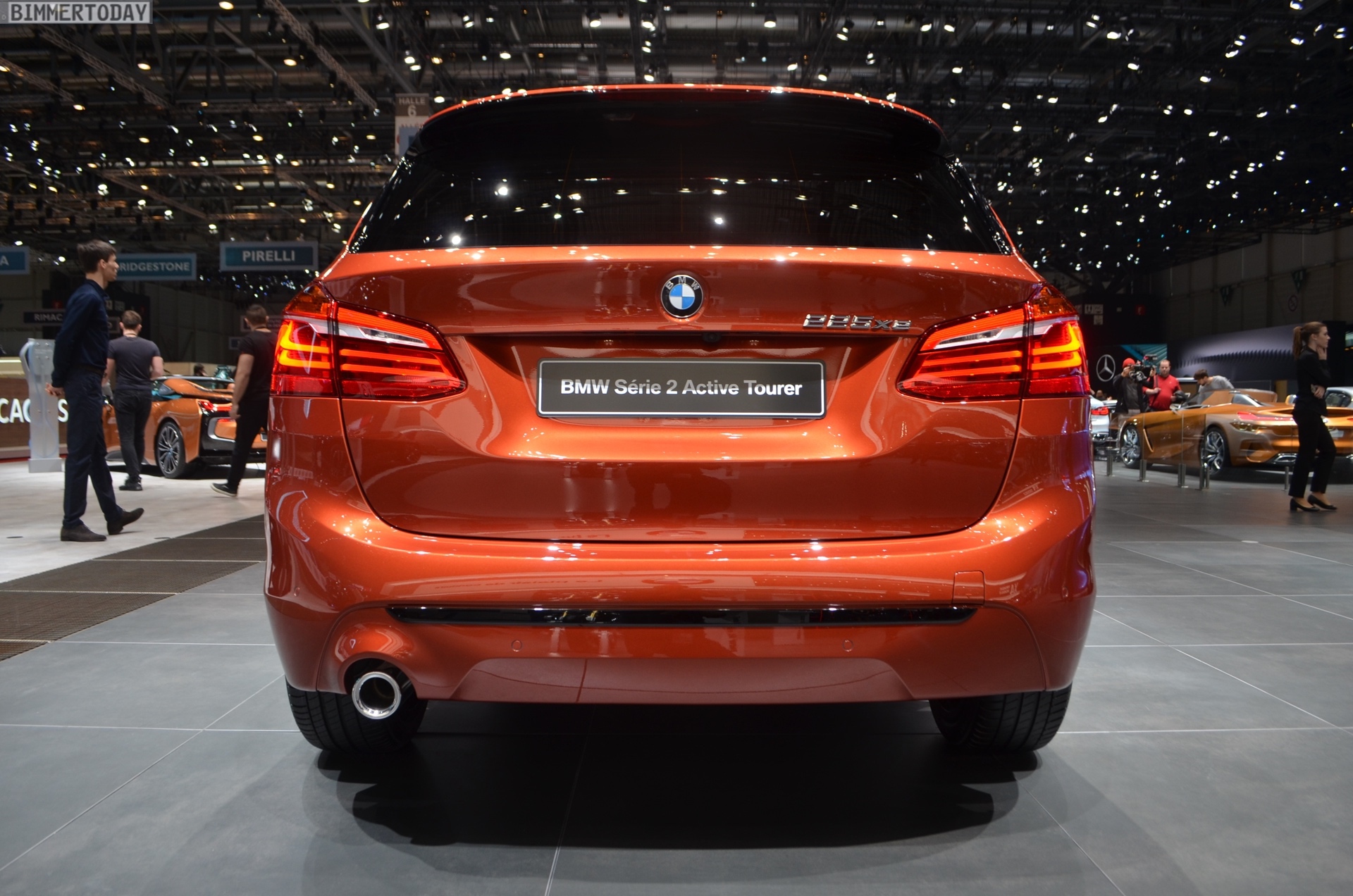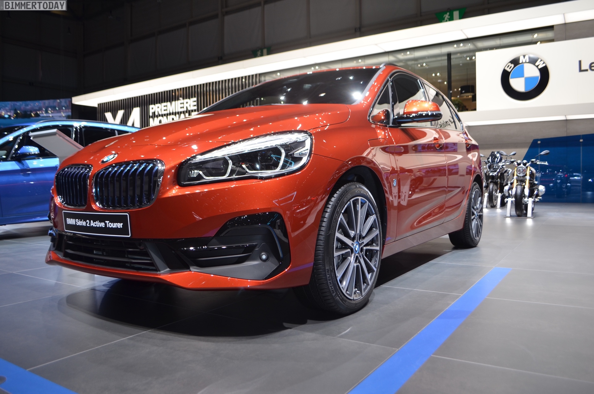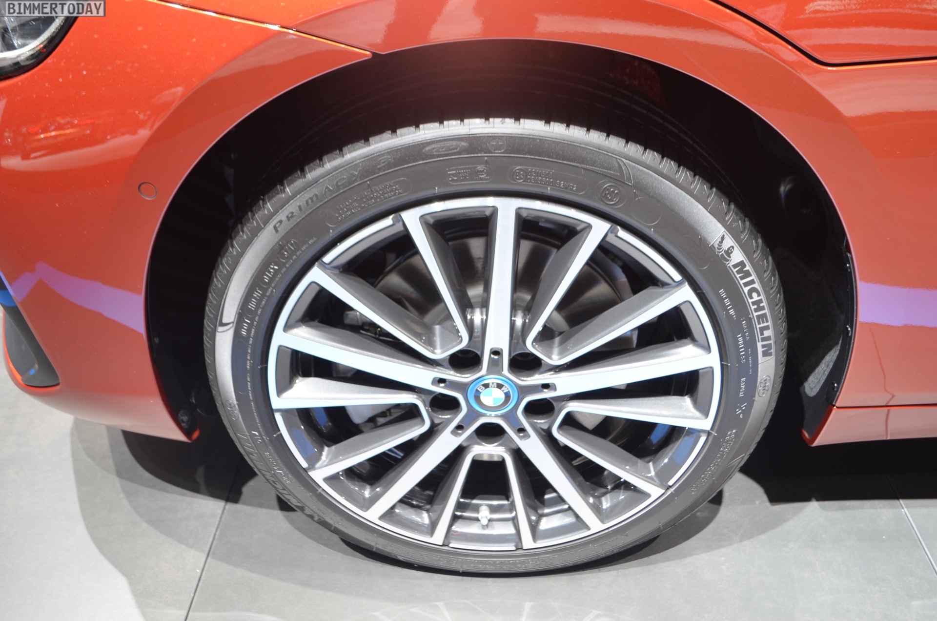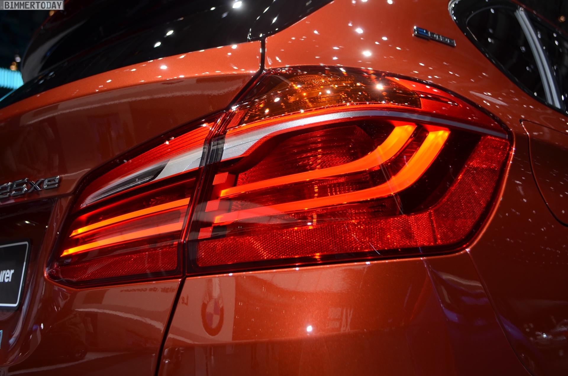 Zur Weltpremiere präsentiert sich der aufgefrischte BMW 2er Active Tourer als 225xe iPerformance mit Plug-in-Hybrid-Antrieb. Die mit dem Facelift neu ins Farb-Programm des Active Tourer aufgenommene Lackierung Sunset Orange wird dadurch mit Hybrid-spezifischen Details wie den blauen Nieren-Streben und blau umrundeten BMW-Logos auf den Felgen kombiniert. Die 18 Zoll großen Leichtmetallräder im Style 512 sind aber prinzipiell auch für alle anderen Antriebe erhältlich.