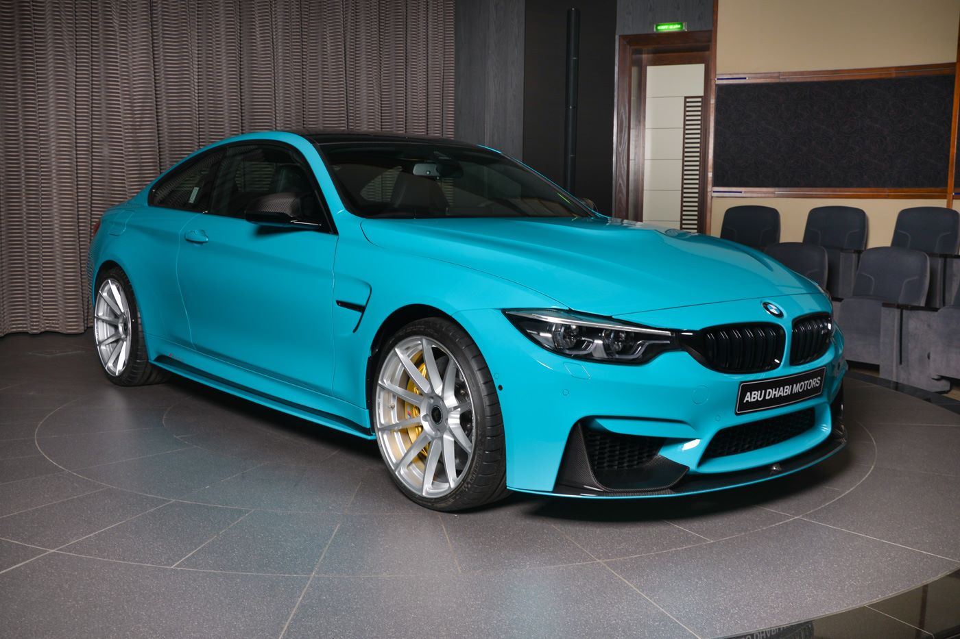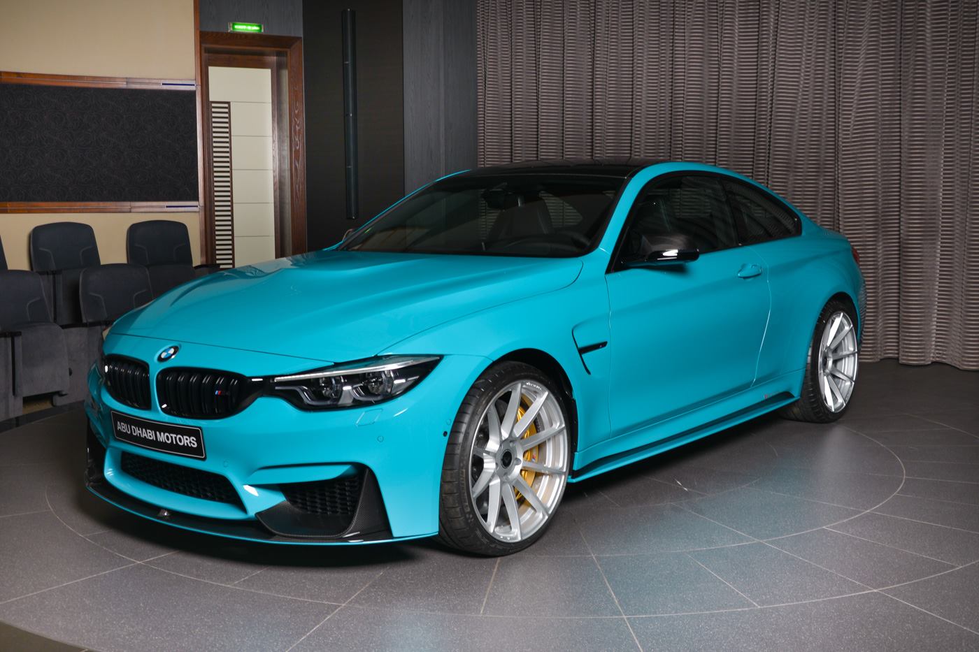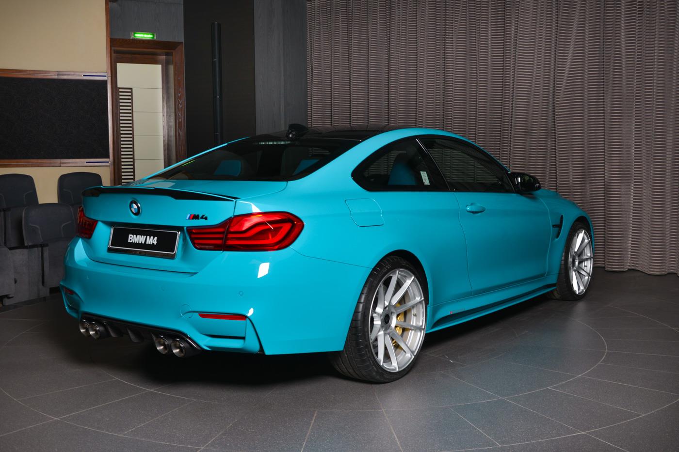 Ganz sicher kein alltäglicher Anblick ist das BMW M4 Coupé mit Individual-Lackierung in Miami Blue, das derzeit im Showroom von BMW Abu Dhabi Motors bestaunt werden kann. Die türkise Sonderfarbe ist an die Farbe des Meeres vor Miami angelehnt und könnte den einen oder anderen Betrachter direkt in Urlaubsstimmung versetzen. Das gezeigte Fahrzeug trägt neben der speziellen Lackierung auch Tuning-Komponenten von BMW M Performance, die es noch spezieller machen.