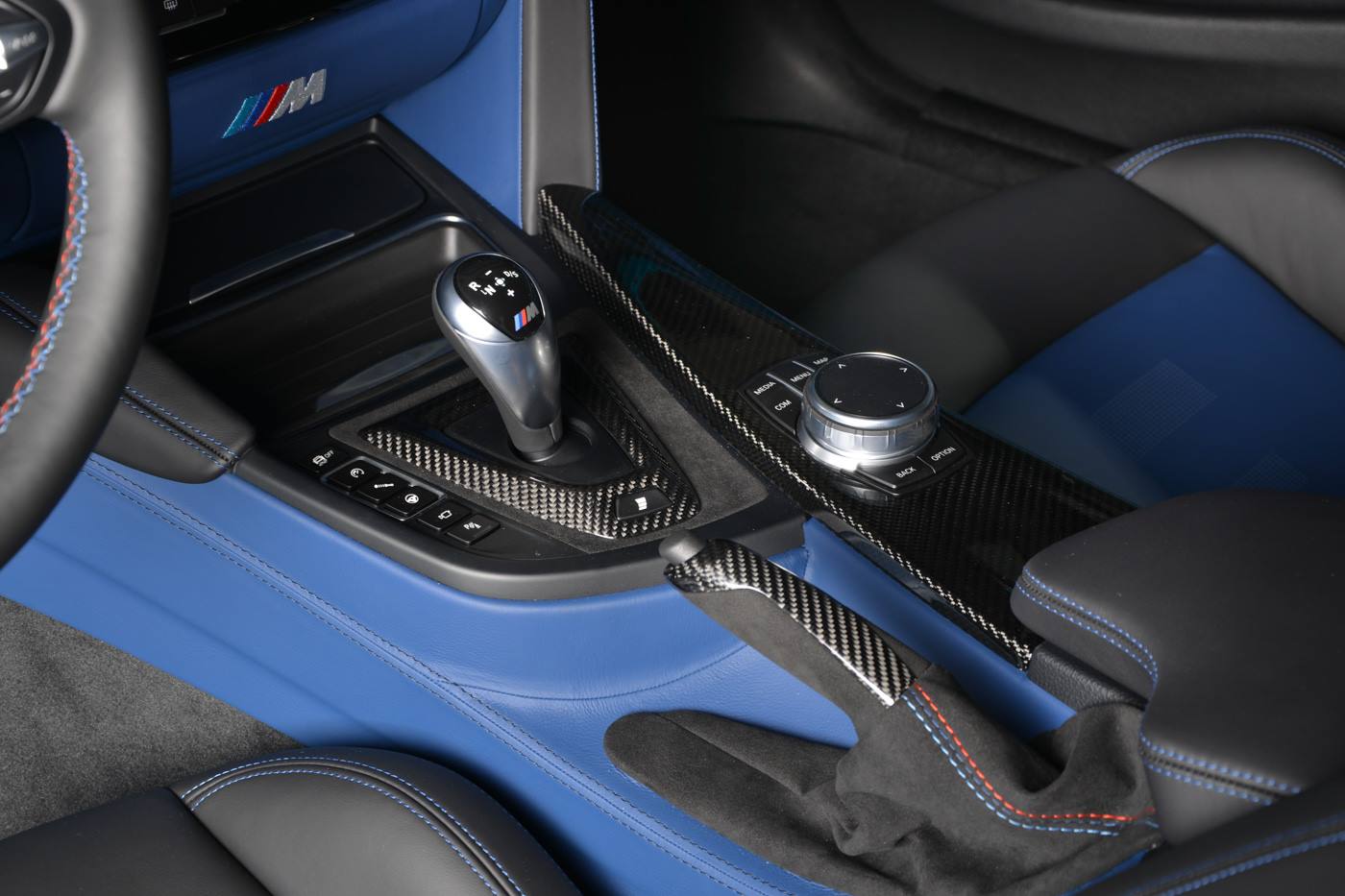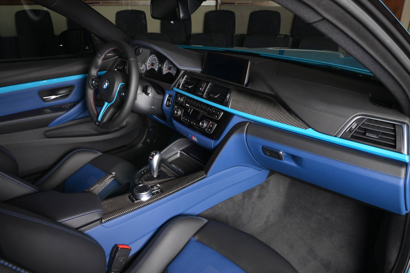 Nicht jedermanns Geschmack dürfte der Innenraum sein, denn die Außenfarbe in Miami Blue wird hier mit einem deutlich dunkleren Blau kombiniert. Die türkise Lackierung der Außenhaut wird in Form von Akzentleisten und der Spange am Lenkrad ebenfalls wieder aufgegriffen. Weitere Dynamik bringen die zahlreichen Carbon-Elemente in den Innenraum, angefangen von den Interieurleisten bis hin zum Zierteil auf dem Handbremshebel.