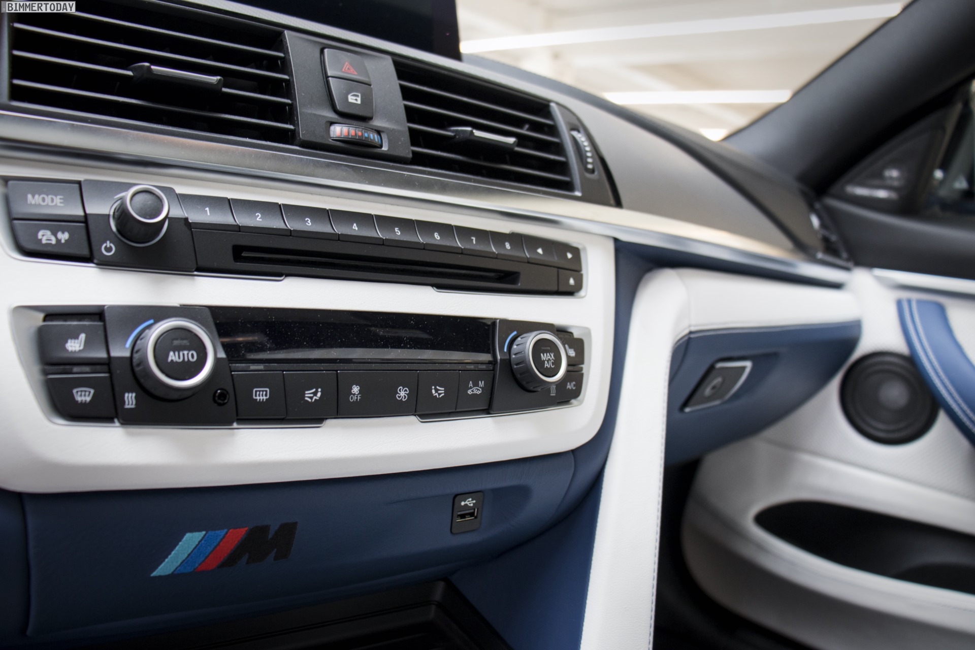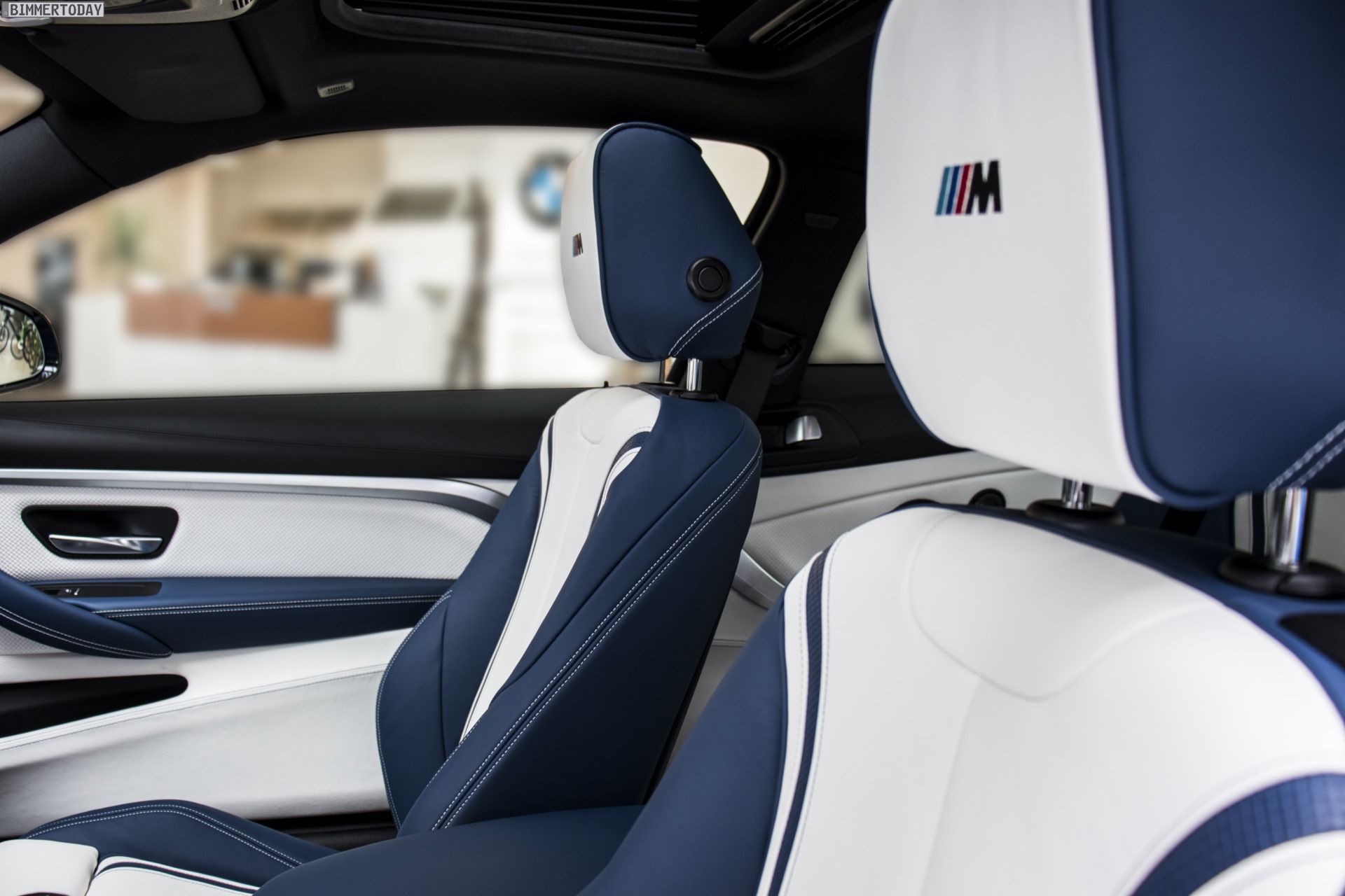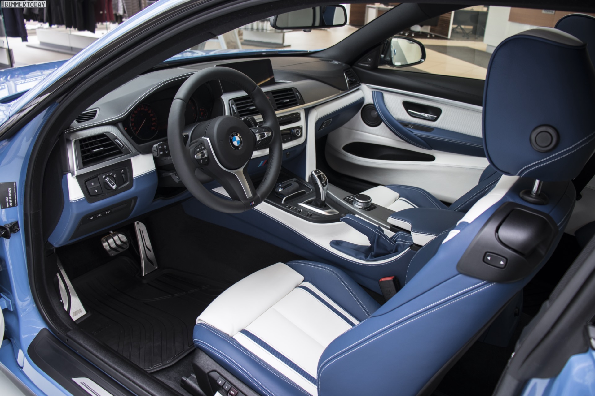 Noch individueller und endgültig einzigartig wird das Mittelklasse-Coupé im Innenraum. Dominierendes Material ist dabei das hochwertige Leder Merino Feinnarbe, das in dunklem Fjordblau und edlem Opalweiß für einen charakteristischen Bicolor-Look sorgt, der sich auch in der Mittelkonsole und rund um die Bedienelemente von Klimaanlage und iDrive fortsetzt. Die Oberseite der Instrumententafel und die Oberkanten der Türen sind mit schwarzem Leder Walknappa bezogen, farbige Kontrastnähte und gestickte M Logos in den Kopfstützen machen das Interieur noch spezieller.