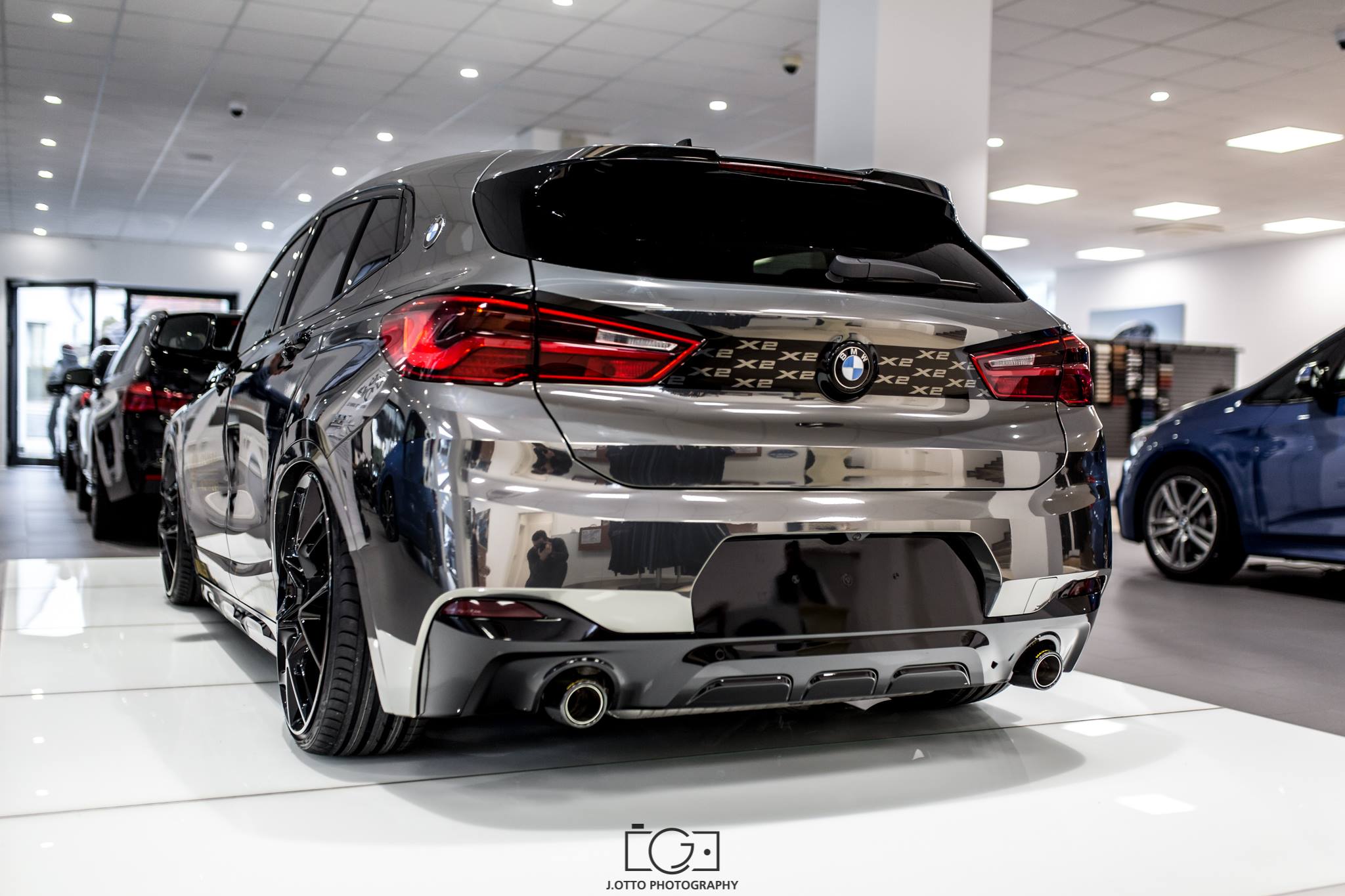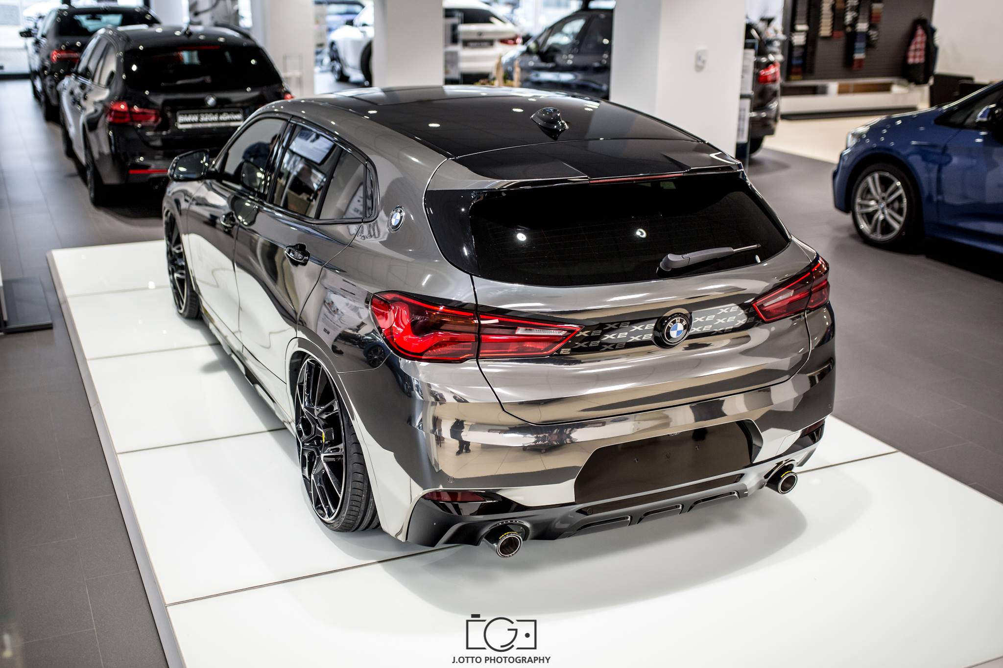 Die dunkel glänzende Chrom-Folierung wird mit einem schwarzen Dach, schwarzen Nieren und Außenspiegeln sowie kleinen X2-Schriftzügen auf der Heckklappe kombiniert. Endrohr-Blenden aus Carbon und diverse kleinere Lack-Arbeiten runden das BMW X2 Tuning von Maxklusiv ab und komplettieren den definitiv unübersehbaren Look.