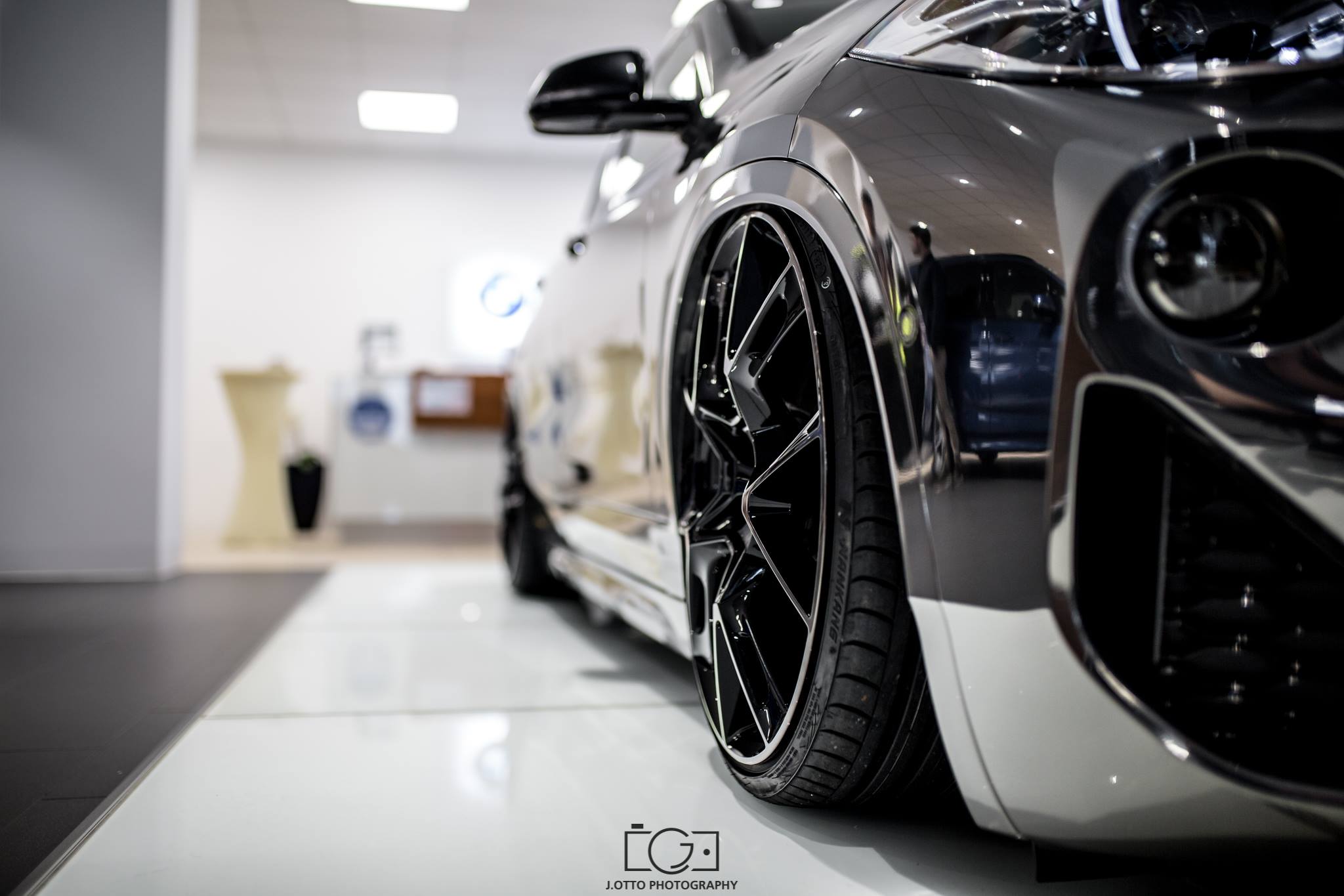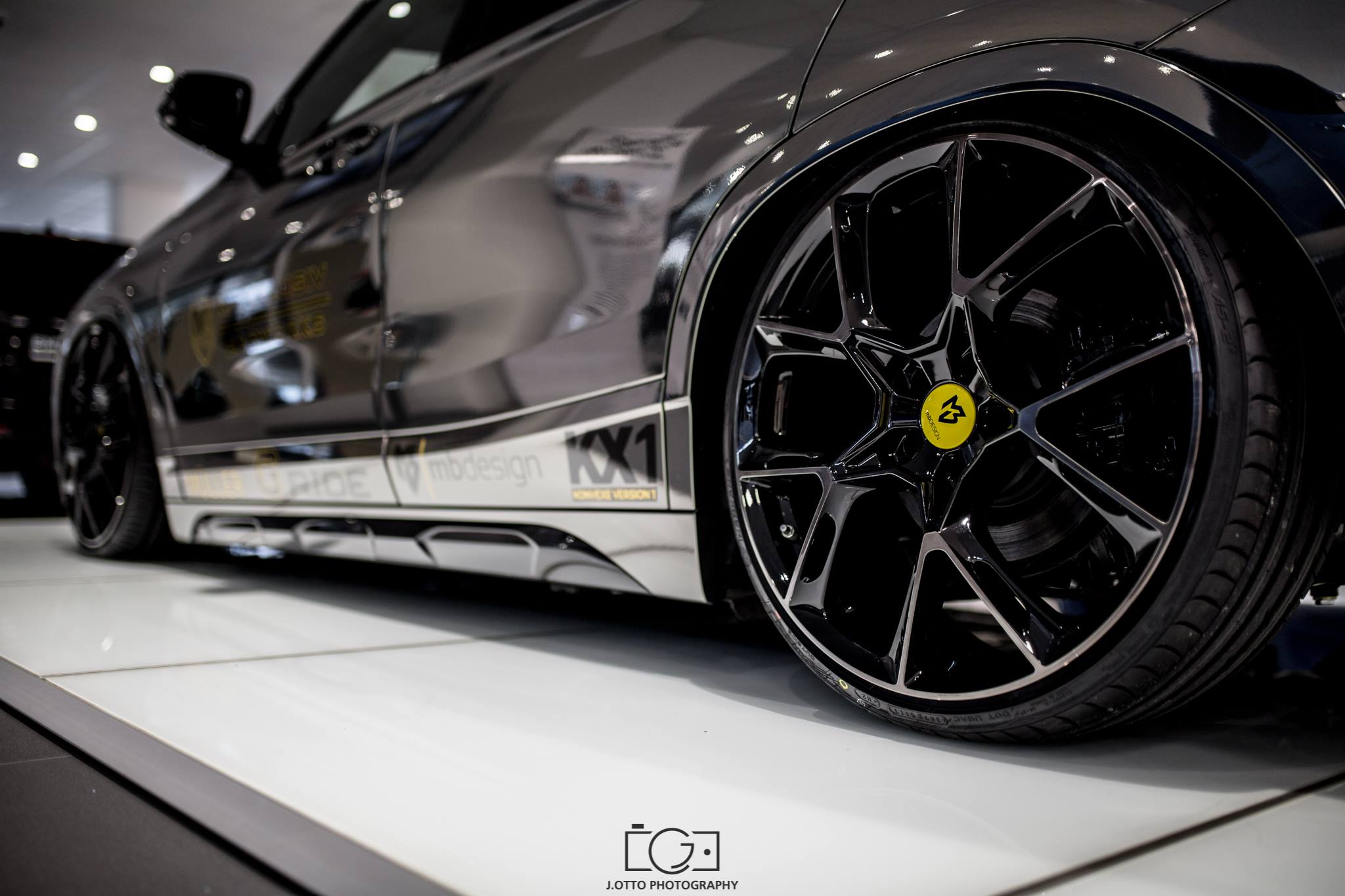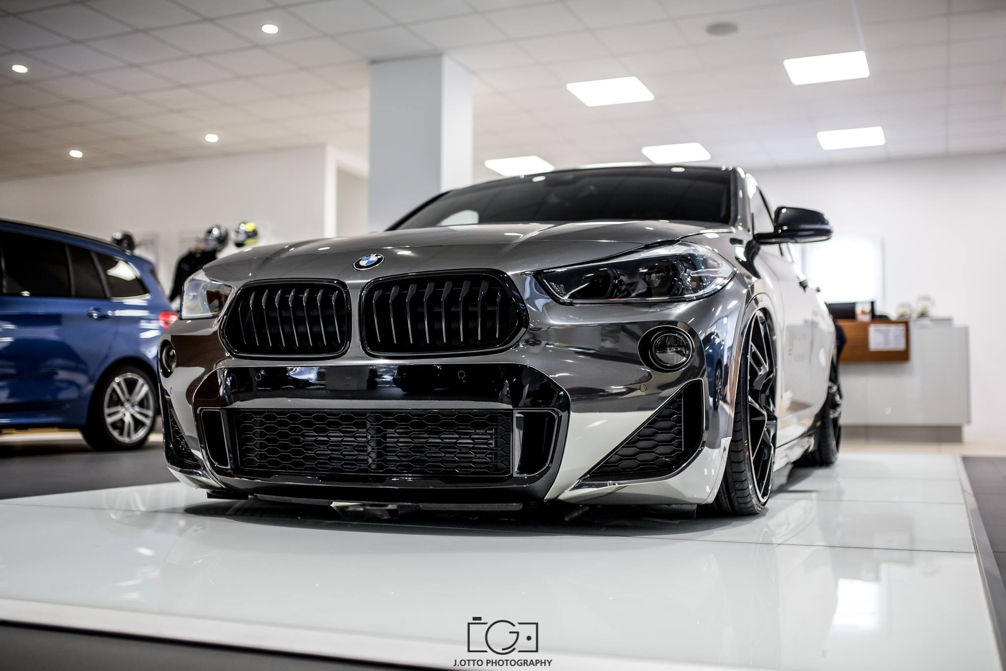 Die enorme Tieferlegung ist dank des G-Ride Luftfahrwerks möglich, das die Bodenfreiheit des BMW X2 im Stand auf ein Minimum reduziert. Auf Knopfdruck bringt das Fahrwerk den Tuning-X2 wieder etwas höher und macht den X2 so auch im Alltag fahrtauglich. Die 21 Zoll großen Leichtmetallräder von mbDesign sind mit einem Klarlack überzogen, der sich eng an die Chrom-glänzende Folierung des Fahrzeugs anlehnt.