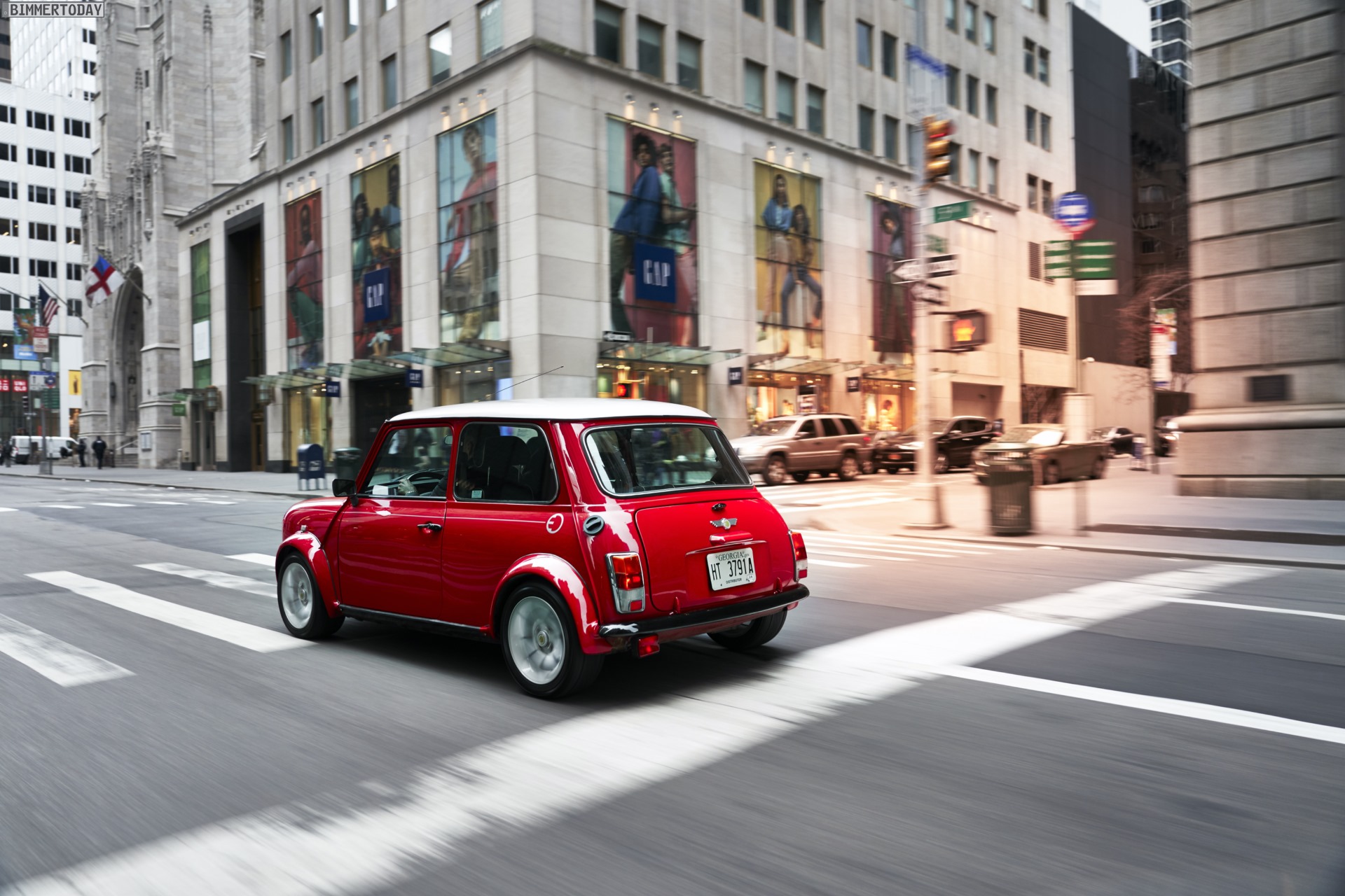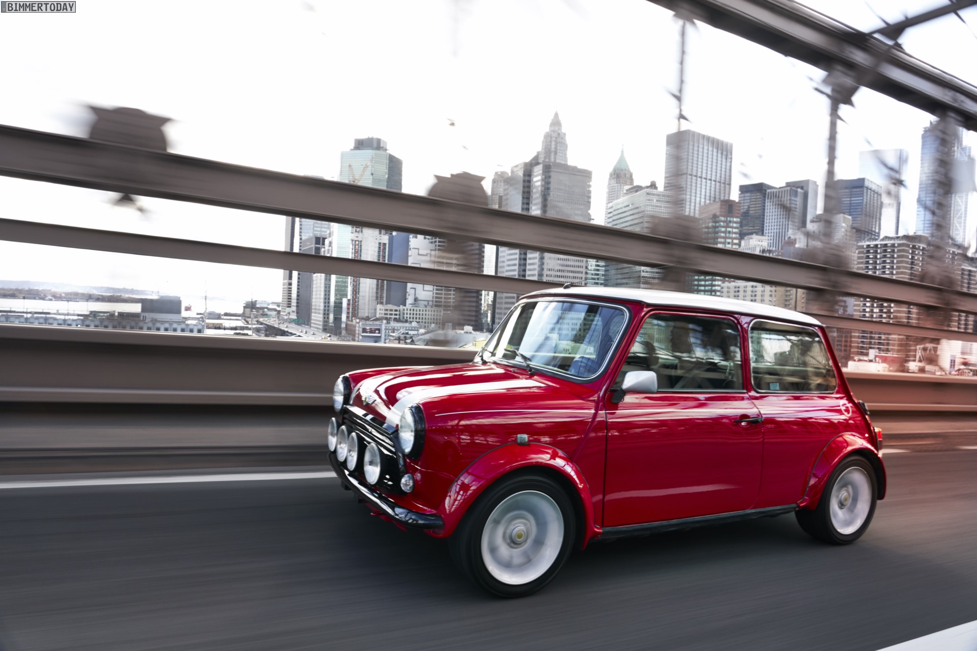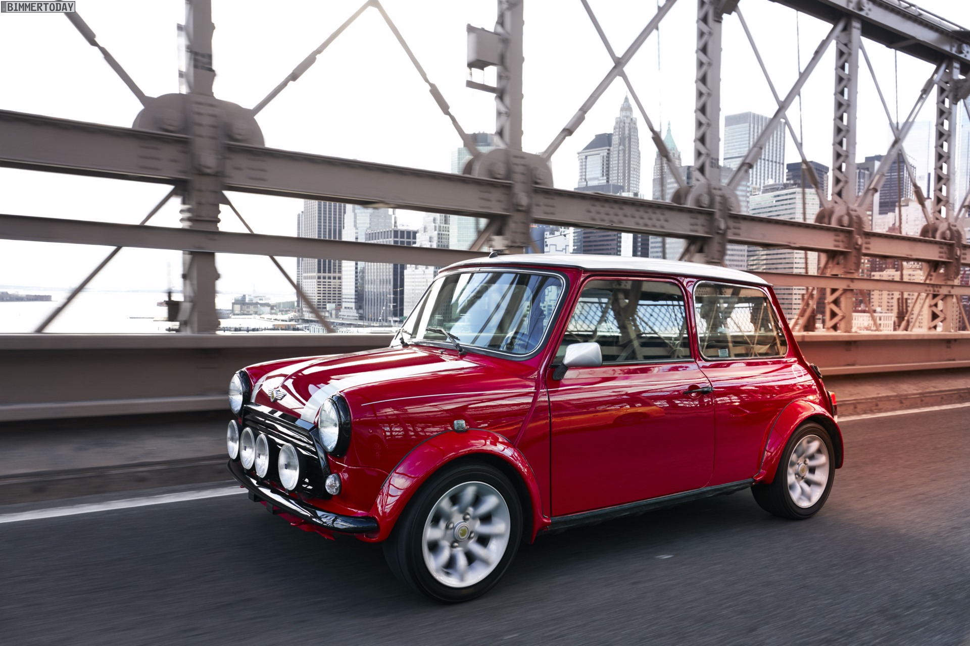 Grundlage für den rot lackierten Klassiker mit dem modernen Antrieb war ein sorgsam restauriertes Exemplar des Mini Cooper. Gelbe MINI Electric Logos auf Radnaben und in den Mini-Logos an Front und Heck sind beinahe der einzige sichtbare Hinweis auf die Sonderrolle des Einzelstücks, das auf der New York Auto Show den einen oder anderen neugierigen Besucher an den Stand der Engländer locken dürfte.