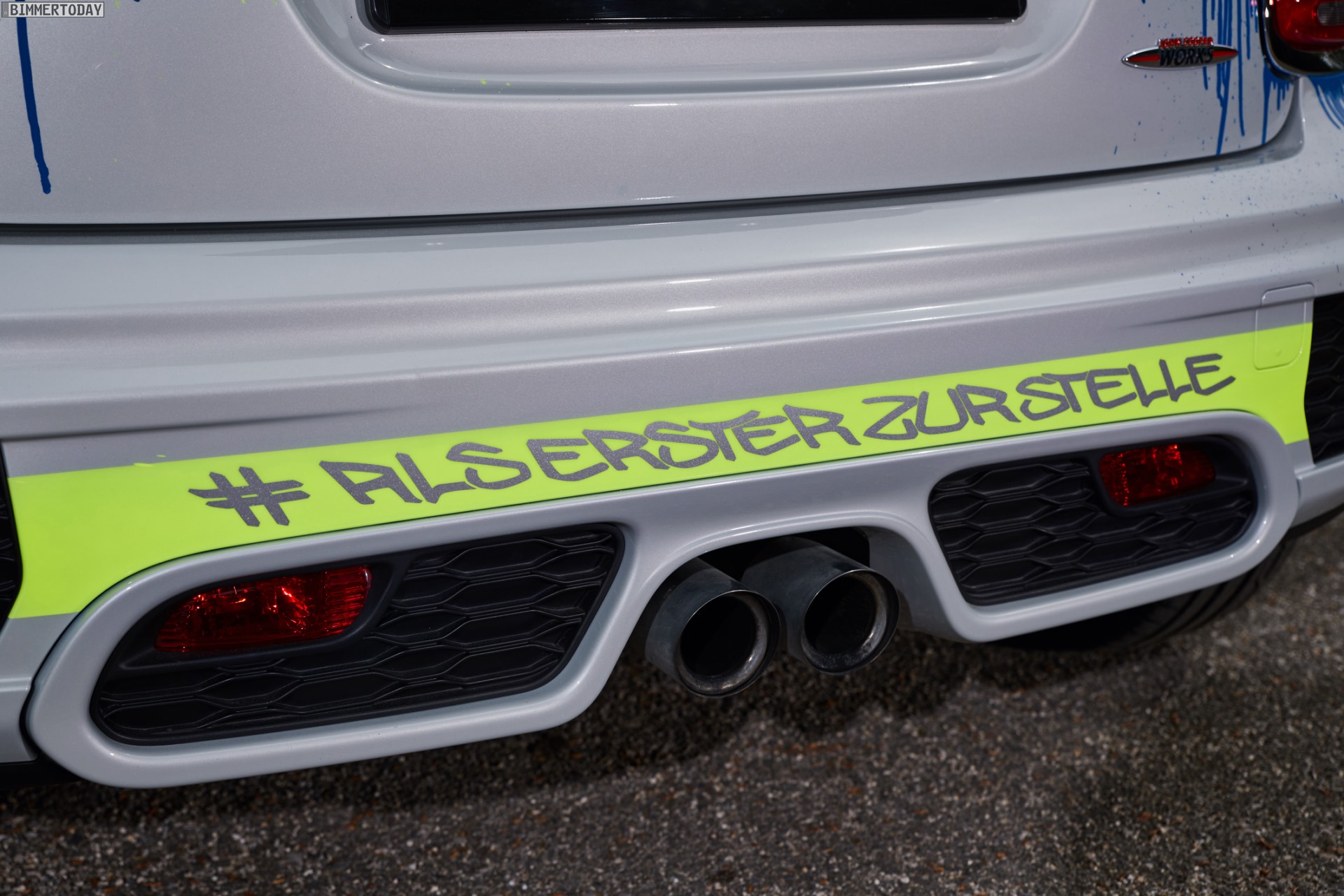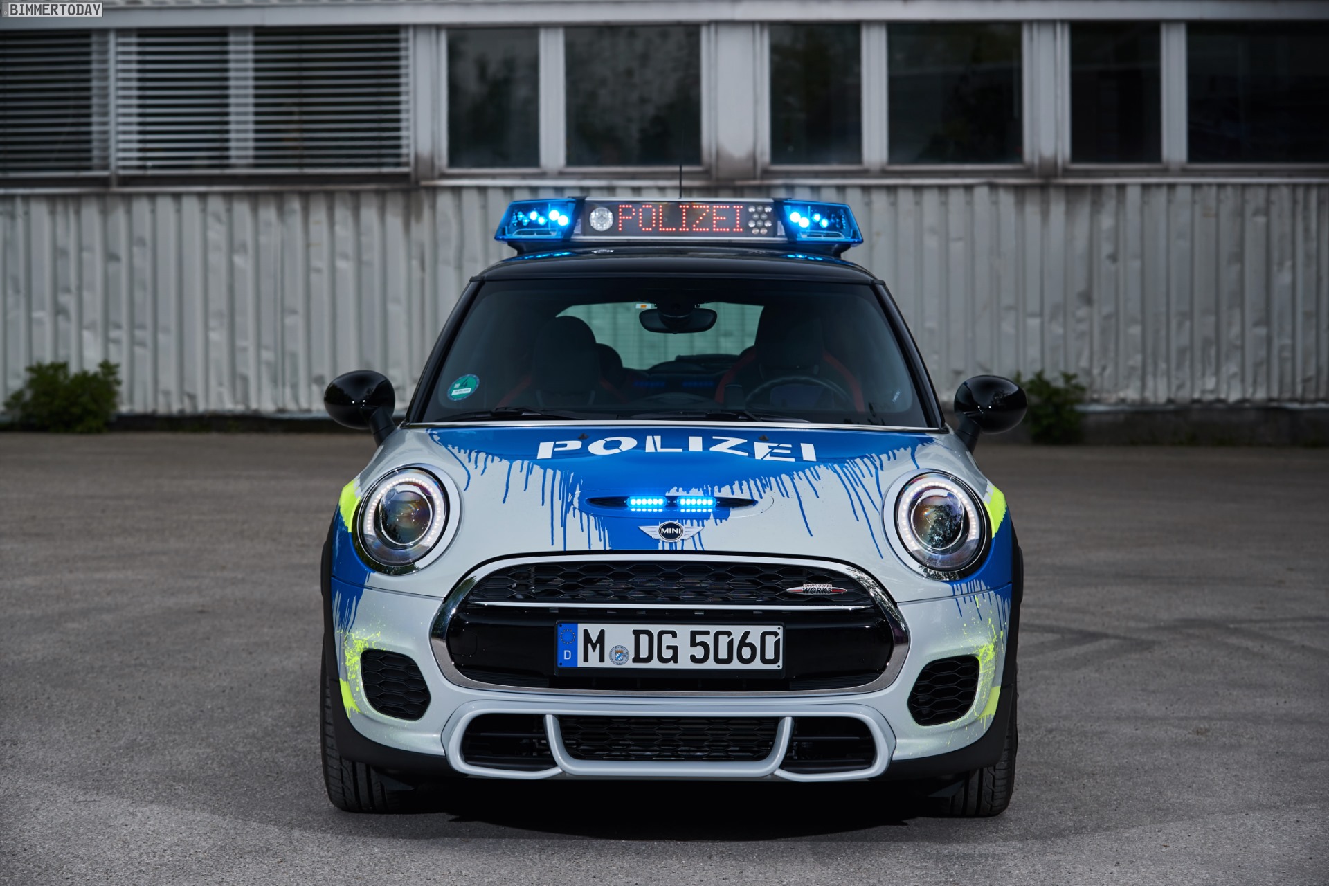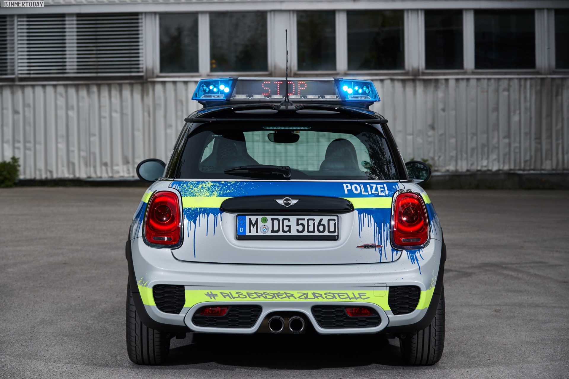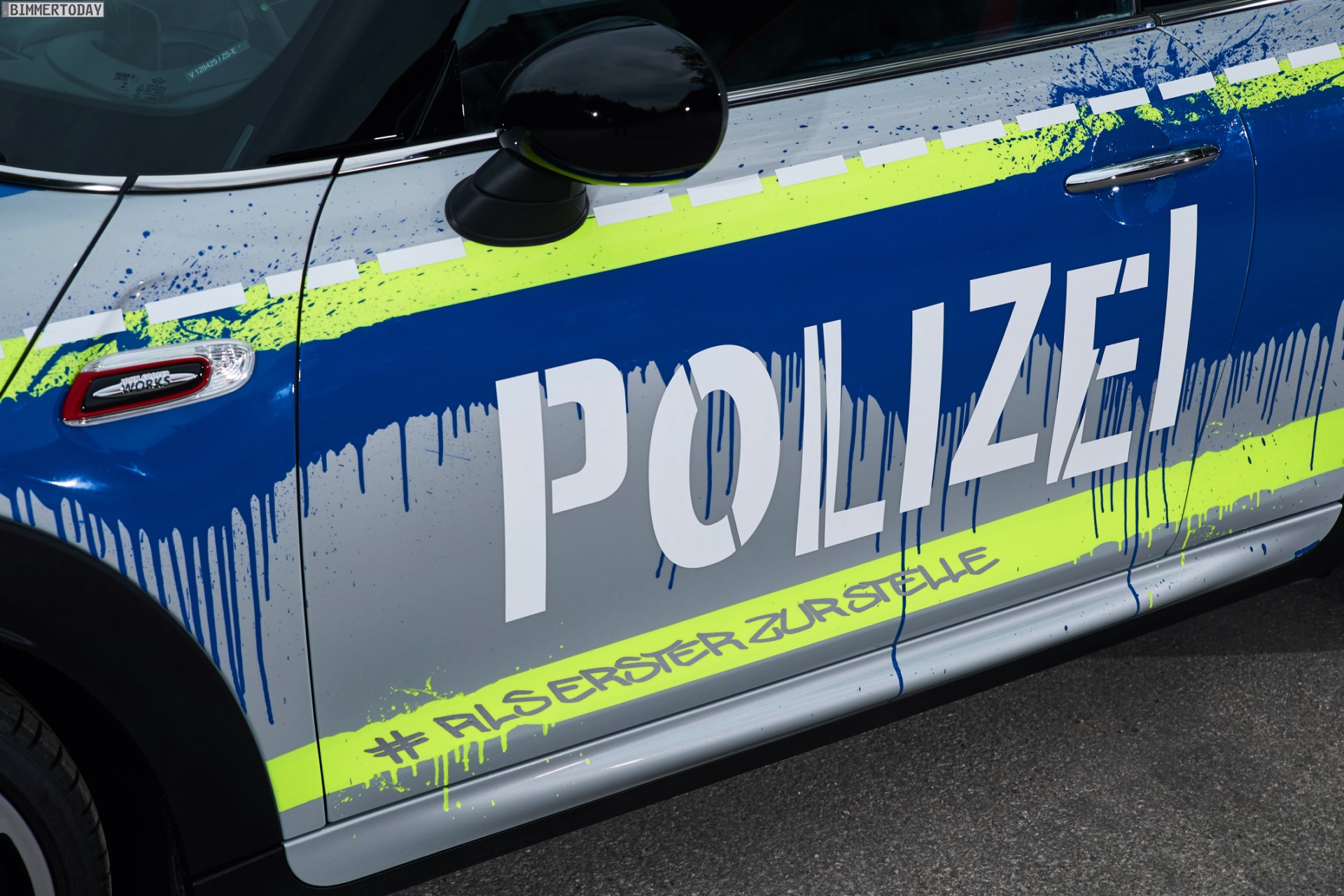 Das Showcar auf Basis des MINI John Cooper Works F56 setzt auf einen modernen Look mit verlaufenen Farben und coolen Schriftzügen, wie ihn die Polizei wohl kaum an einem gewöhnlichen Einsatzfahrzeug nutzen würde. Mit dem Hashtag #alsersterzurstelle wird auf die wichtige Rolle eingegangen, die der Polizei als Helfer in Notlagen aller Art zukommt. Mit dem 231 PS starken Kleinwagen wären die Beamten auf jeden Fall gut gerüstet, um im Stadtverkehr besonders schnell vor Ort zu sein.