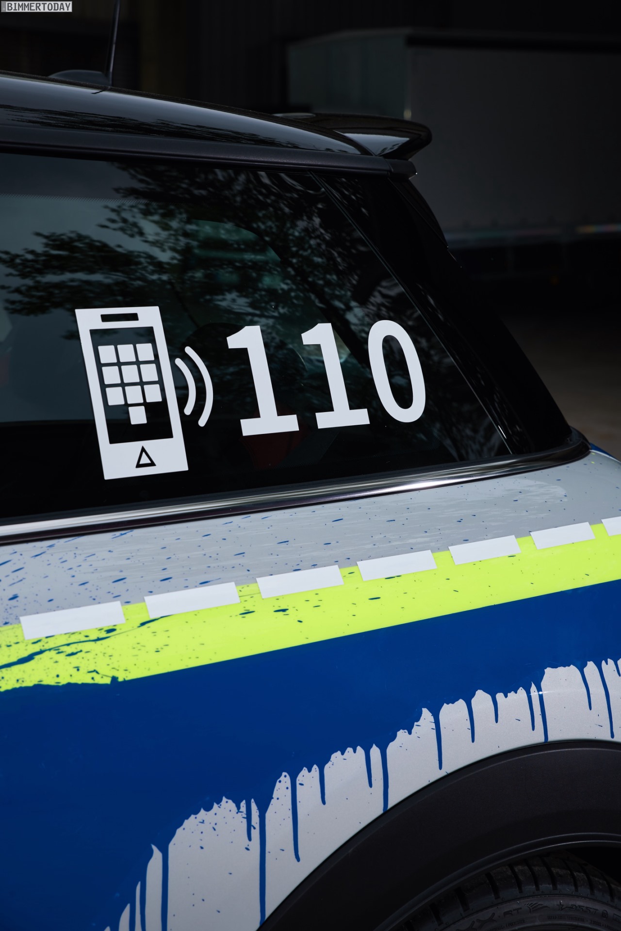 Dass eine Licht-Signalanlage mit LED-Blitzern auf dem Dach und im Lufteinlass der Motorhaube genau wie ein Hinweis auf die Notruf-Nummer 110 nicht fehlen darf, versteht sich von selbst. Neon-Gelbe Akzente runden den interessanten Auftritt ab – und könnten auch Privatleute zu einer Umgestaltung ihres MINI inspirieren, denn vom Look des Basisfahrzeugs mit silberner Lackierung und schwarzem Dach kann man sich auf vergleichbare Art auch ohne Polizei-Schriftzüge denkbar weit entfernen.