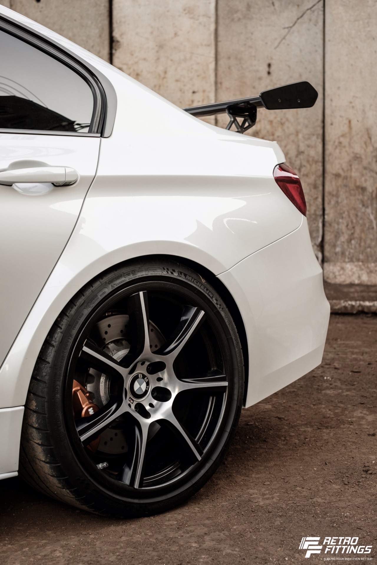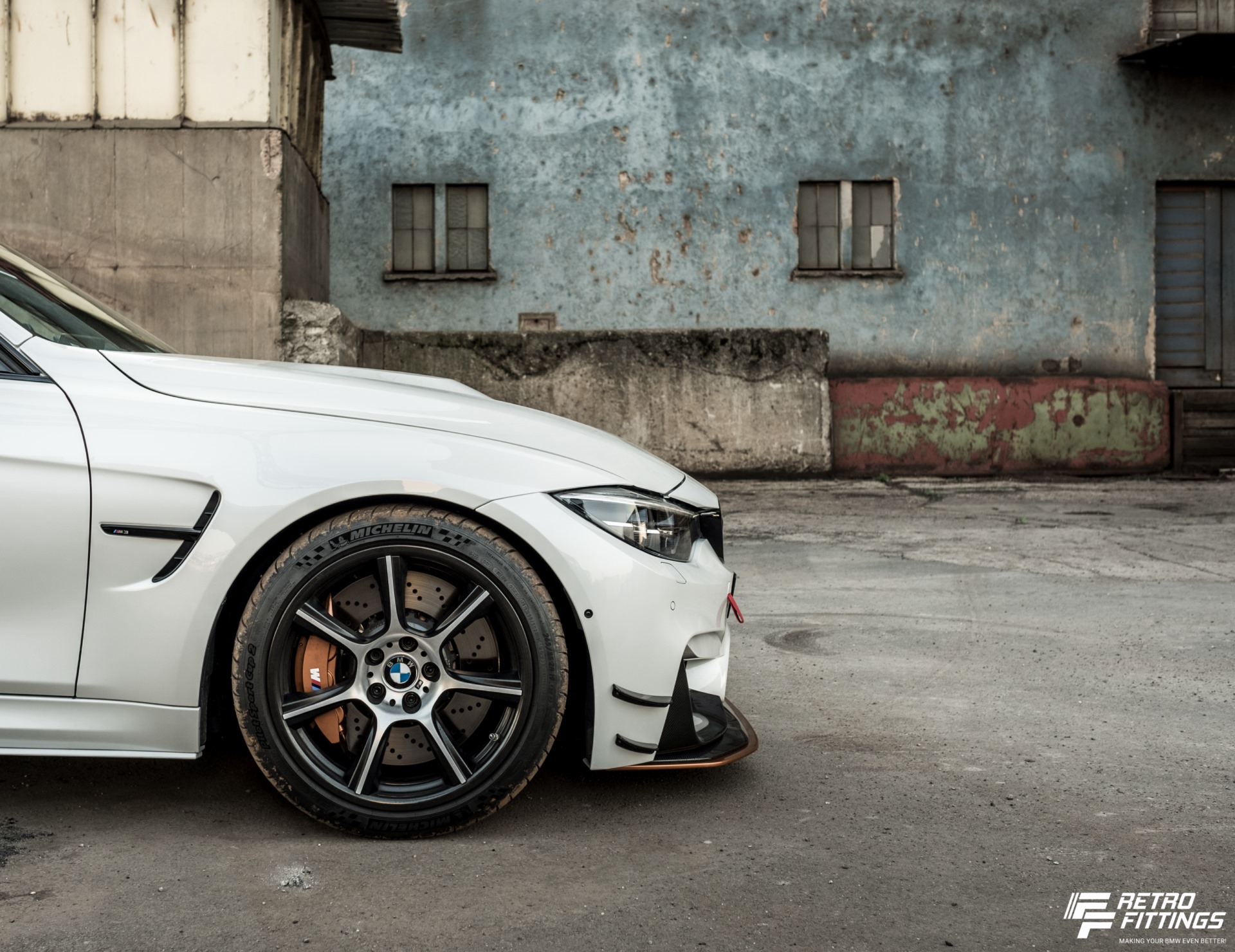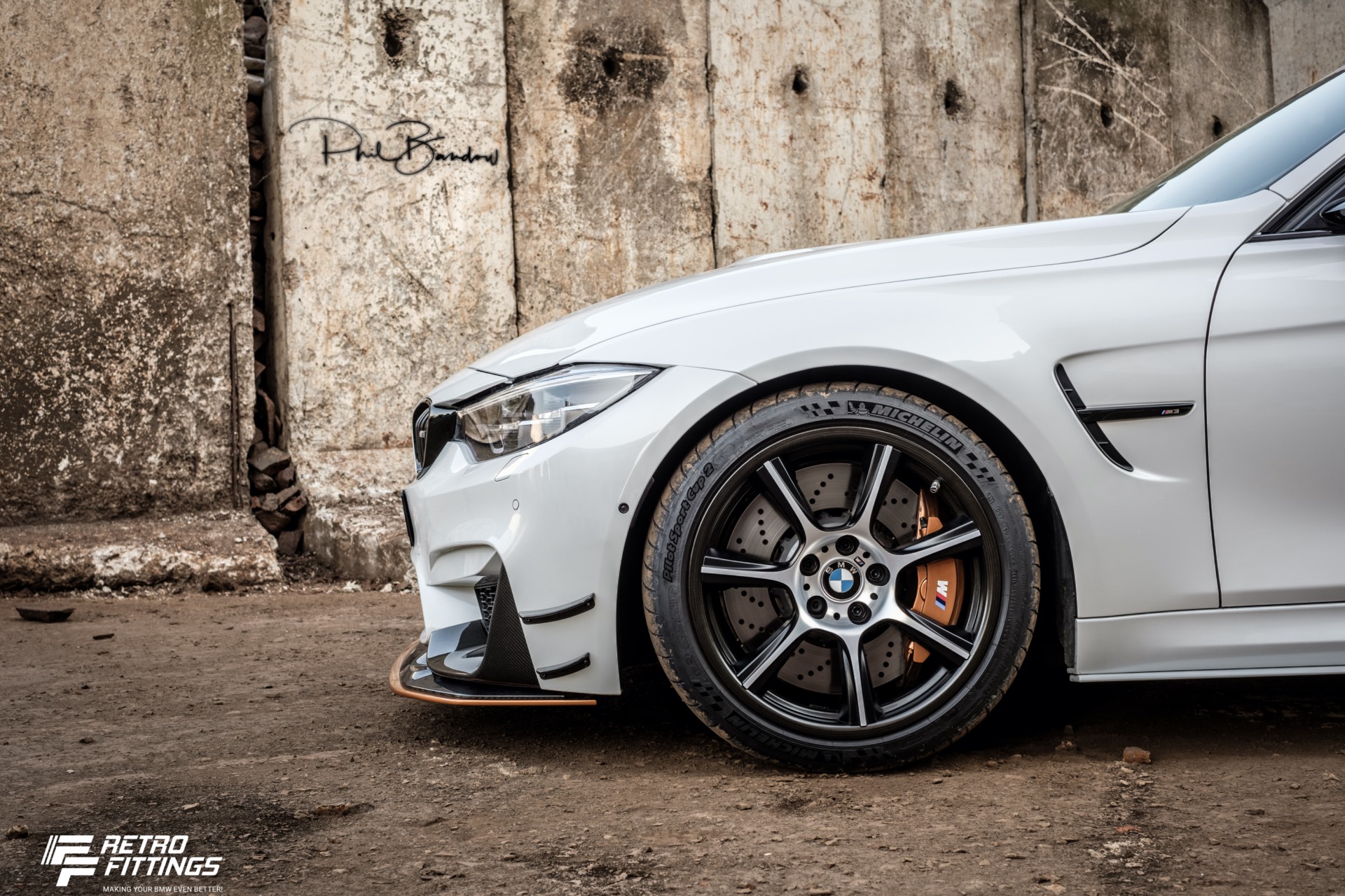 An der Vorderachse kommt eine Brembo 6-Kolben-Bremsanlage mit 400 Millimeter großen Scheiben zum Einsatz, wie sie normalerweise im M5 der Generation F10 verbaut wurde. An der Hinterachse genügen dem BMW M3 GTS nach Überzeugung seiner Erbauer die M Performance Sportbremsbeläge und serienmäßige Bremsscheiben, um in jeder Situation genügend Bremskraft aufbringen zu können. Fischer Stahlflex-Leitungen, ATE Bremsflüssigkeit vom Typ 200 Dot4 und die passend zu den Aerodynamik-Elementen in Acid Orange lackierten Bremssättel runden die überarbeitete Bremsanlage ab.