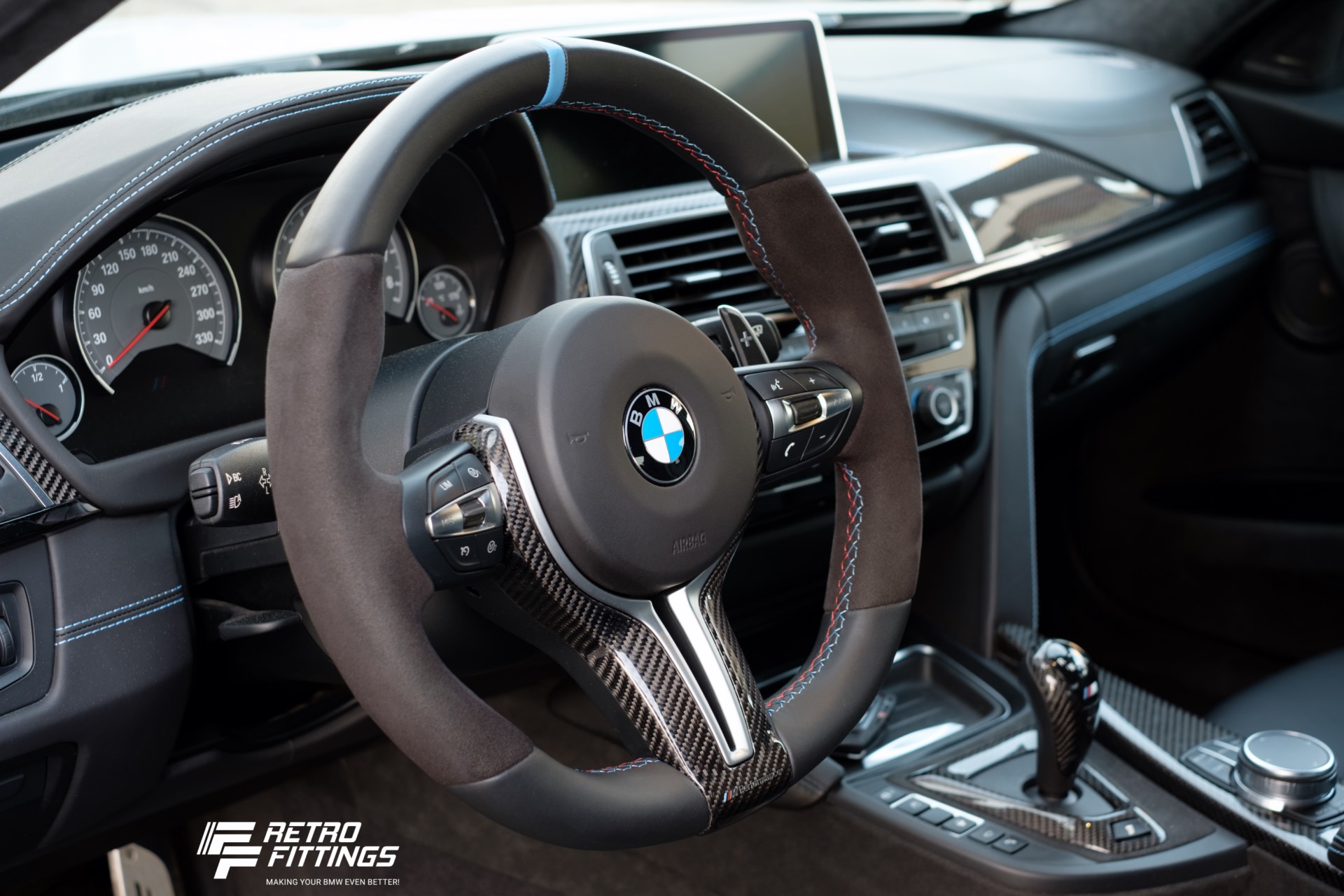 Erleben lässt sich das Resultat des aufwändigen Umbaus im ebenfalls ordentlich nachgeschärften Cockpit. Im Innenraum des BMW M3 GTS stammen unter anderem Lenkrad, Gangwahlschalter, Handbremsgriff und Einstiegsleisten aus dem Programm von BMW M Performance, hinzu kommen umfangreiche Sattlerarbeiten zur individuellen Verkleidung von Dachhimmel, Mittelkonsole sowie Säulen- und Tür-Verkleidungen mit hochwertigem Alcantara. Den Weg zur nächsten Rennstrecke weist das aktuelle BMW Navigationssystem Professional der Generation NBT Evo ID6 auf einem 10,25-Zoll-Display, das von FF Retrofittings in den 2015er M3 integriert wurde.