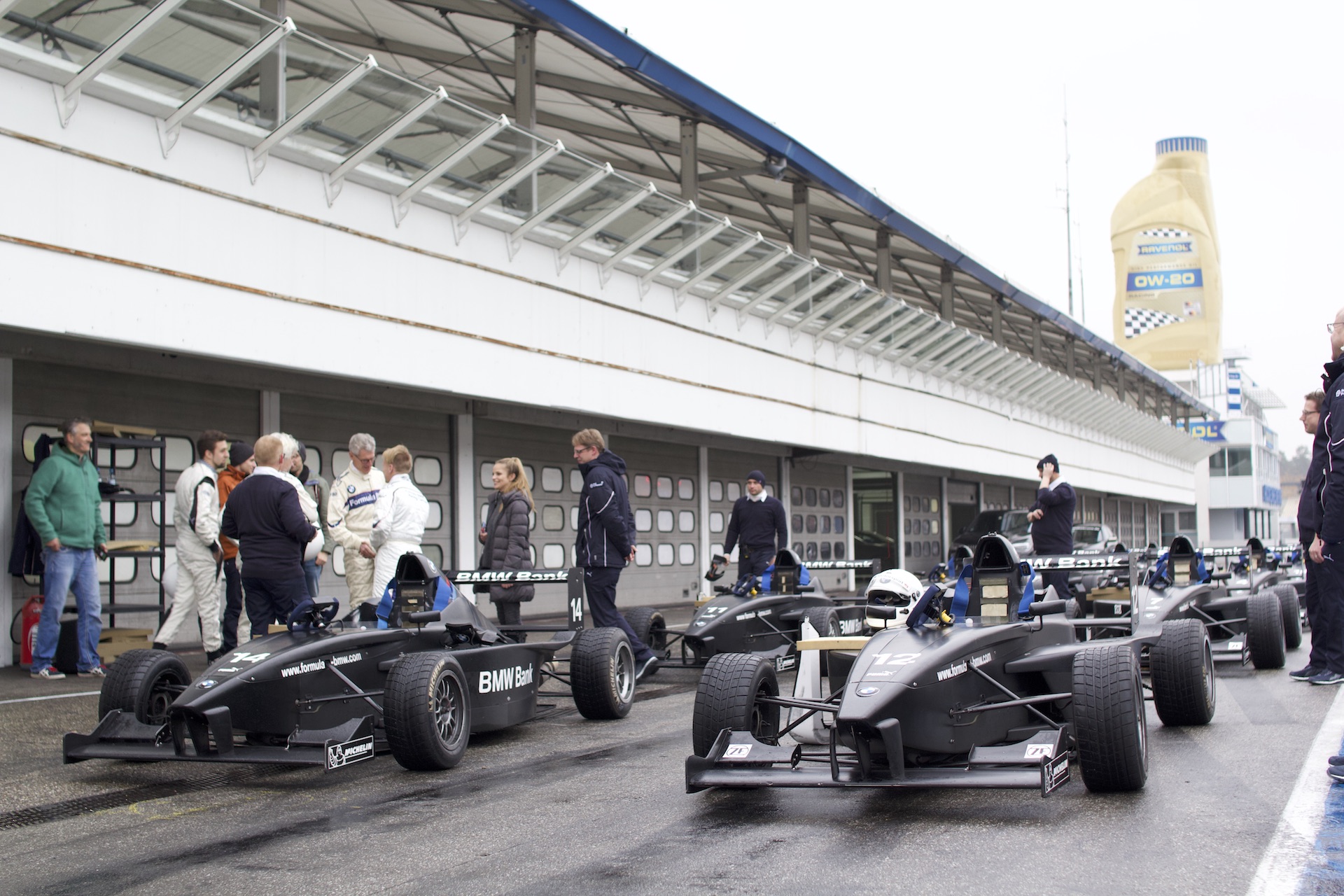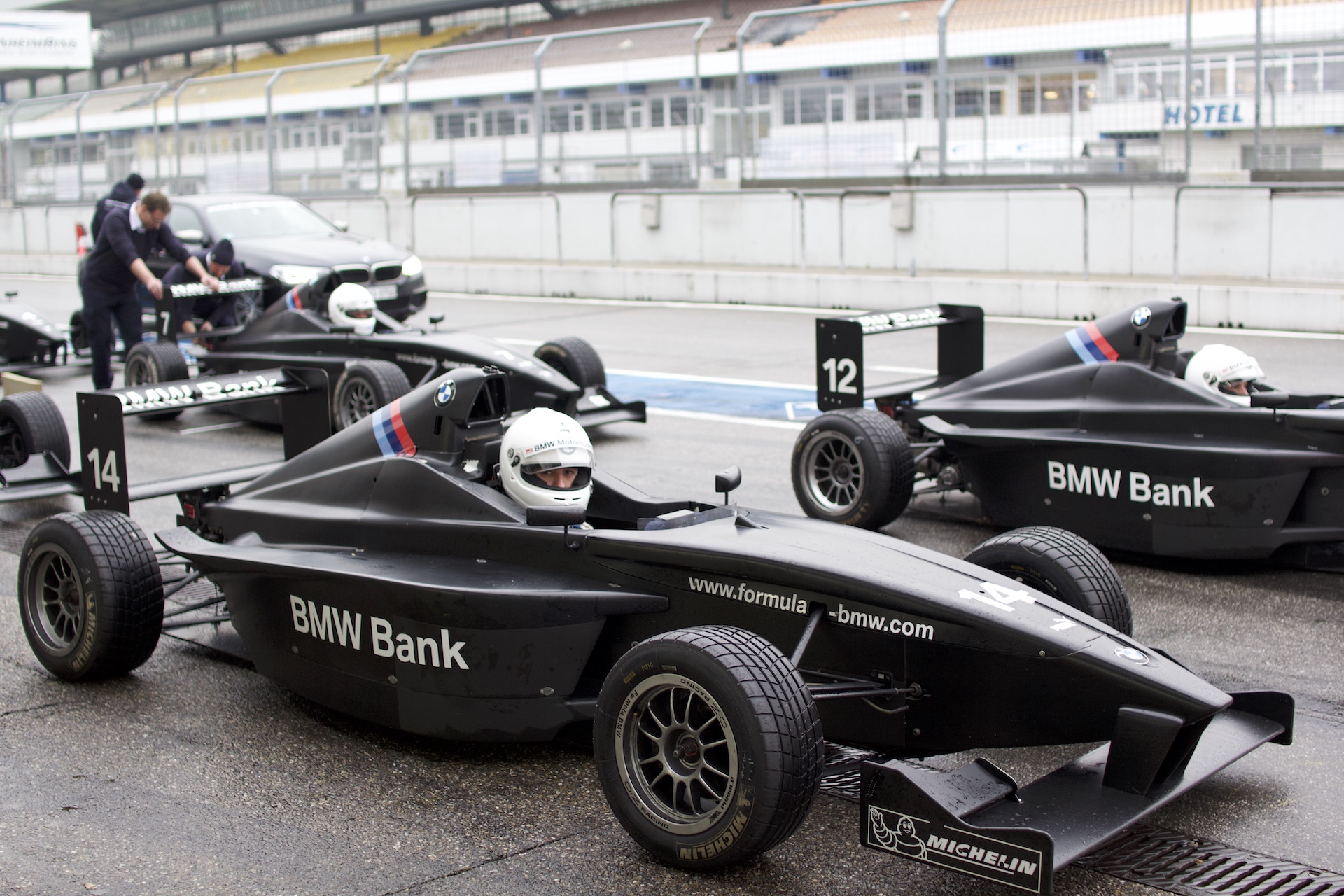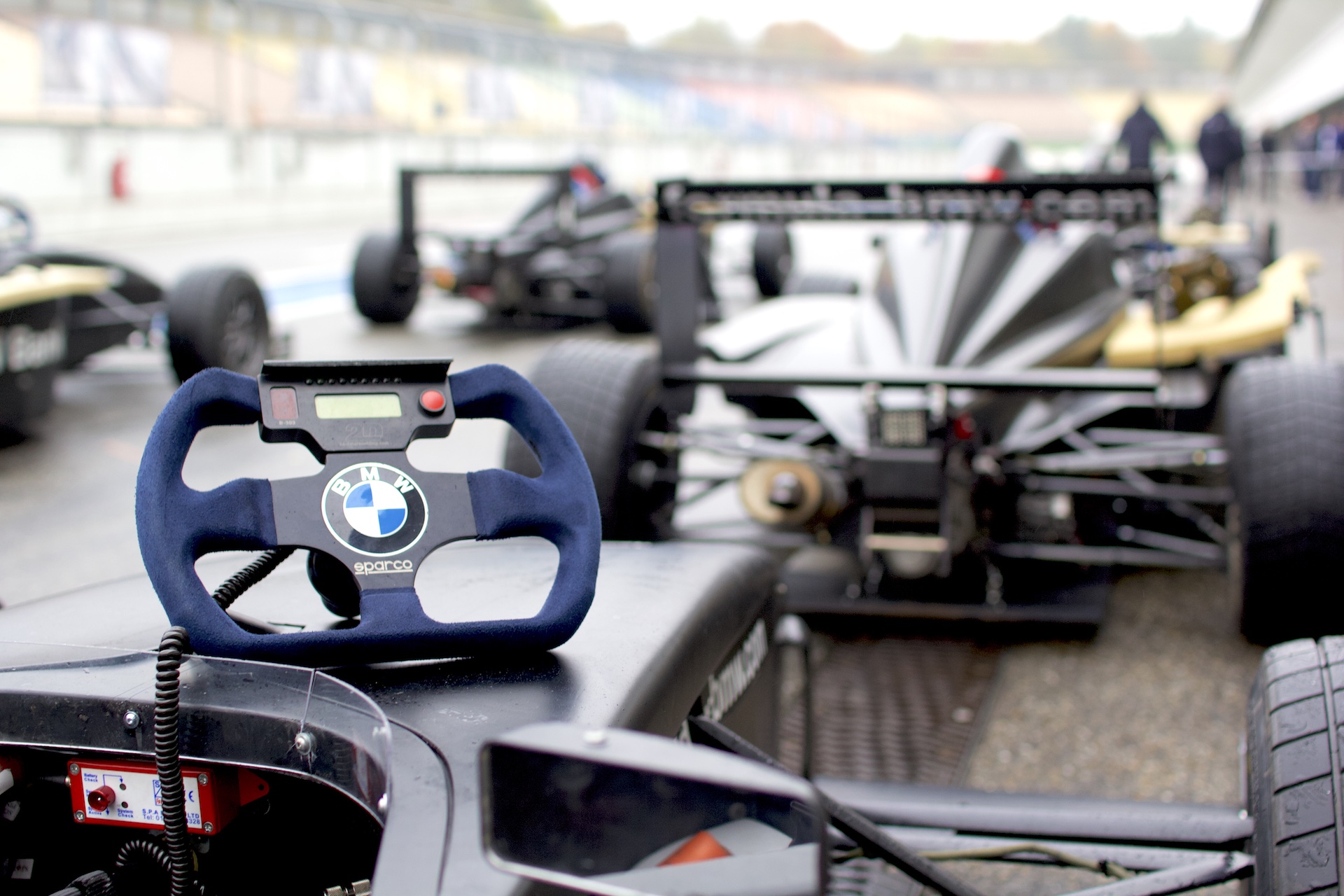 Nach einer regenfreien Mittagspause kommt Bewegung in die Box. Eine Handvoll BMW FB02 wird aus der Garage gerollt und aufgereiht. So schnell es geht wechsle ich zum zweiten Mal in den Rennanzug und falte kurz später meine Beine tatsächlich ins absurd enge Cockpit des Rennwagens. Während mich ein Mechaniker auf dem ungepolsterten Sitz vertäut, fängt es wieder an zu Nieseln. Kein ESP, nicht einmal ABS – jetzt gleich bloß nicht abfliegen. Mit hellem Kreischen rollen wir aus der Box und es gibt kein Zurück.