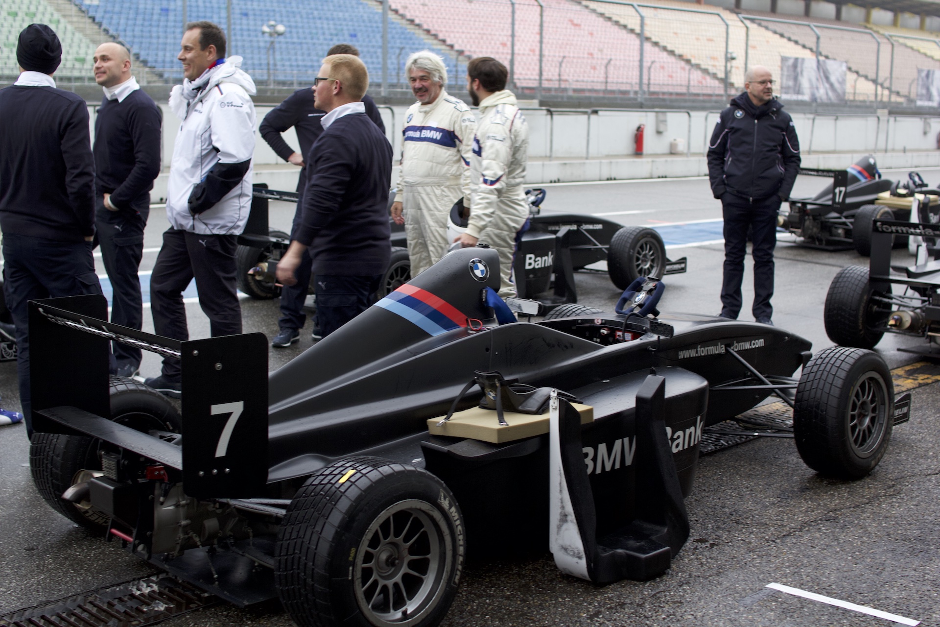 Für mich soll das Programm mit der Fahrt im Rennwagen losgehen, das Highlight des Tages folgt damit gewissermaßen gleich auf den ersten Kaffee. BMW FB02 lautet die recht emotionslose Bezeichnung des Formel-Renners, mit dem die Münchner zwischen 2002 und 2011 aktive Nachwuchsförderung für den Motorsport betrieben haben. Große Namen feierten im knappen Cockpit des FB02 Einheitsautos ihre ersten Meisterschaftstitel, darunter Sebastian Vettel und Nico Rosberg. Seit 2011 werden die besonders auf Sicherheit und Reparaturfreundlichkeit ausgelegten Formel BMWs nicht mehr regelmäßig im Rennbetrieb genutzt und kommen an nur wenigen Terminen im Jahr – zum Beispiel bei “Drive Like Bruno” – als Testobjekte für rennstreckenbegeisterte Amateurfahrer wieder auf die Strecke.