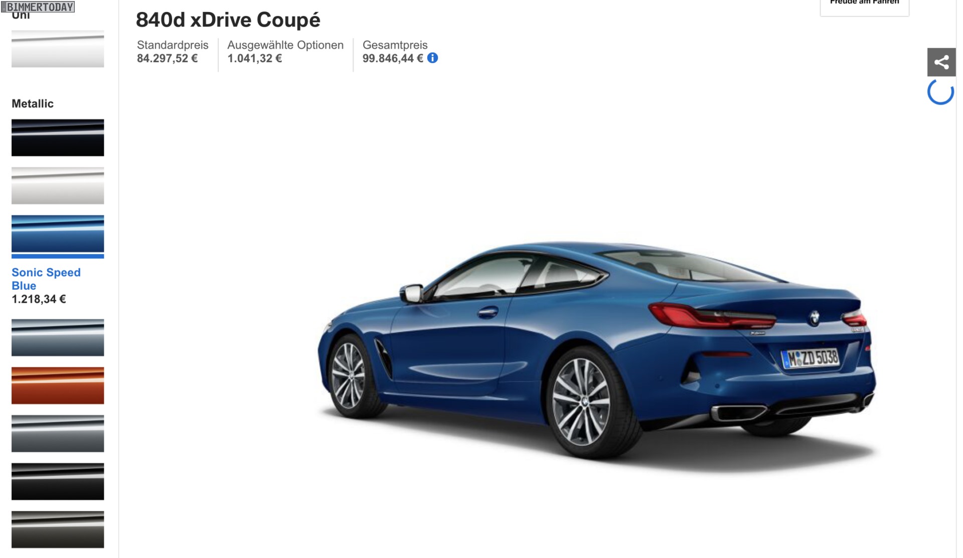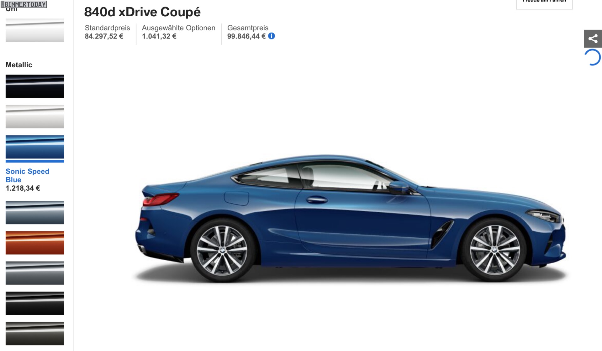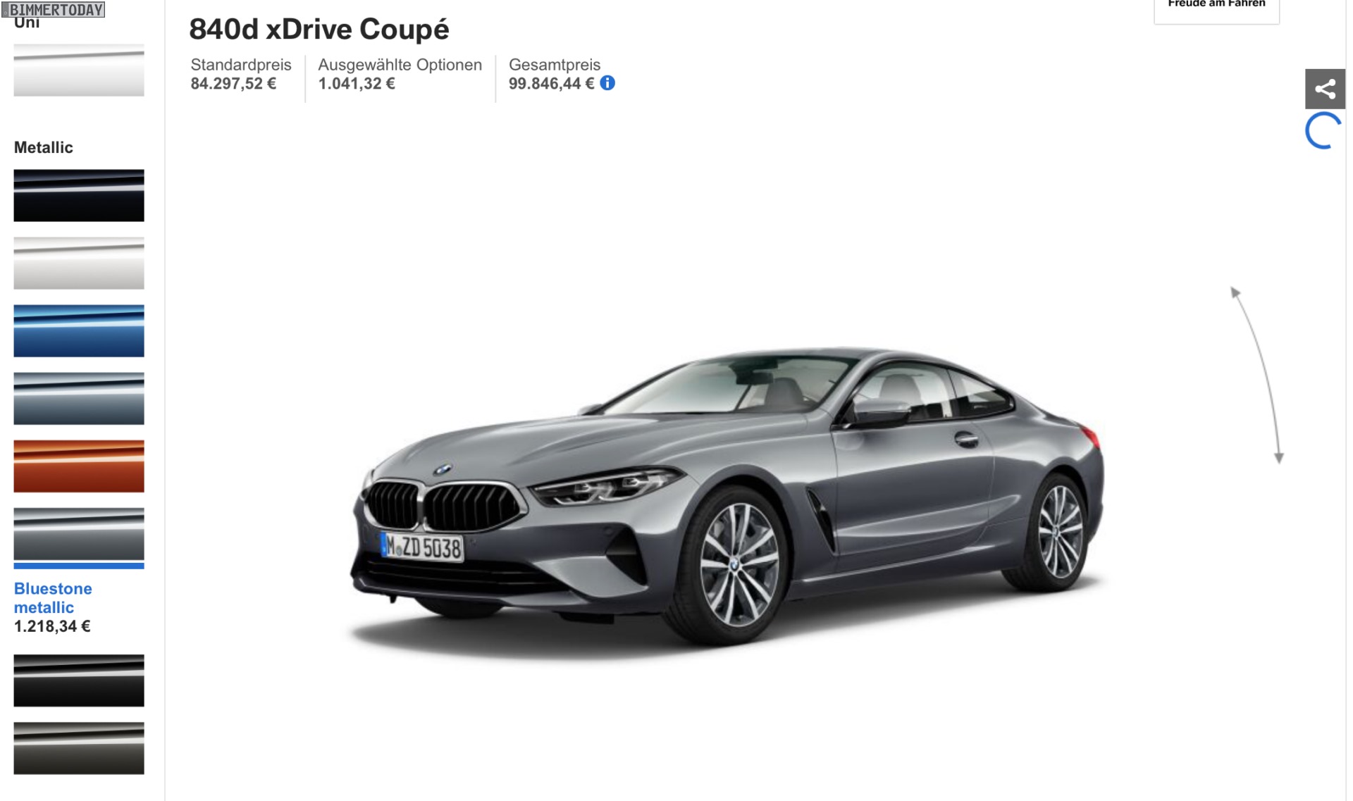 Das neue BMW 8er Coupé G15 steht bereits im Konfigurator bereit. Auch wenn die deutsche Website noch nicht so weit ist, sind erste mehr oder wenige konkrete Überlegungen zur richtigen Farbe und Ausstattung des Luxus-Coupés auf bmw.lu bereits möglich. Das ist auch deshalb interessant, weil wir den BMW 840d xDrive hier ohne M Sportpaket sehen und damit einen Eindruck von einer weniger sportlich konfigurierten Variante des neuen Marken-Flaggschiffs erhalten.