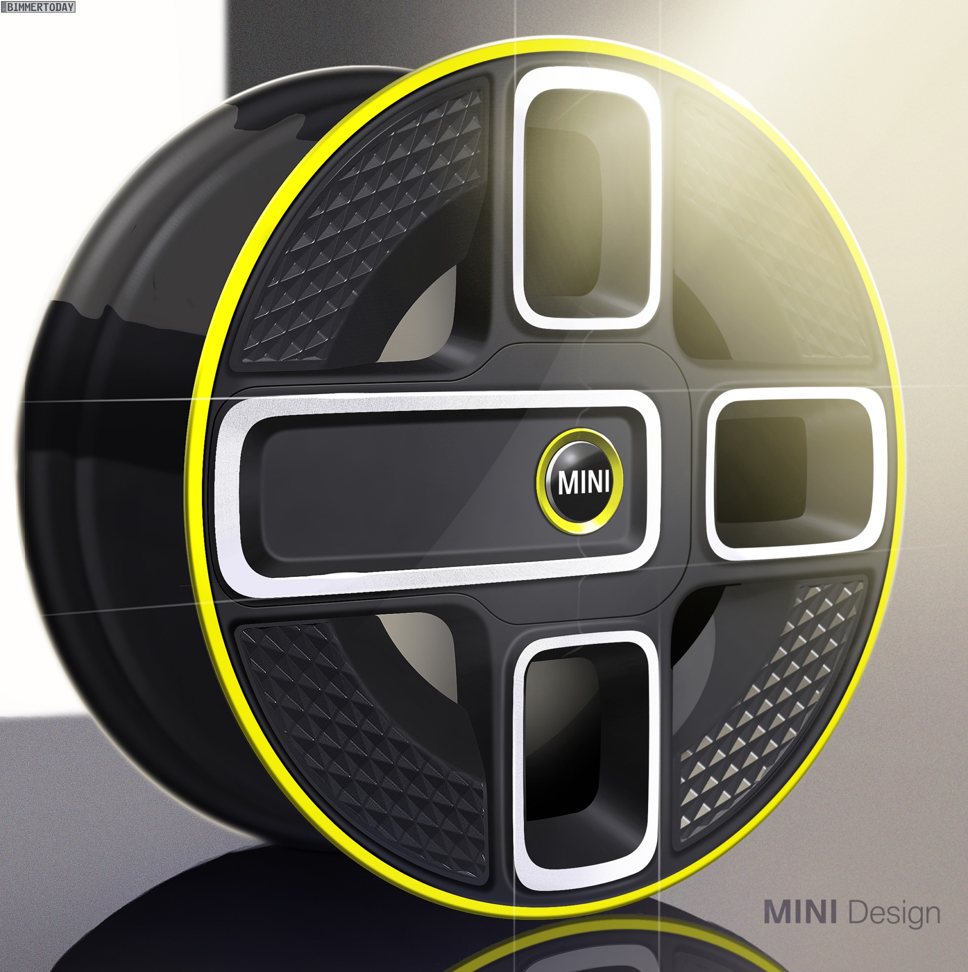 Auf dem Weg zur Serienreife des MINI E 2019 haben die Engländer erste Design-Details offiziell bestätigt. Zwei Skizzen zeigen demnach das finale Design des “Kühlergrills” an der Front, der auf voller Breite von einem horizontalen Doppelstreifen in auffälligem Gelb durchzogen ist, sowie den asymmetrischen und daher ausgesprochen coolen Look der Felgen. Beide Elemente sollen dazu beitragen, dass der MINI E auf den ersten Blick als Elektroauto erkennbar ist, obwohl sich seine grundsätzliche Formensprache eng am aktuellen MINI Dreitürer F56 LCI orientiert.