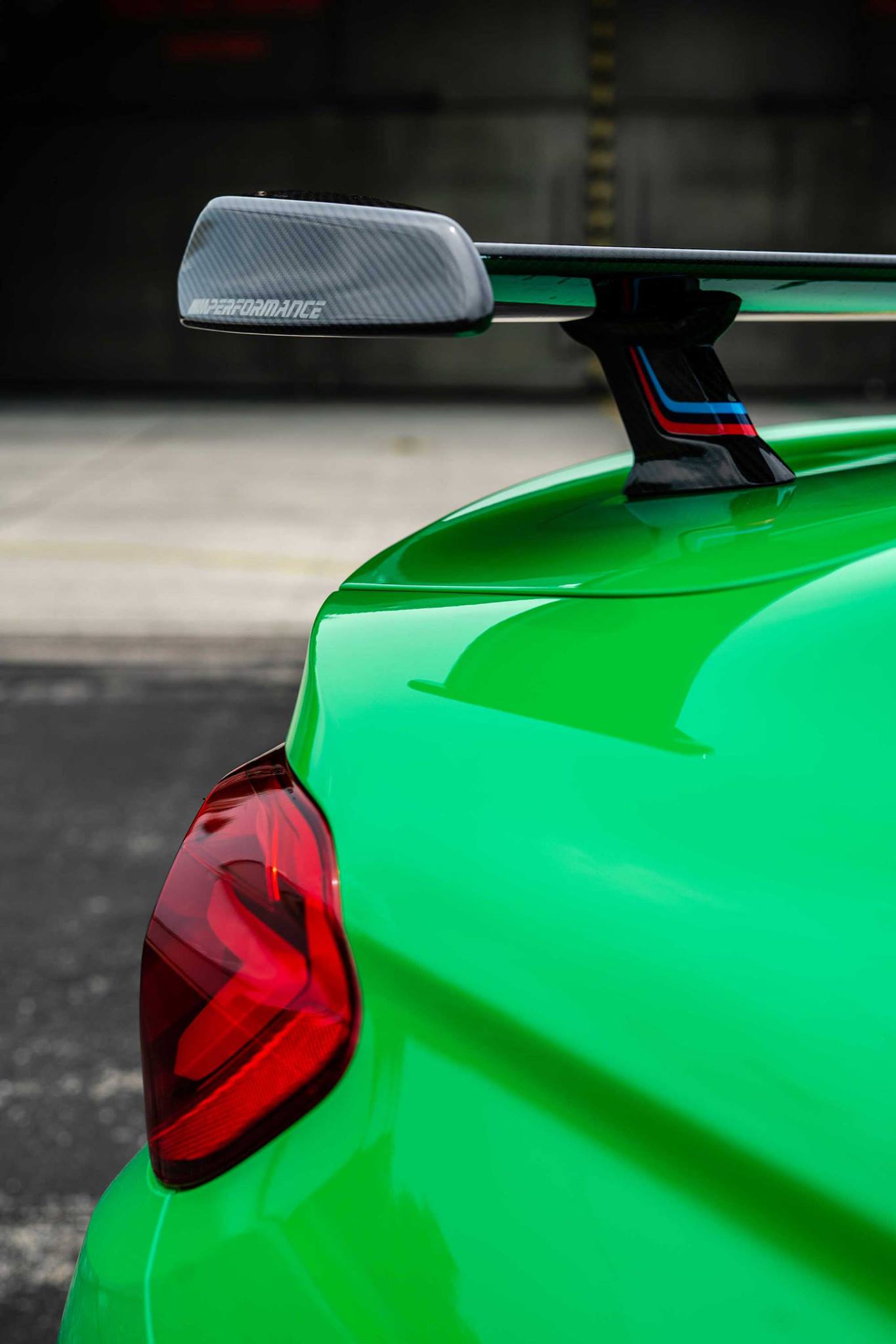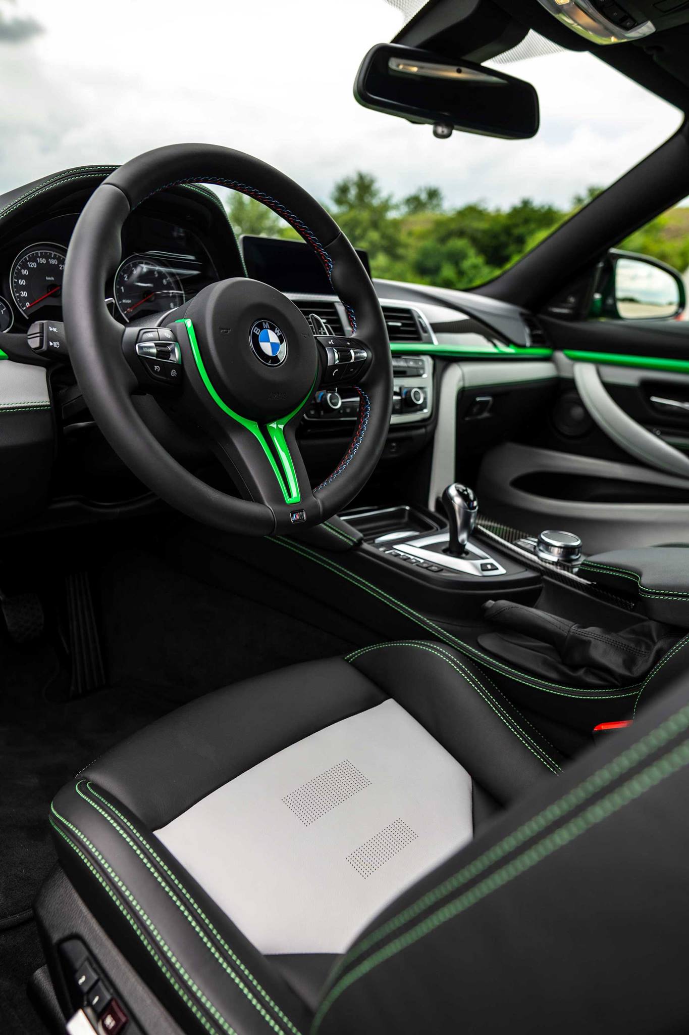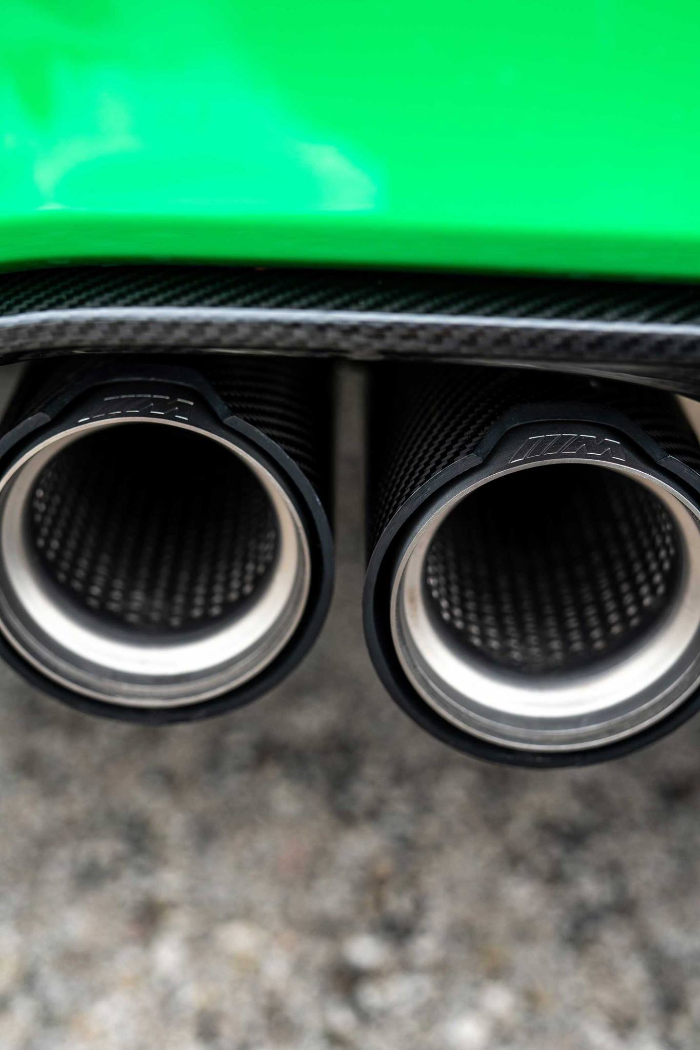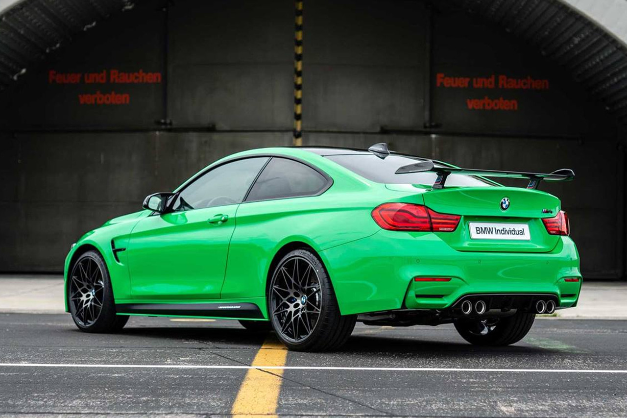 Dunkle Akzente zur Lackierung in Signal Green setzen nicht nur das serienmäßige Carbon-Dach und die Leichtmetallräder im Sternspeichen-Design, sondern auch das Tuning-Zubehör von BMW M Performance. Frontschürzen-Aufsätze, Frontsplitter, Außenspiegel, Heckdiffusor und Endrohr-Blenden aus Carbon sind dabei aber nur das Vorspiel, der Höhepunkt zum Auffallen ist zweifellos der große BMW M Performance Carbon-Heckflügel. Im Innenraum wird die Außenfarbe mit Zierteilen und Ziernähten erneut aufgegriffen.