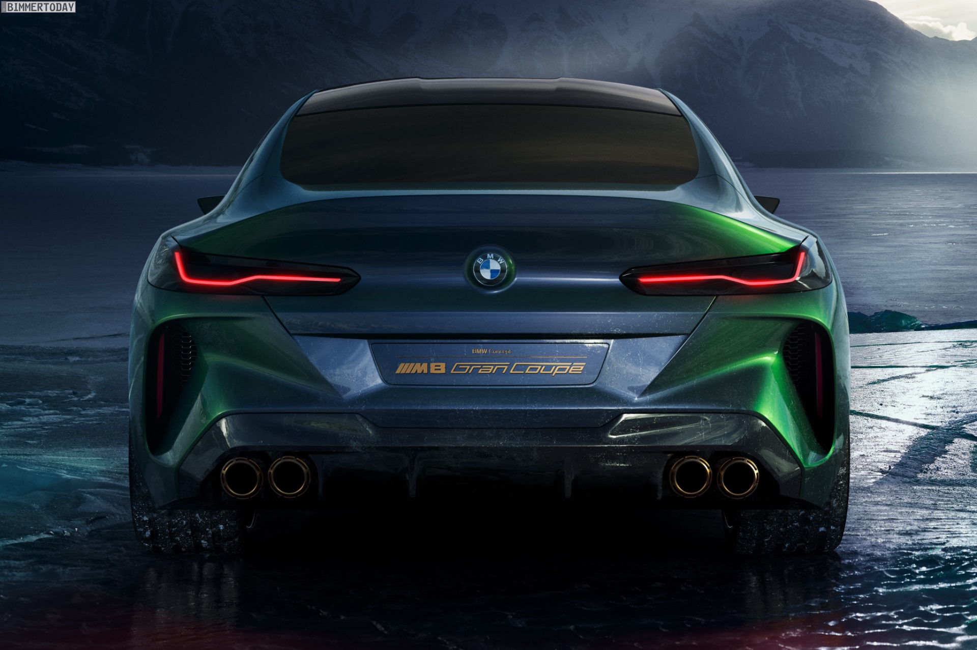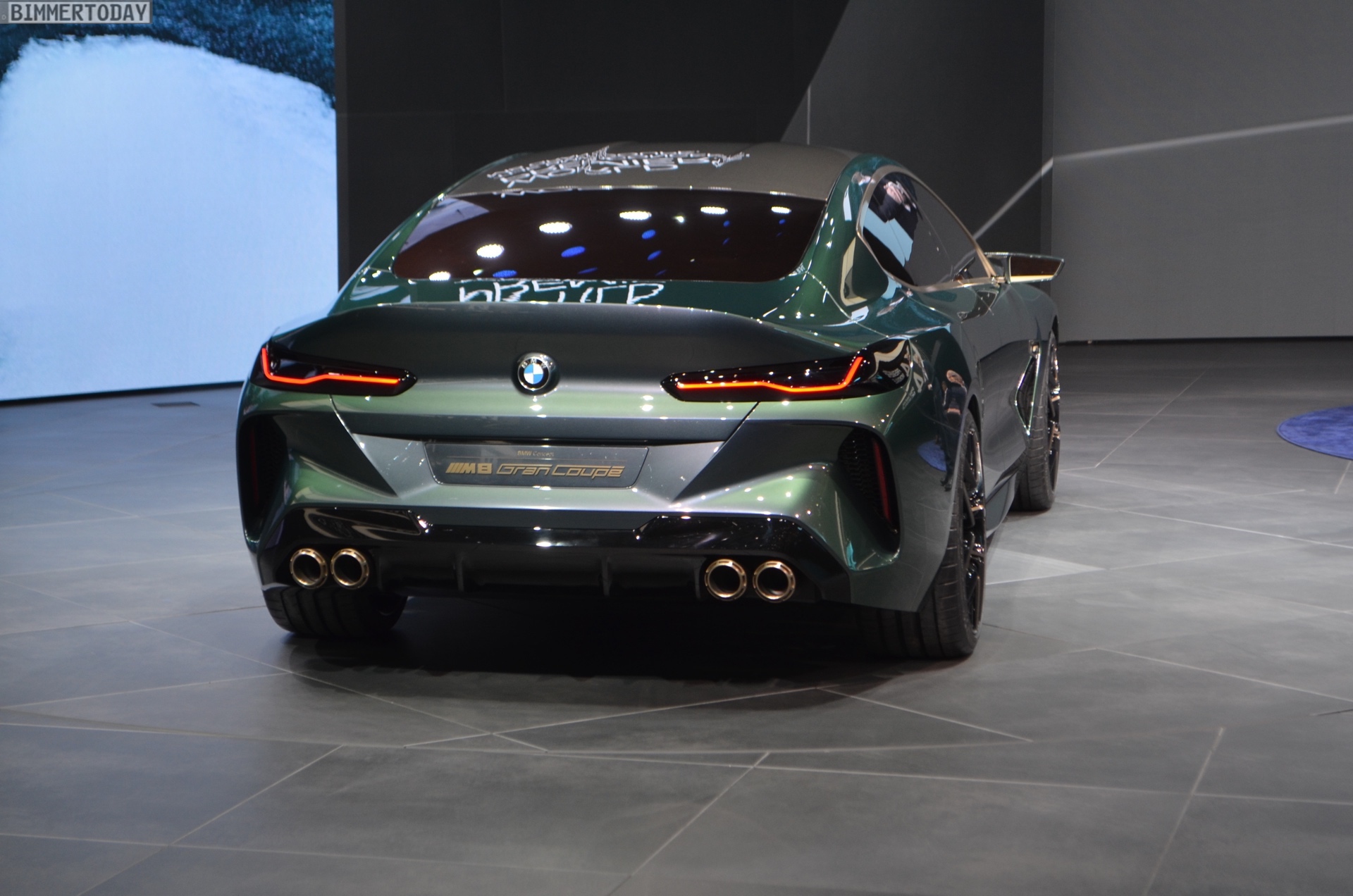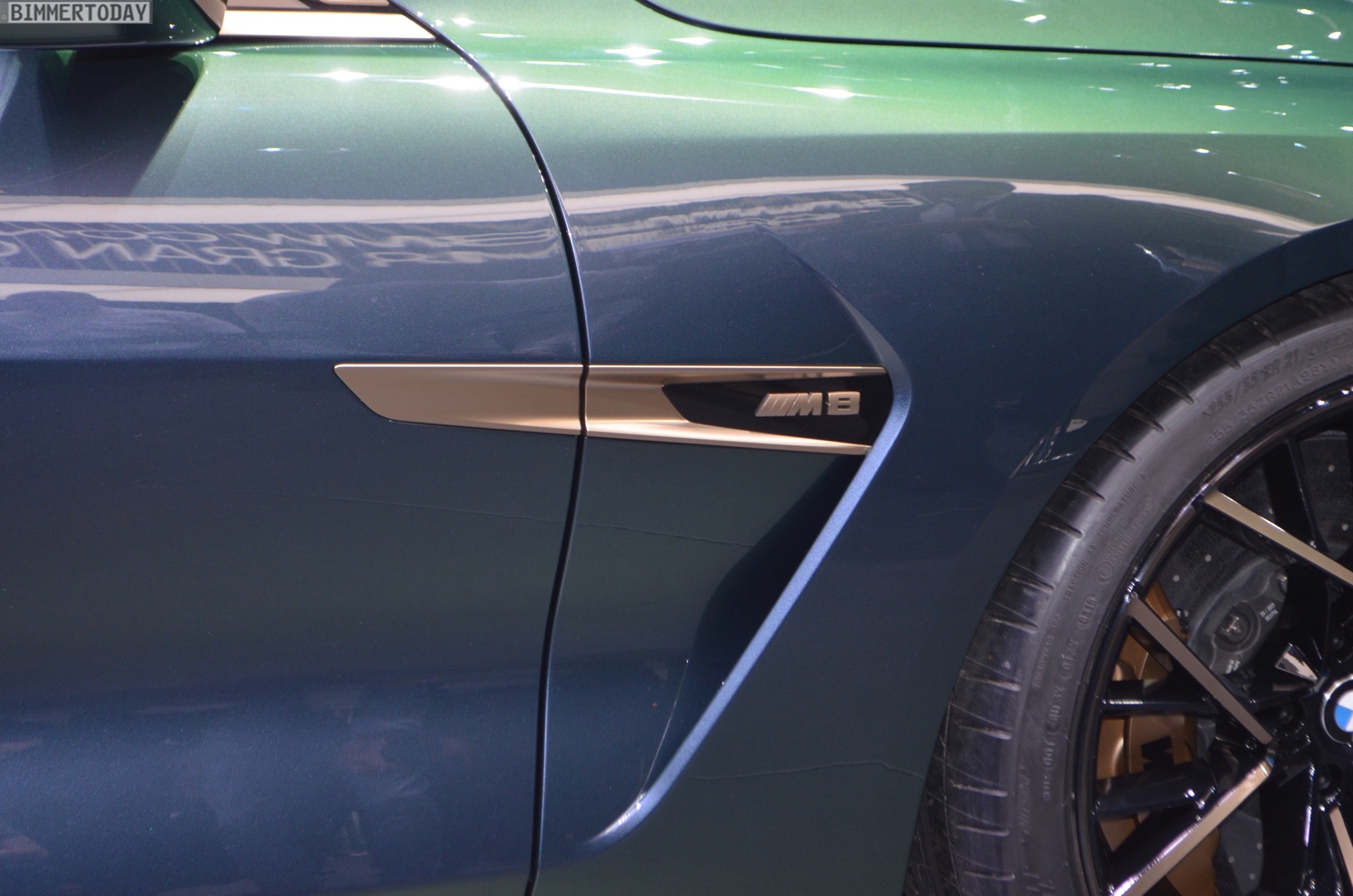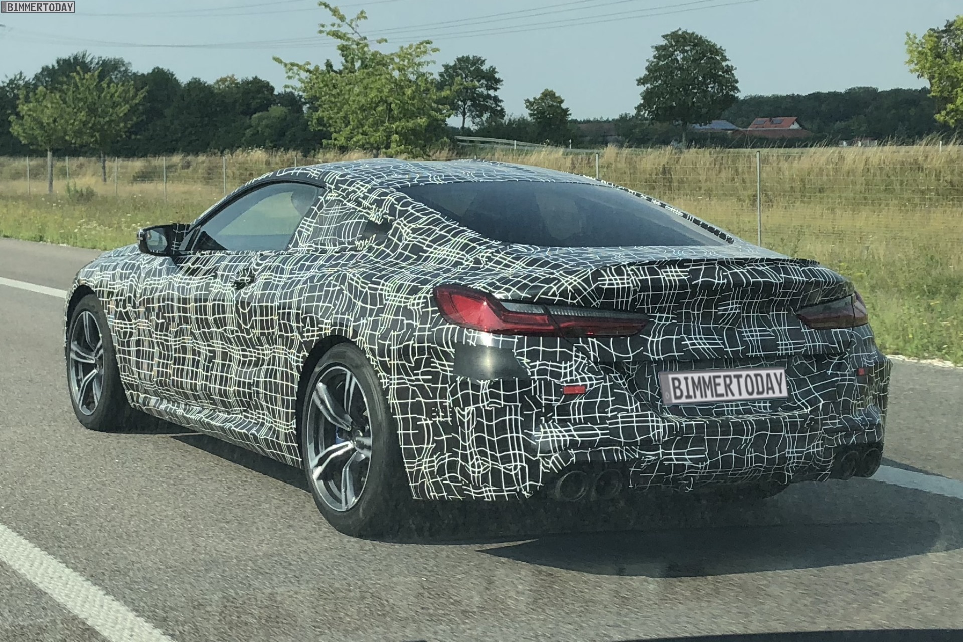 Klar erkennbar sind die großen Felgen, hinter denen sich eine leistungsfähige Bremsanlage verbirgt. Weitere klare Hinweise auf einen BMW M8 sind die M typischen Außenspiegel und natürlich die Abgasanlage mit vier mächtigen Endrohren. Dazwischen versteckt die Tarnfolie einen Diffusor, der zur aerodynamischen Stabilität des Fahrzeugs beiträgt. Auf der Kofferraum-Haube reduziert eine kleine Spoiler-Lippe den Auftrieb. Unter der Tarnfolie am höchsten Punkt des Fahrzeugs verbirgt sich das für den BMW M8 serienmäßige Carbon-Dach, das später ebenfalls ein wichtiges Merkmal zur Erkennung des Topmodells sein wird.