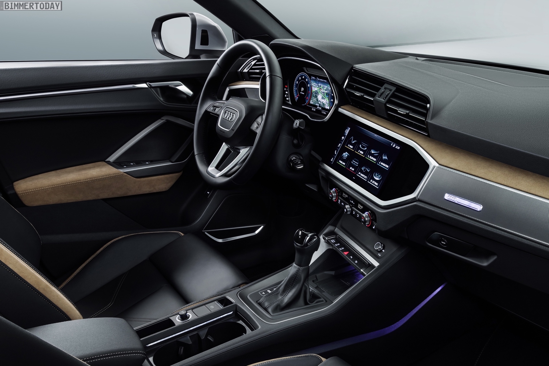Im Innenraum greift der Q3 das aktuelle Audi-Konzept auf und setzt auf mehrere Displays. Das digitale Kombiinstrument mit 10,25 Zoll Bildschirm-Diagonale ist serienmäßig an Bord, in der Mittelkonsole kommen optional Infotainment-Displays mit 8,8 oder 10,1 Zoll zum Einsatz. Auch das digitale Kombiinstrument wird auf Wunsch noch größer, als Audi Virtual Cockpit misst der Bildschirm 12,3 Zoll.