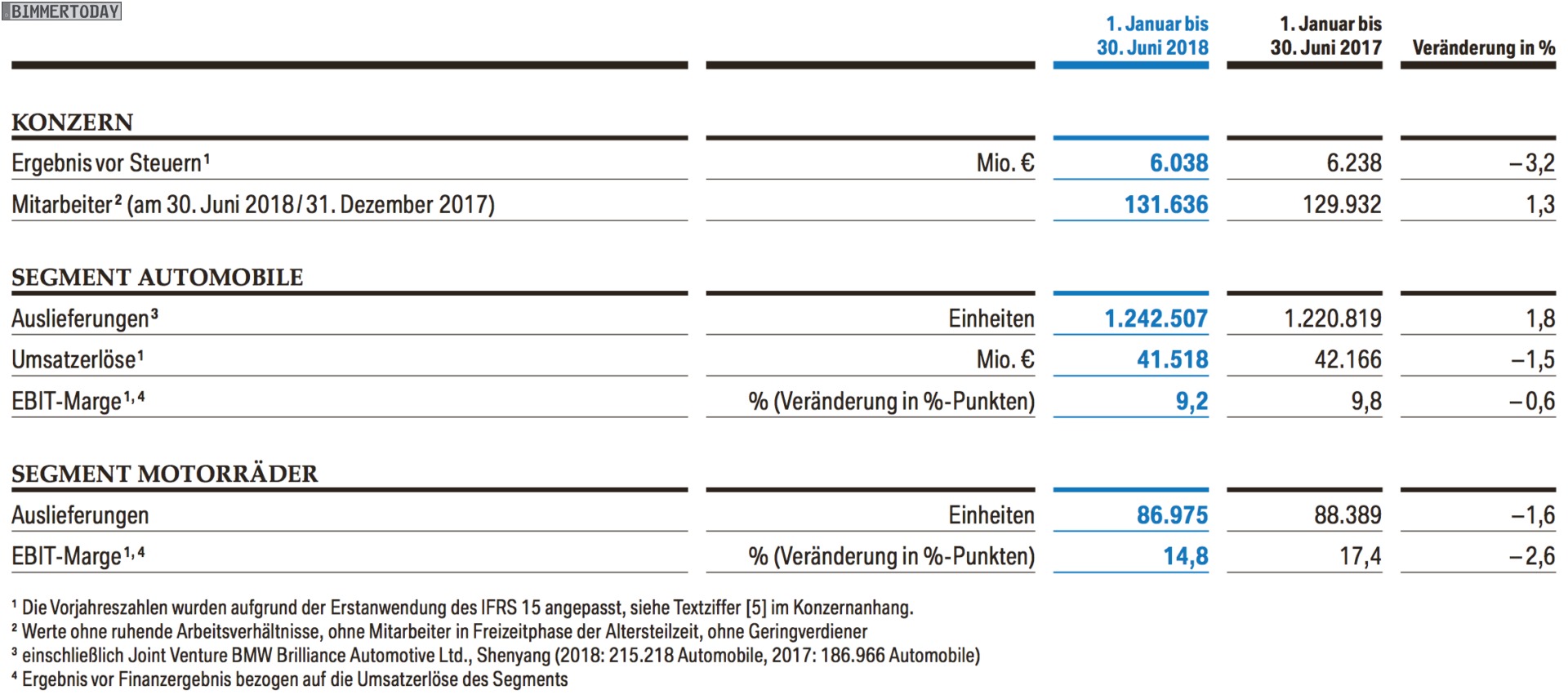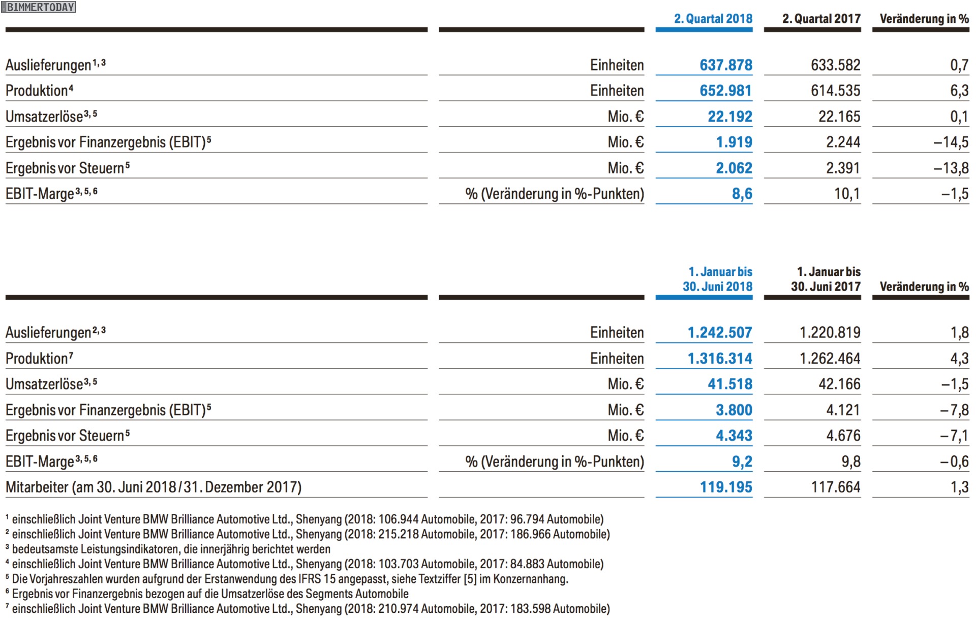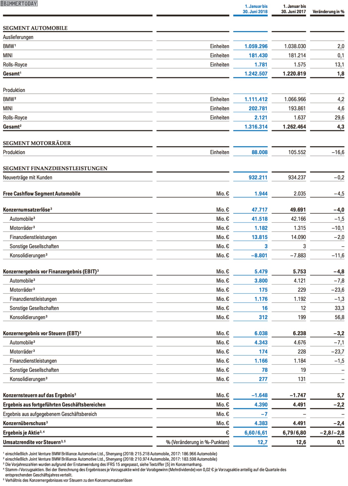 Grundlage dafür, dass sich die Rückgänge in Grenzen halten, ist der weiterhin starke Absatz der BMW Group. Im ersten Halbjahr 2018 steigerte das Unternehmen den Absatz der Marken BMW, MINI und Rolls-Royce um 1,8 Prozent auf den neuen Rekordwert von 1.242.507 Einheiten. Der Umsatz blieb dabei währungsbereinigt beinahe auf Vorjahresniveau (-0,3 Prozent), die Währungseffekte lassen aber ein Minus von 4,0 Prozent in den Büchern stehen. Der Konzernüberschuss schrumpfte im 1. Halbjahr 2018 um 2,4 Prozent auf 4,383 Milliarden Euro.
