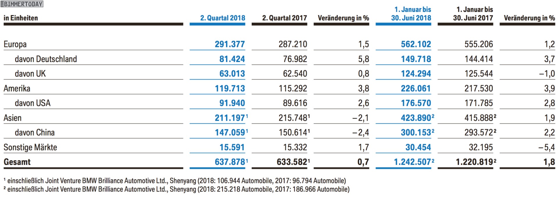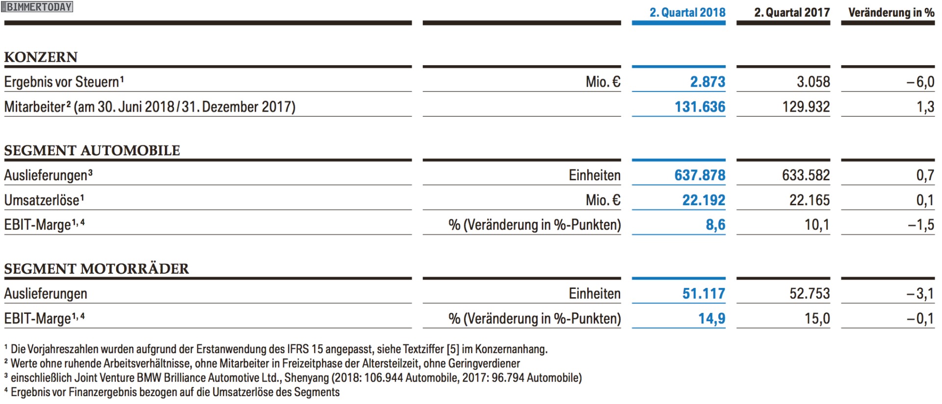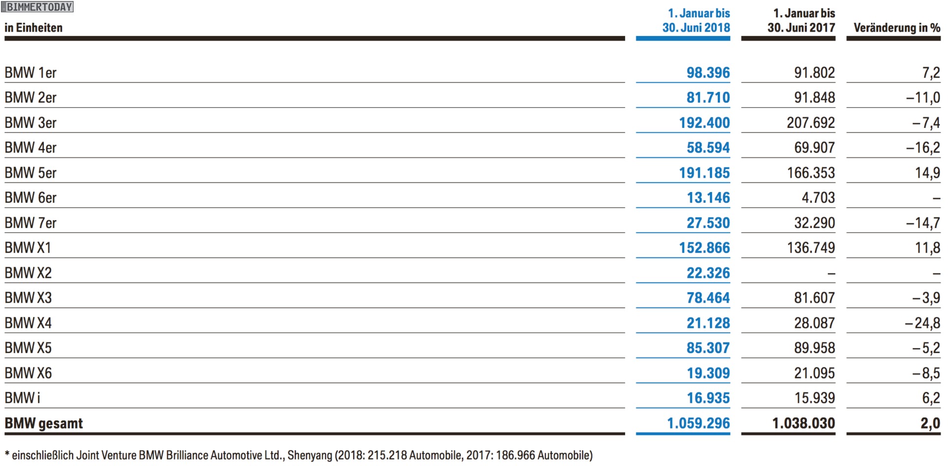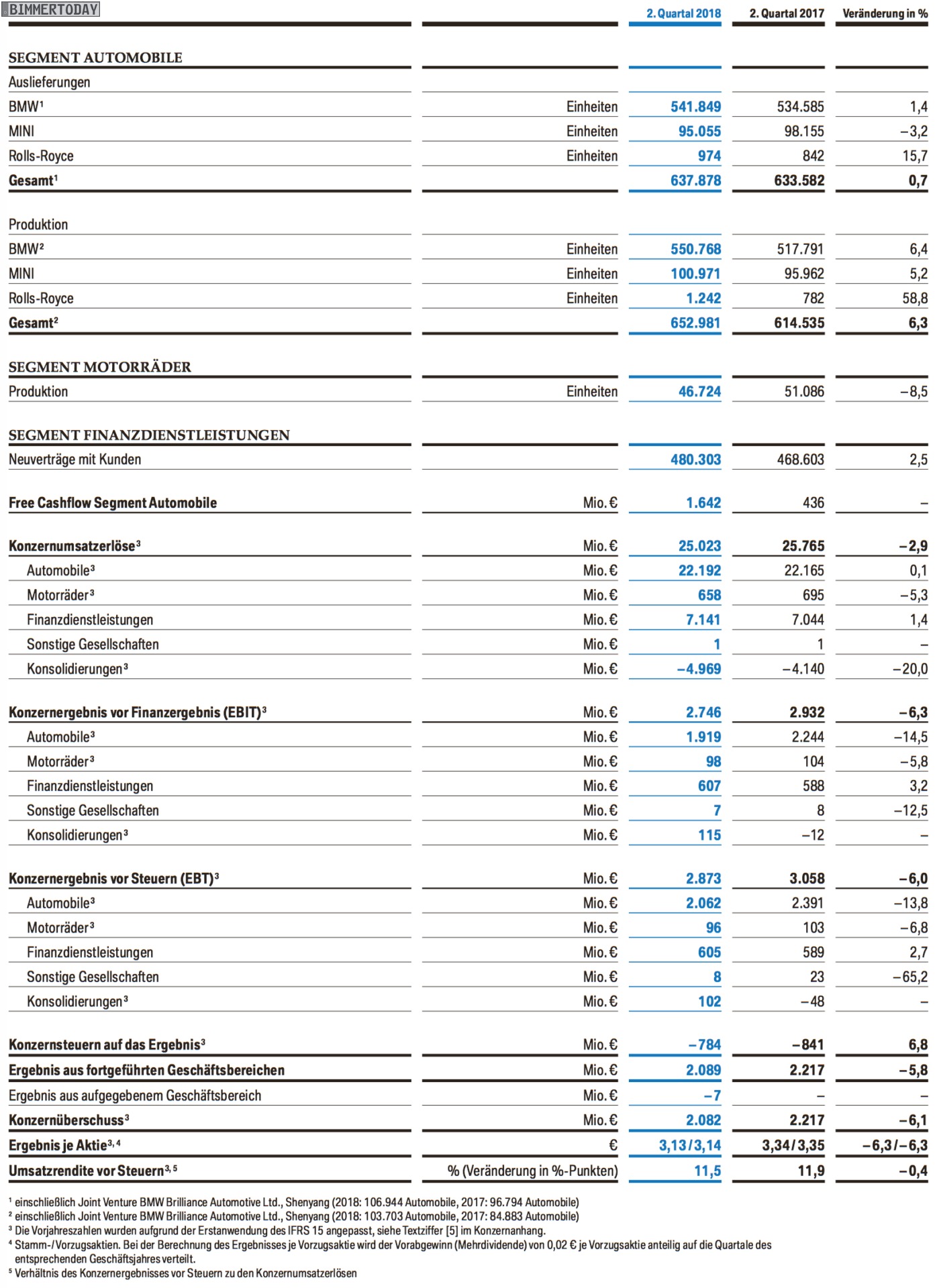 Grundlage dafür, dass sich die Rückgänge in Grenzen halten, ist der weiterhin starke Absatz der BMW Group. Im ersten Halbjahr 2018 steigerte das Unternehmen den Absatz der Marken BMW, MINI und Rolls-Royce um 1,8 Prozent auf den neuen Rekordwert von 1.242.507 Einheiten. Der Umsatz blieb dabei währungsbereinigt beinahe auf Vorjahresniveau (-0,3 Prozent), die Währungseffekte lassen aber ein Minus von 4,0 Prozent in den Büchern stehen. Der Konzernüberschuss schrumpfte im 1. Halbjahr 2018 um 2,4 Prozent auf 4,383 Milliarden Euro.