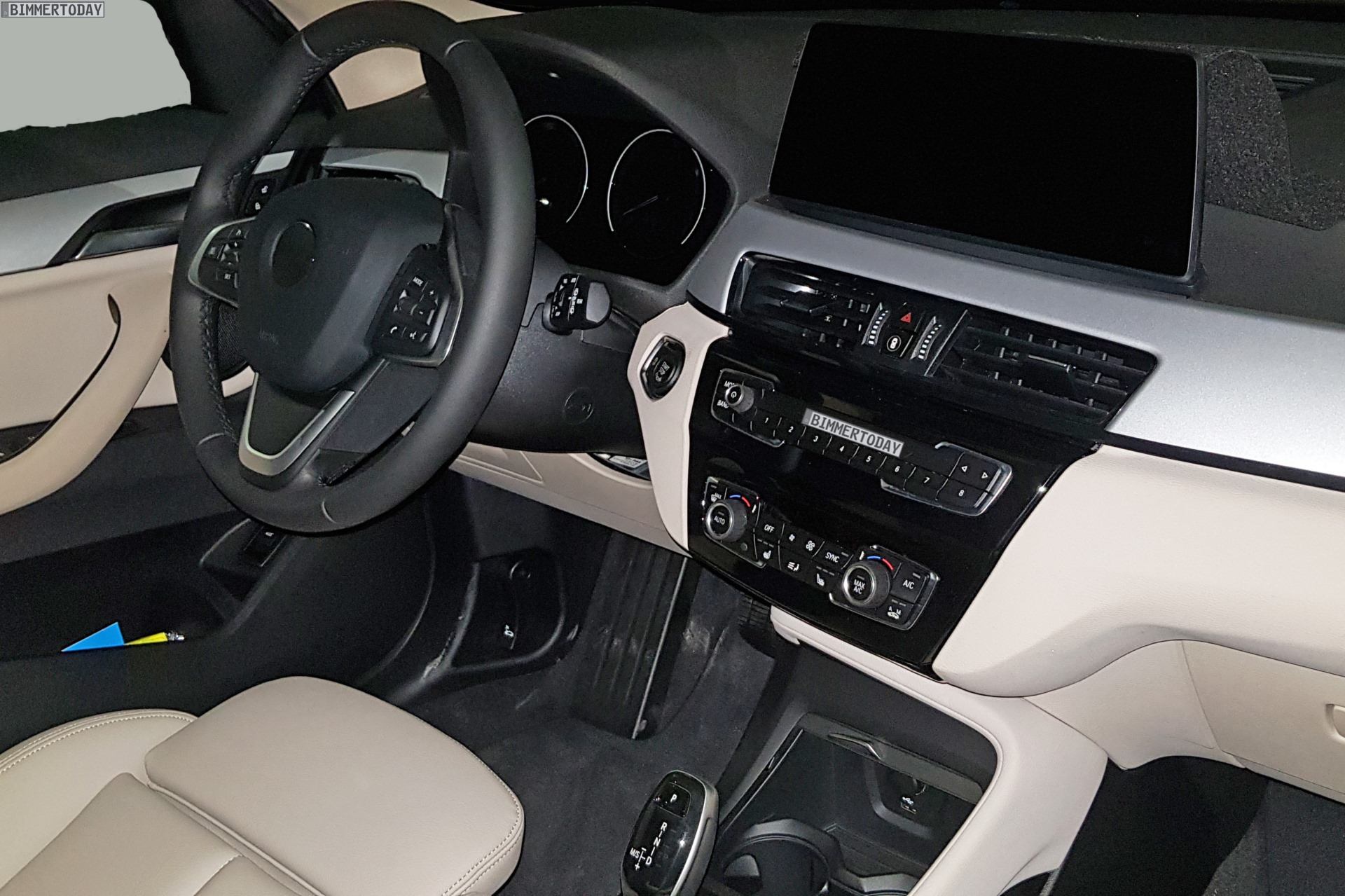 Spannender ist der Blick in den Innenraum, denn hier sehen wir ein deutlich vergrößertes Infotainment-Display. Wie ein vergleichender Blick in das bisherige Cockpit (unten) zeigt, trägt der Erlkönig ein erheblich breiteres und auch höheres Display. Der großflächige Touchscreen darf als Hinweis darauf gewertet werden, dass mit dem BMW X1 Facelift auch neue iDrive-Funktionen Einzug halten werden. Auffällig ist auch der aus dem Facelift für 2er Active Tourer und Gran Tourer bekannte Automatik-Wählhebel sowie der Tacho im Black Panel-Design, den wir ebenfalls schon aus diversen Kompaktklasse-Vertretern kennen.