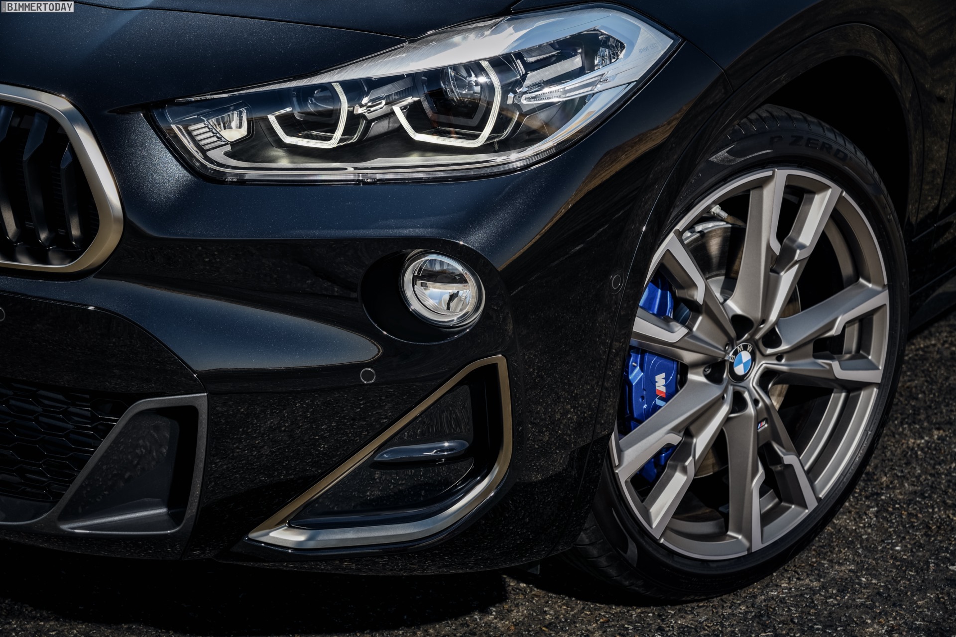 Überarbeitet wurde auch das Fahrwerk des BMW X2 M35i. Im Vergleich zu den schwächeren Modellen erhält das serienmäßige M Sportfahrwerk eine spezifische Abstimmung mit strafferem Feder-Dämpfer-Setup, Tieferlegung und veränderter Hinterachs-Konstruktion, optional ist ein adaptives Fahrwerk mit zwei manuell wählbaren Modi erhältlich. Eine größer dimensionierte Bremsanlage und die angepasste M Sportlenkung gehören ebenfalls zum Technik-Paket des Top-X2.