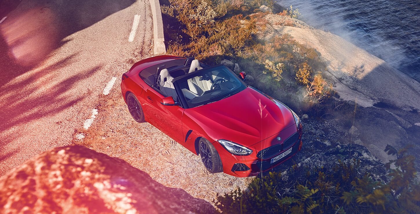 Einen besseren Eindruck von San Francisco Rot vermitteln die Wallpaper-Motive, auf denen der BMW Z4 M40i mit erweiterter Shadow Line und vielen schwarzen Akzenten zu sehen ist: