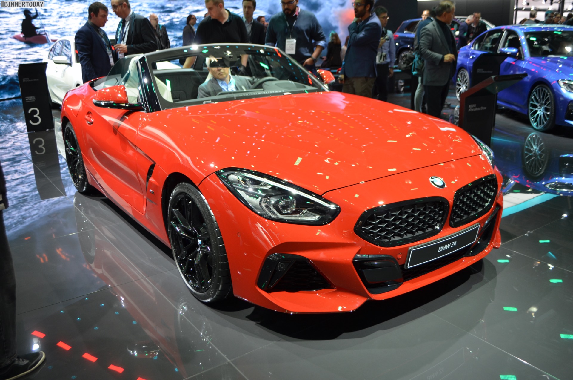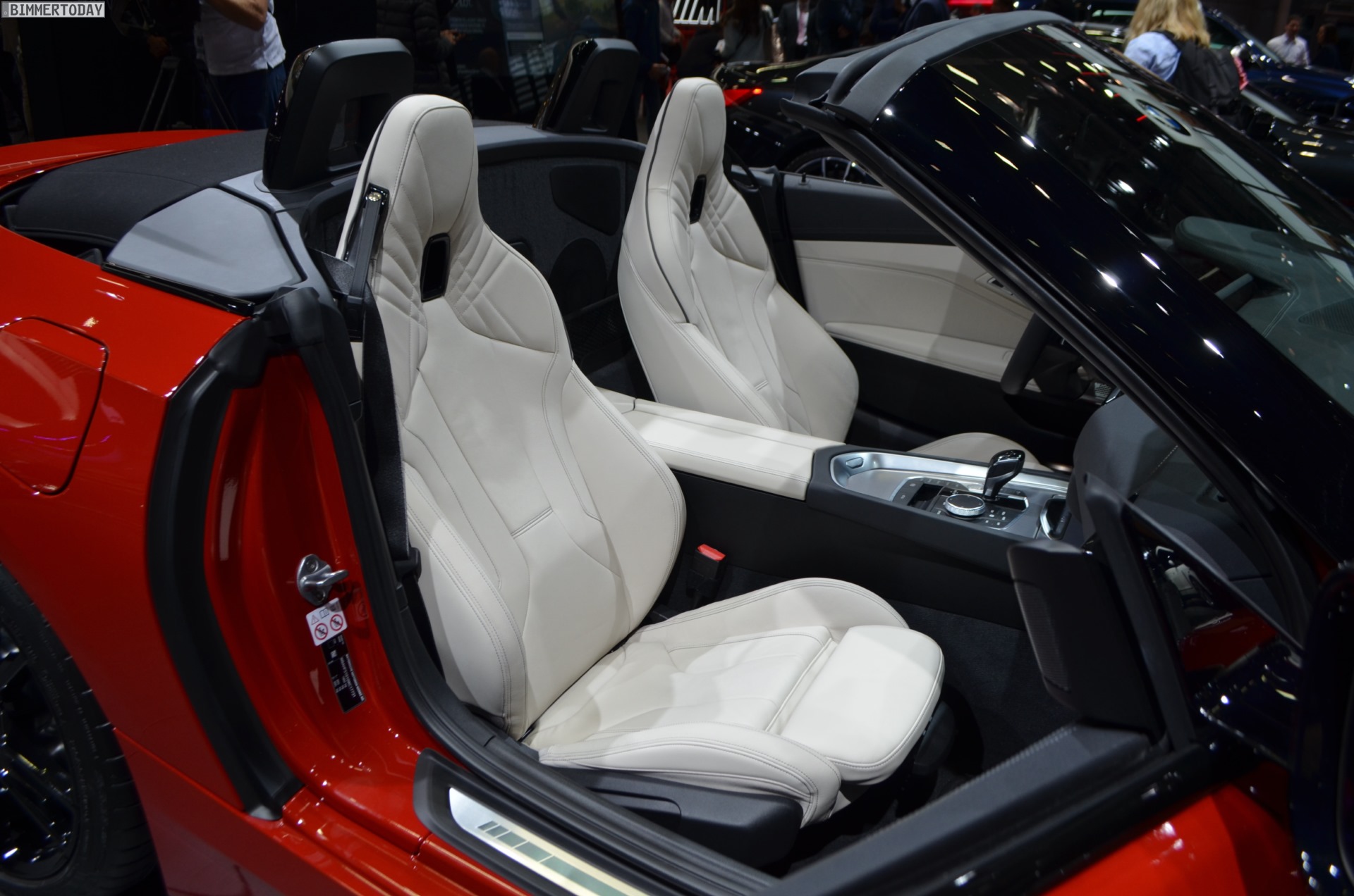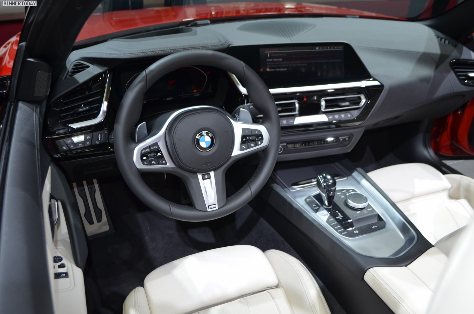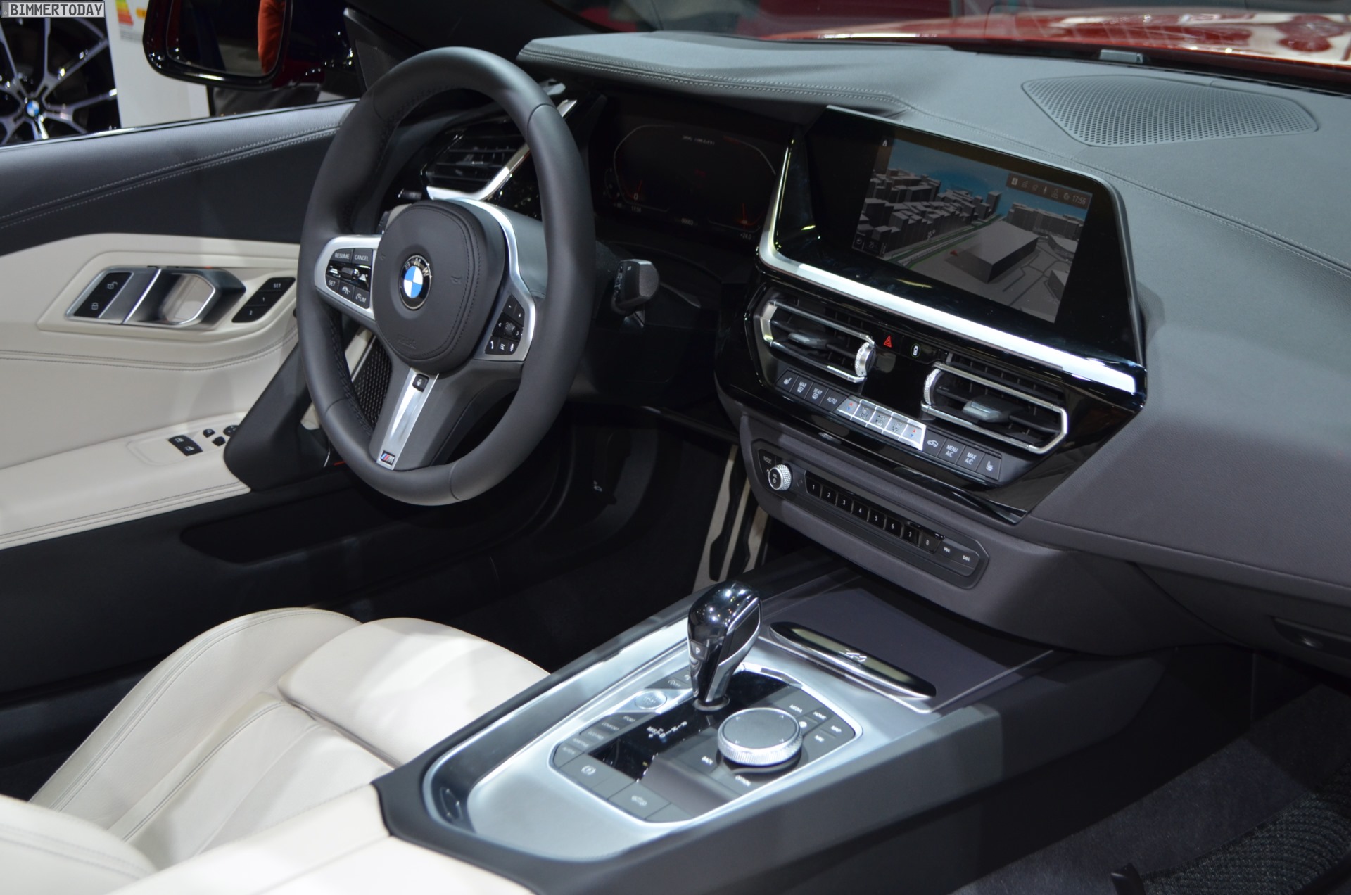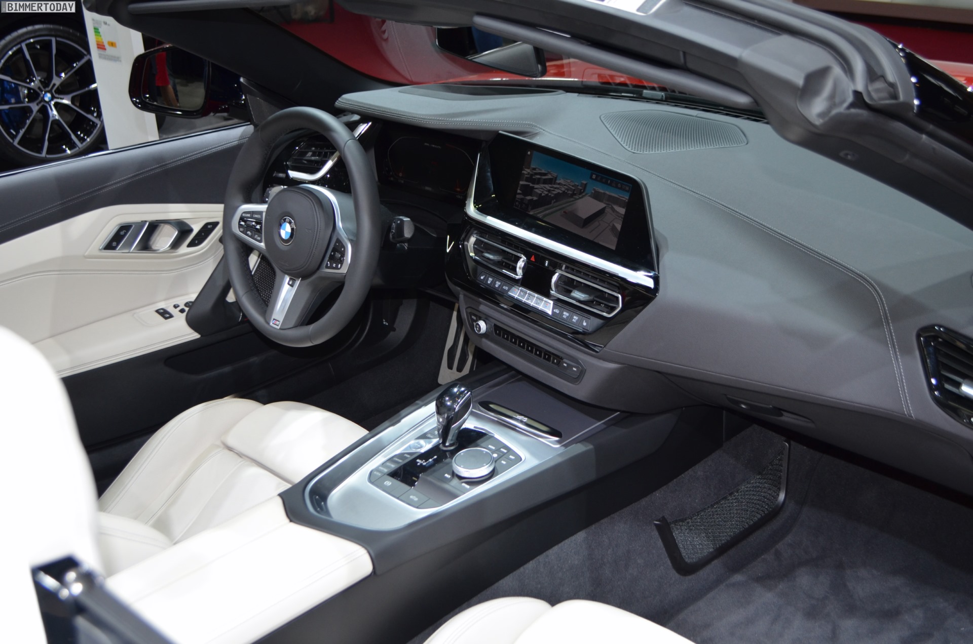 Dank der Lederausstattung Vernasca in Elfenbeinweiß wirkt der Innenraum des BMW Z4 G29 sehr freundlich, das spezielle Design der neu gestalteten Sportsitze kommt besonders gut zur Geltung. Das fahrerorientierte Cockpit-Design mit großem Infotainment-Display und völlig neuer Mittelkonsole erinnert stark an die Gestaltung an Bord des neuen BMW 3er G20, der in Paris gerade seine Weltpremiere feiert und der unumstrittene Star der Messe ist.