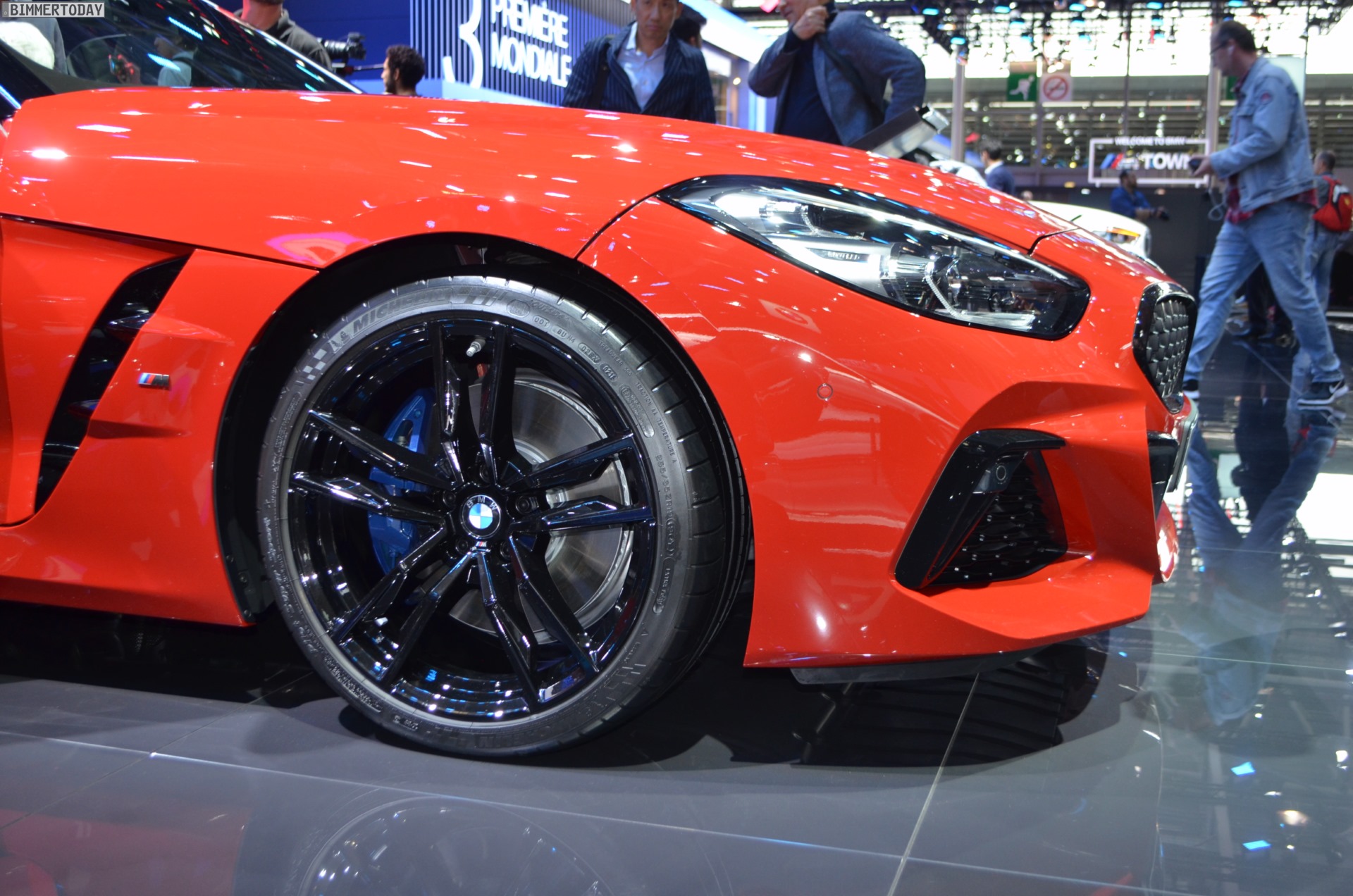 Besonders in Kombination mit einer kräftigen Farbe wie San Francisco Rot profitiert der Auftritt merklich von dieser Option, aber die schwarzen Akzente entfalten natürlich auch in Verbindung mit anderen Farben eine ganz andere Wirkung als Cerium Grey. Mit der für alle Z4 M40i serienmäßigen Shadow Line sind bereits die Air Breather, die Fensterschachtabdeckung, Außenspiegel-Rahmen und -Fuß sowie die Zierleiste des Seitenrahmens in hochglänzendem Schwarz ausgeführt, mit den erweiterten Umfängen kommen die Nieren-Einfassung und die Endrohr-Blenden hinzu. Passend dazu trägt der in Paris gezeigte Z4 auch die Jetblack-Ausführung der 19 Zoll-Felgen im Design 799 M.