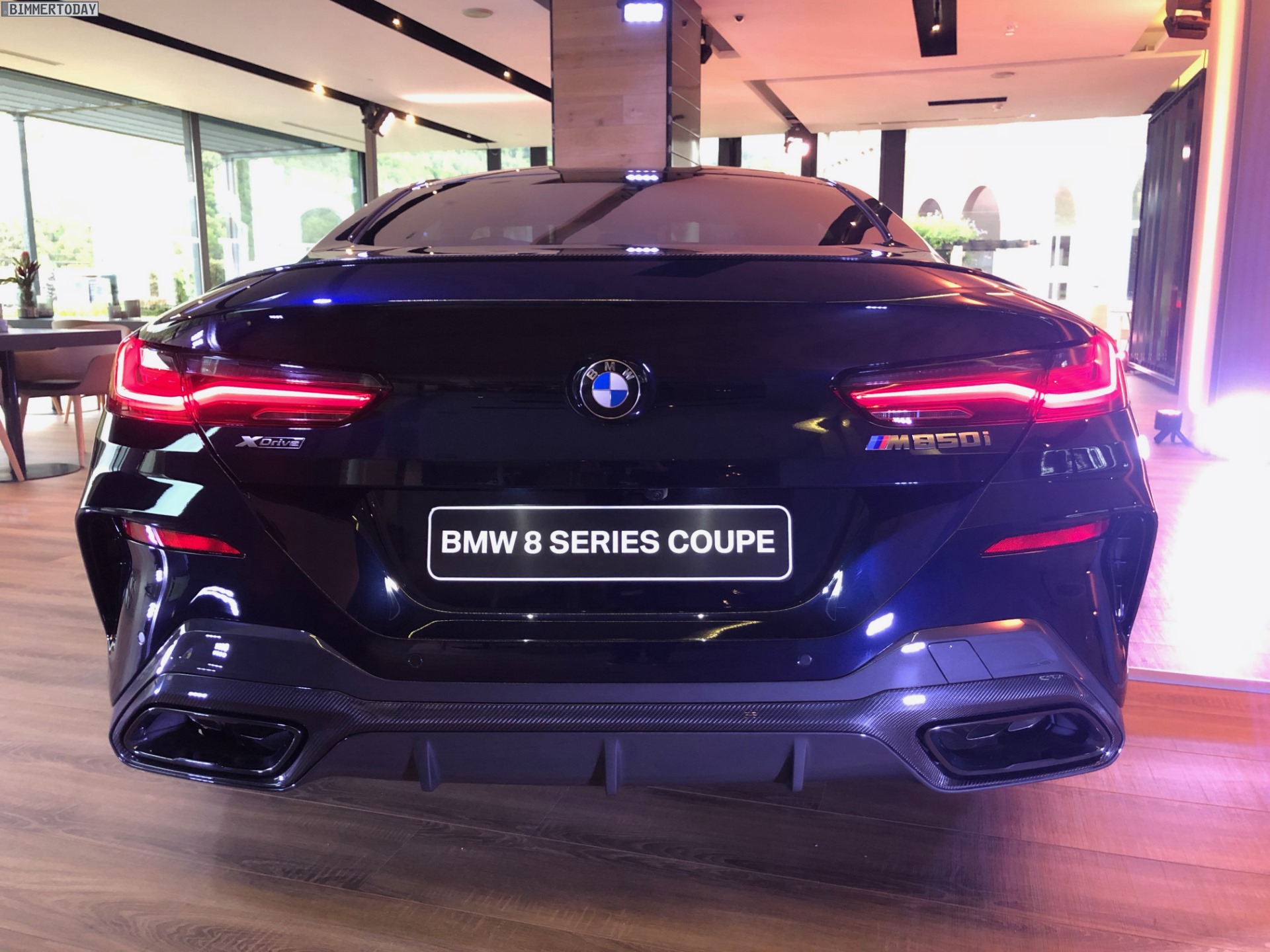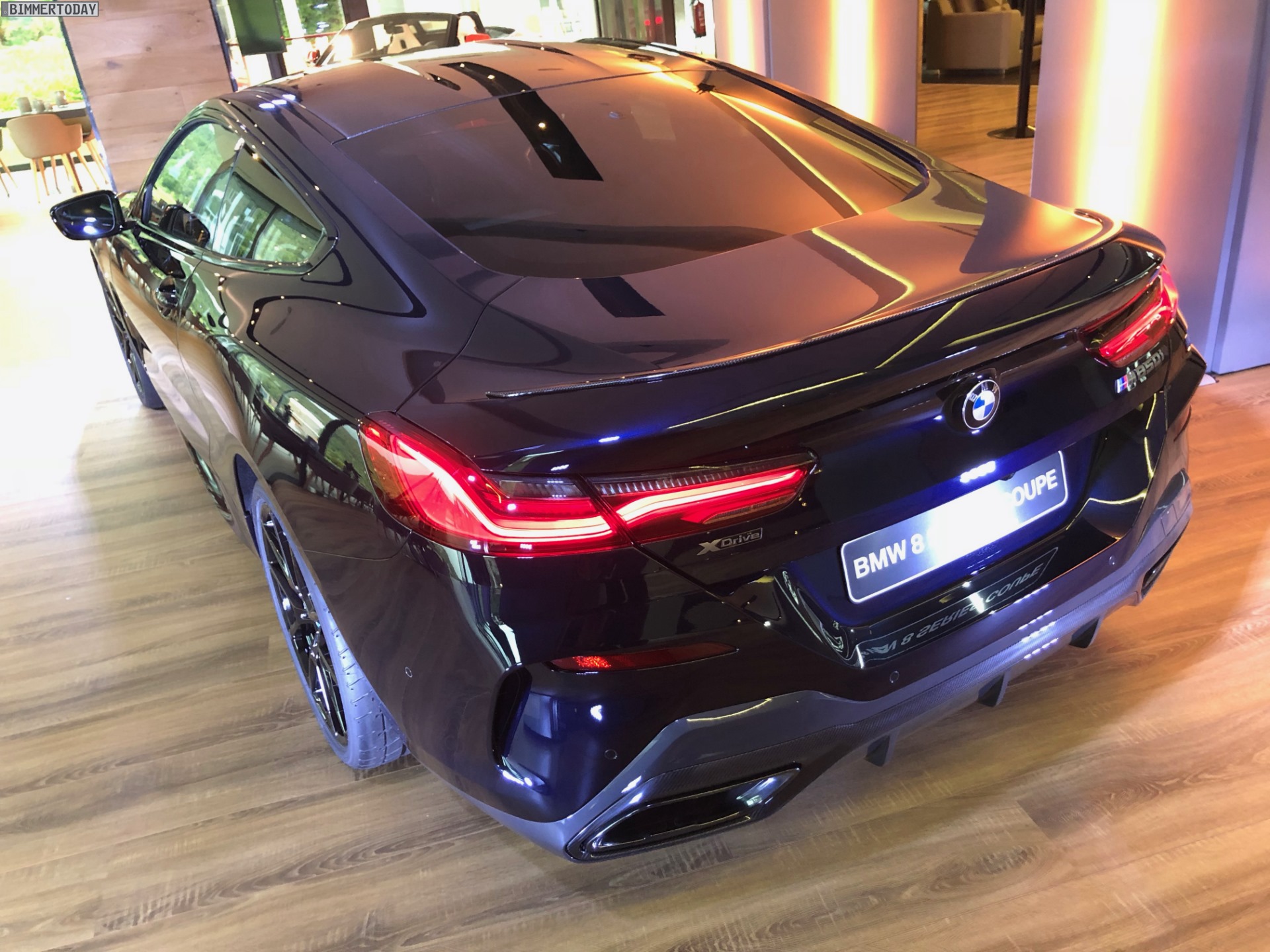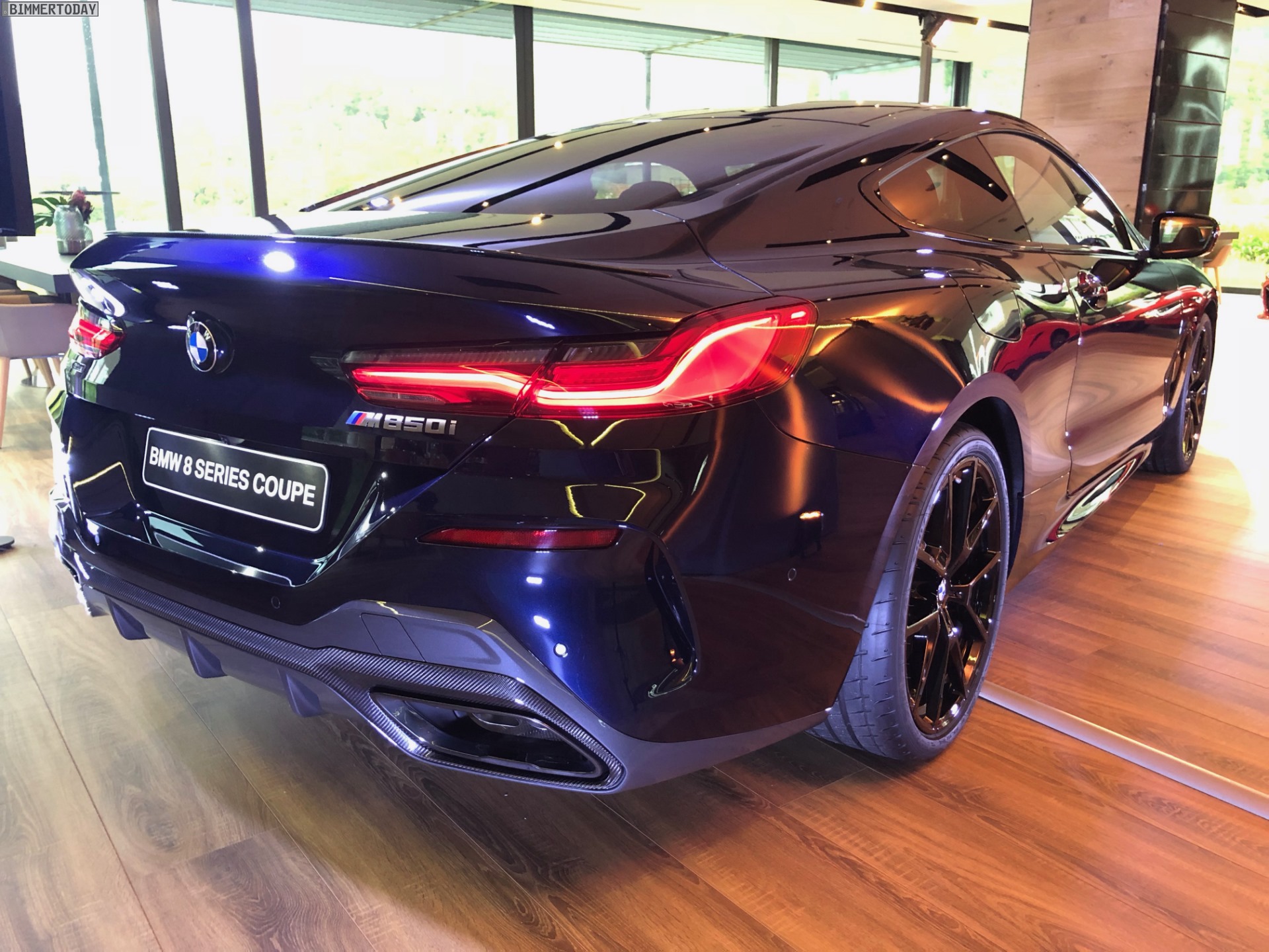 Dank Shadow Line mit erweiterten Umfängen und Carbon-Paket präsentiert sich der gezeigte BMW M850i nur auf den ersten Blick komplett Schwarz, bei genauerem Hinsehen werden schnell die unterschiedlichen Farbtöne erkennbar: Carbonschwarz als Hauptlackierung, Elemente wie die Nieren in Hochglanzschwarz, sportliche Elemente wie die Heckspoiler-Lippe und das Dach bestehen unübersehbar aus dem Hightech-Werkstoff Carbon.
