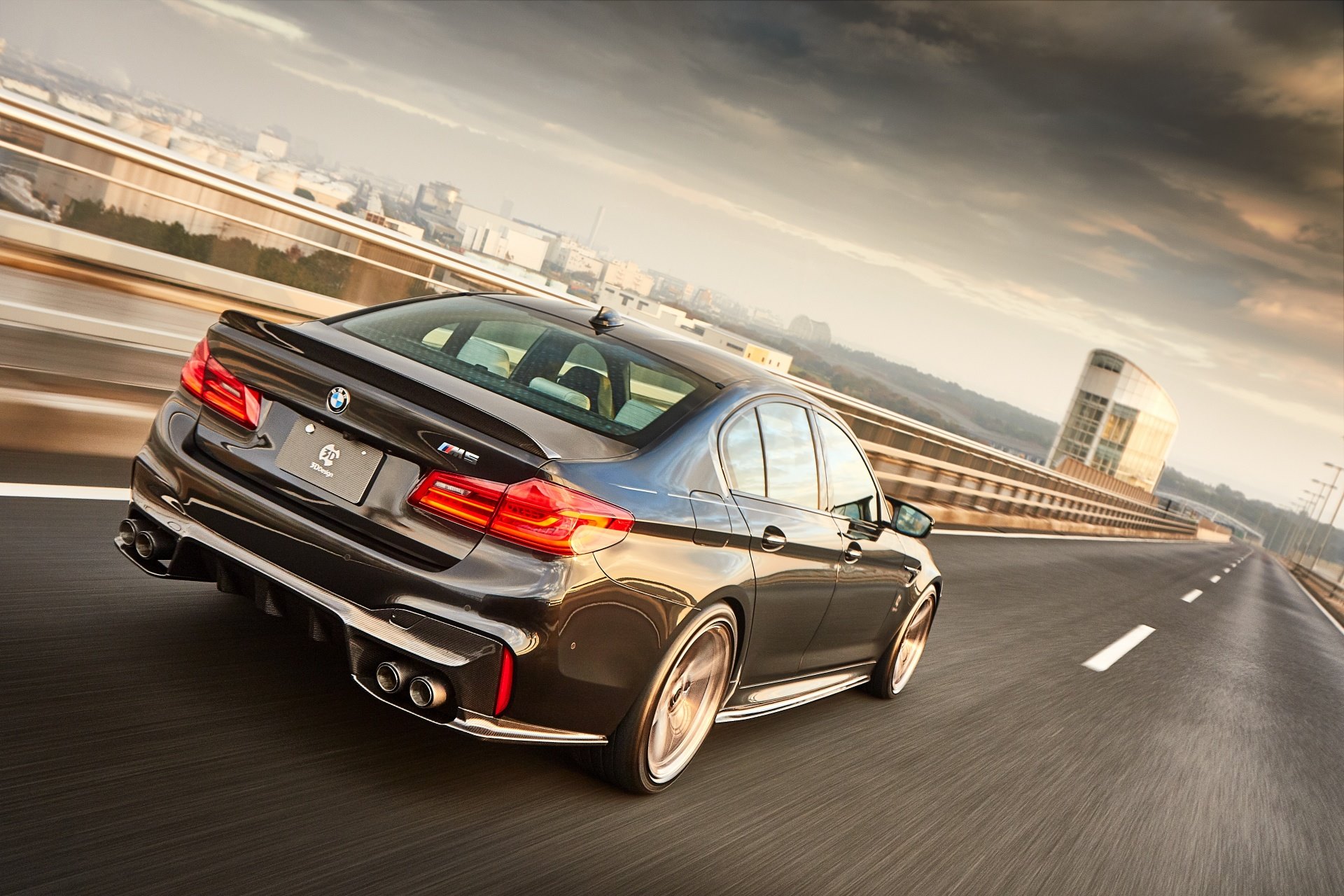 Die auffällige Spoilerlippe sorgt gemeinsam mit dem auffälligen Diffusor-Einsatz dafür, dass die Heckpartie des BMW M5 F90 endgültig ihre Unschuld verliert. Die vier außen in die Schürze integrierten Endrohre betonen den mittigen Diffusor zusätzlich und dürften auch ungeübten Augen klar machen, dass hier alles andere als ein gewöhnlicher 5er unterwegs ist. Große Leichtmetallräder und die Seitenschweller-Aufsätze aus Carbon werten auch die Seitenansicht sportlich auf.