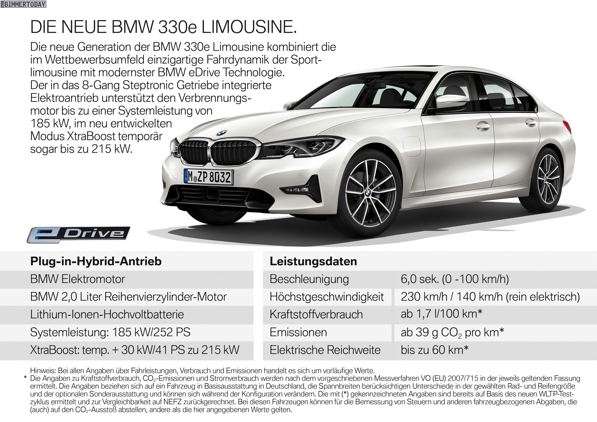 Die wesentlichen technischen Eckpunkte sind unseren Lesern bereits seit über einem Monat bekannt, nun gibt es endlich erste echte Fotos sowie weitere Erläuterungen zum Plug-in-Hybrid BMW 330e 2019. Der erste 3er G20 mit elektrifiziertem Antrieb kommt im Sommer auf den Markt und bietet auf den ersten Blick wie sein Vorgänger eine Systemleistung von 252 PS, doch trotz dieser Gemeinsamkeit hat sich technisch sehr viel getan.