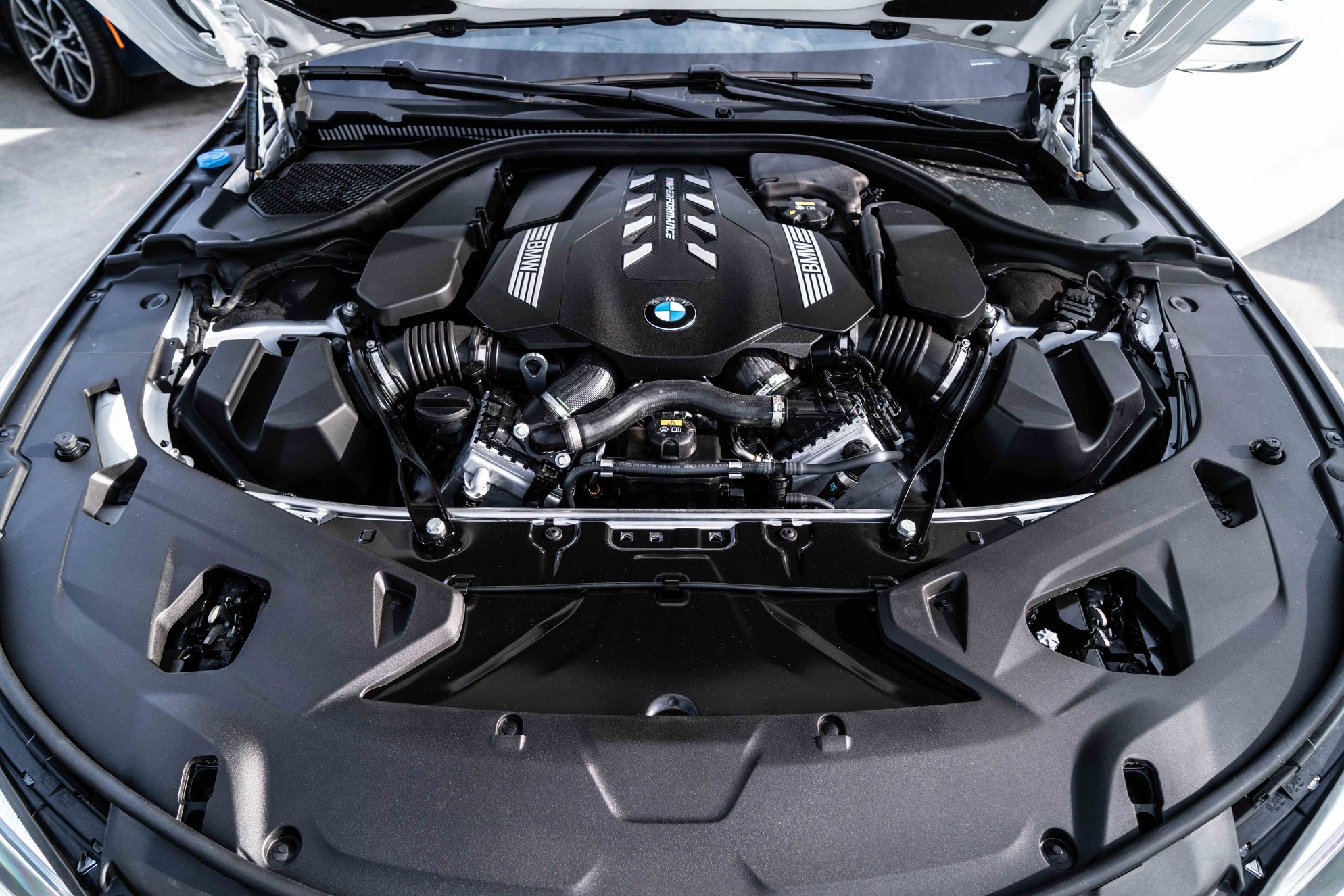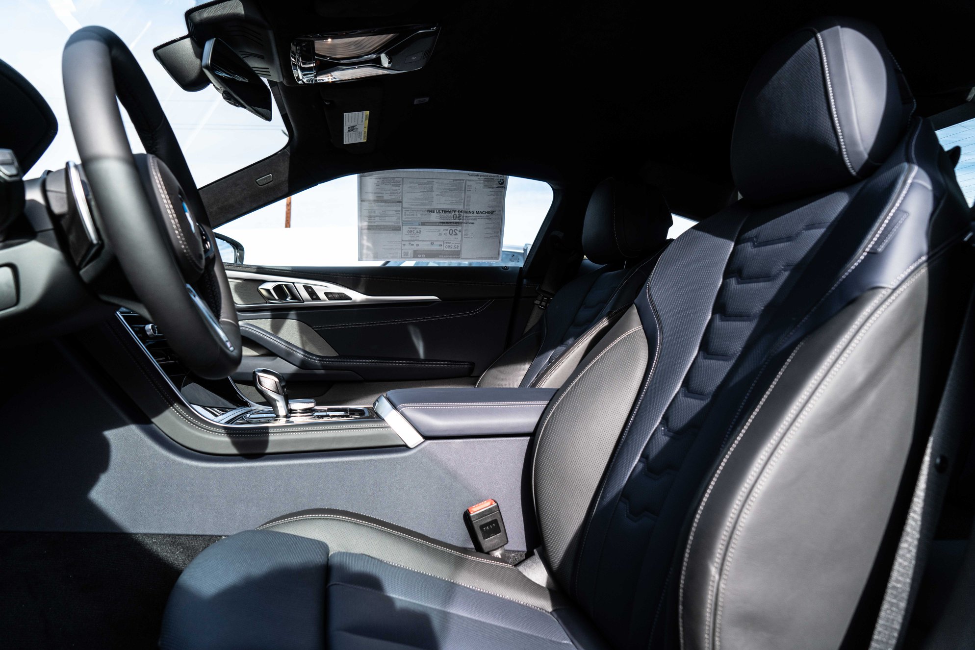 Die Fotos zeigen das edle Sportcoupé in der einzigen ab Werk erhältlichen Uni-Lackierung, alle anderen Farben sind Metallic-Lackierungen. Auf die scharfen Kontraste, die die weiße Farbe in Verbindung mit der erweiterten Shadowline bieten könnte, haben die Amerikaner bei ihrer Konfiguration verzichtet. Stattdessen sehen wir erstmals das optionale Chrome Line Exterieur, das auch die beim M850i üblichen Details in Cerium Grey abwählt und stattdessen auf viel Chrom und Außenspiegel in Wagenfarbe setzt.