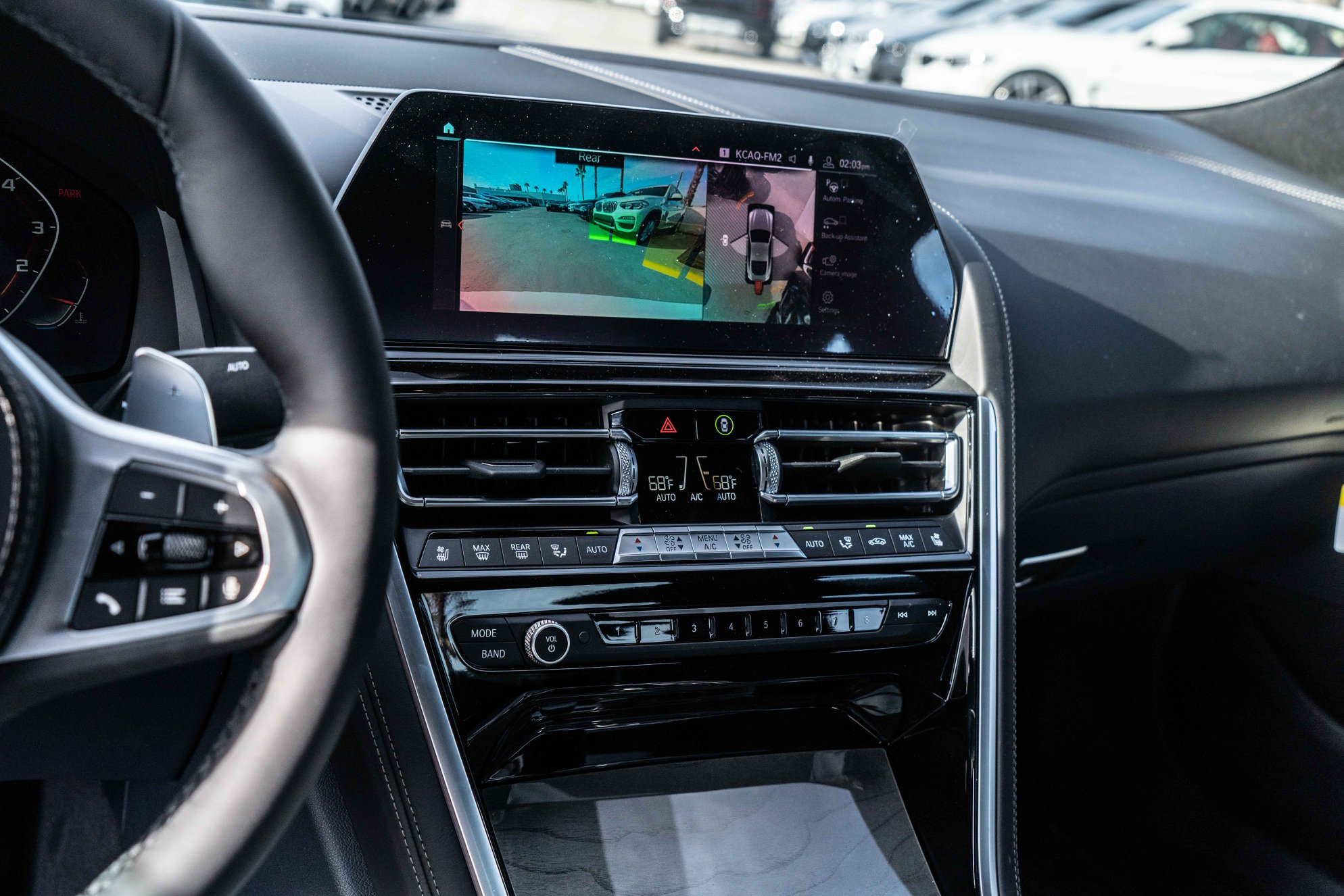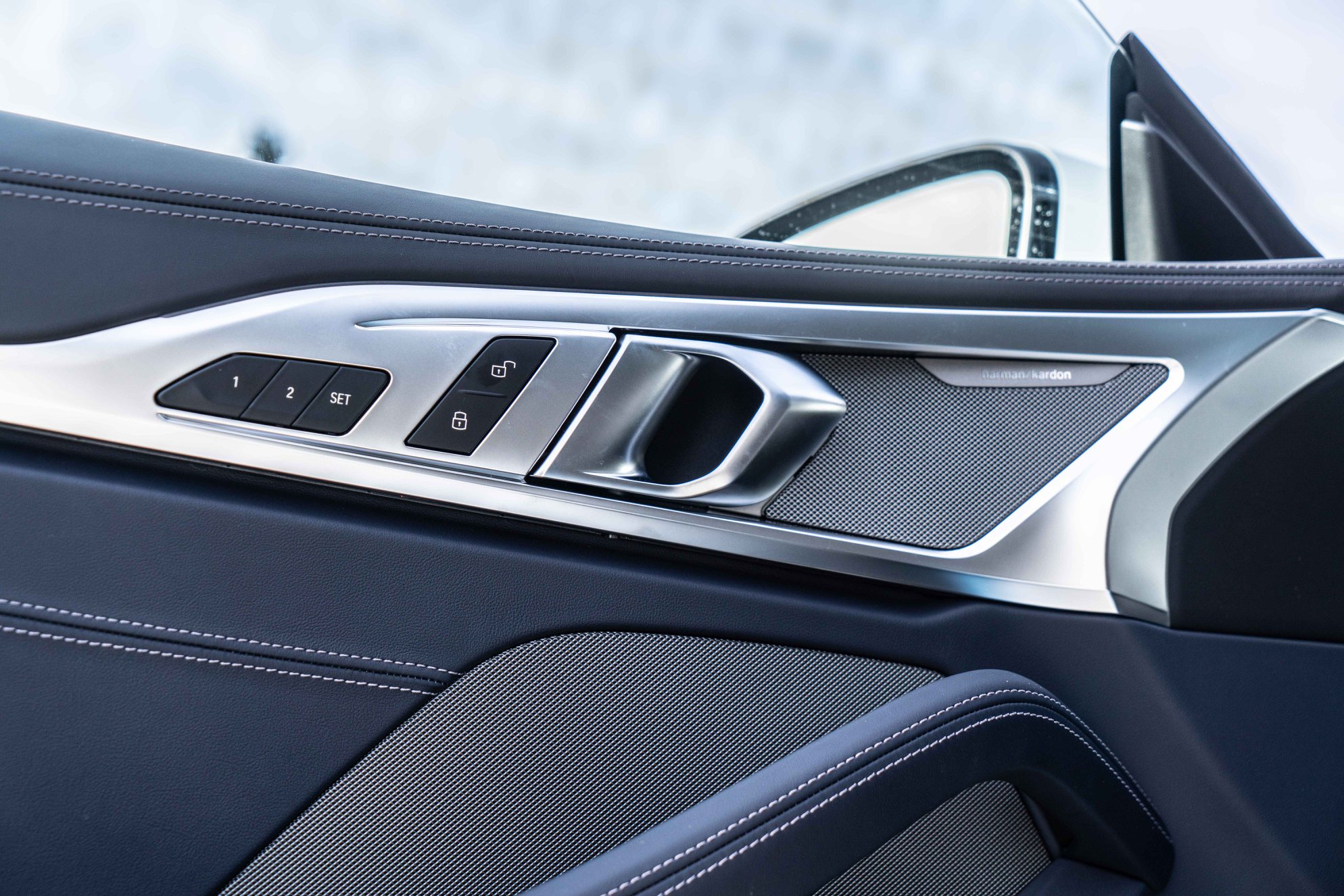 Im Innenraum trägt das weiße M850i Coupé von Century West BMW die erweiterte Lederausstattung Merino in Nachtblau / Schwarz sowie die Interieurleisten Edelholz Esche Maser grau-metallic hochglänzend. Das BMW Live Cockpit Professional mit zwei 12,3 Zoll großen Displays ist für alle 8er G15 serienmäßig an Bord und umfasst auch das Head-Up Display.