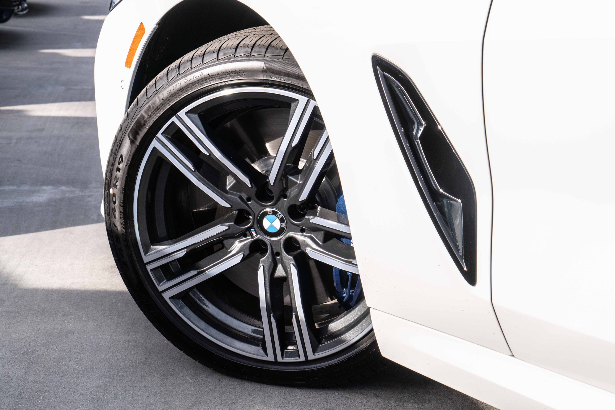 Der gezeigte BMW M850i steht außerdem auf den 19 Zoll großen M Leichtmetallrädern 727 M, die die Standardfelge in Verbindung mit dem M Sportpaket sind. Dahinter sehen wir die blauen Bremssättel der M Sportbremse. Ein besonderer Hingucker am höchsten Punkt des Fahrzeugs ist das M Carbon-Dach, das gegen einen Aufpreis von 3.000 Euro verbaut wird.