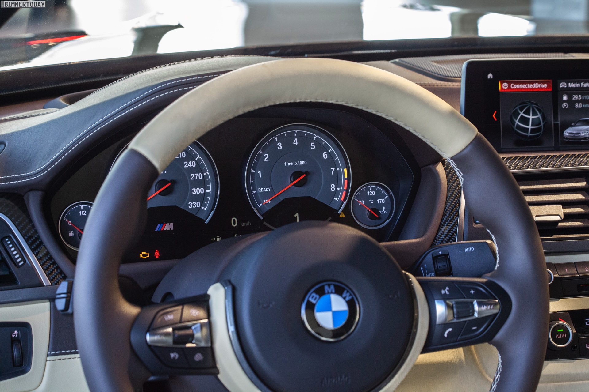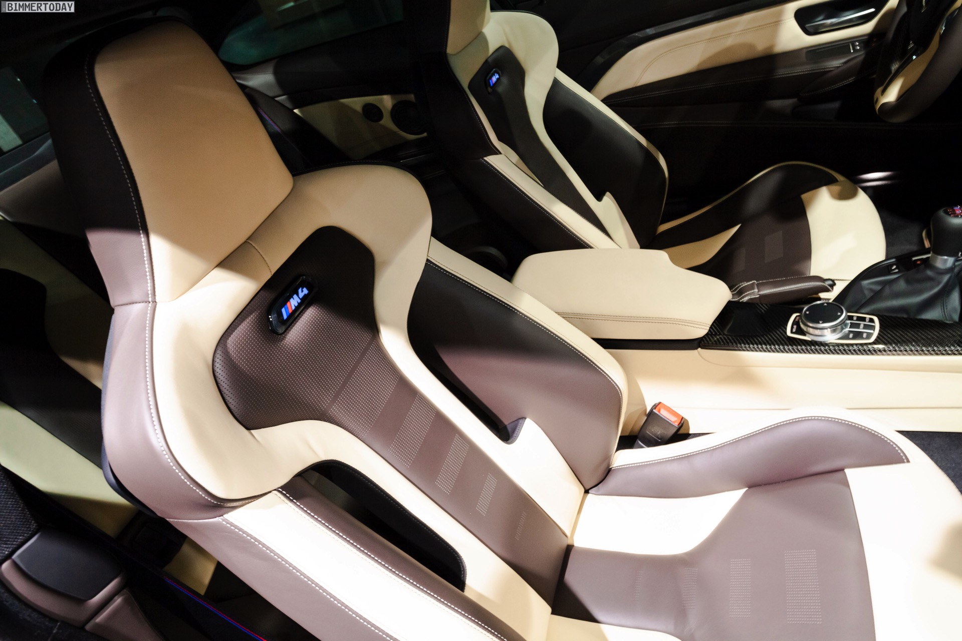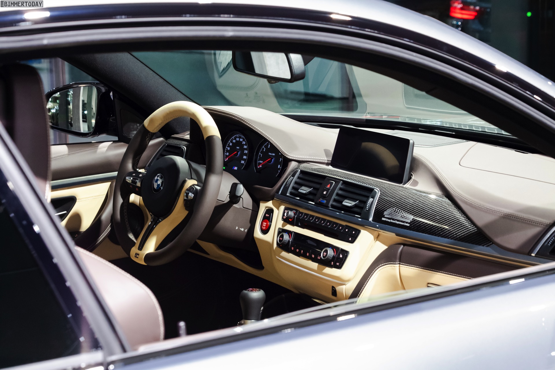Dank der Interieurleisten in Carbon werden auch die dunklen Akzente des Exterieurs wieder aufgegriffen: Ergänzend zum serienmäßigen Carbon-Dach des M4 verfügt das Fahrzeug über die schwarzen Elemente des Competition-Pakets.
