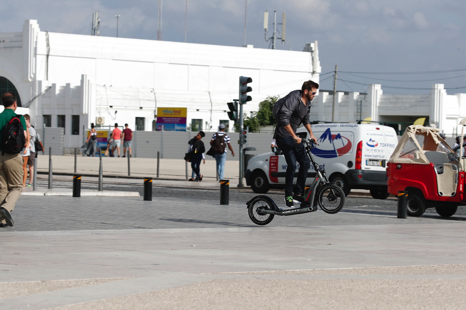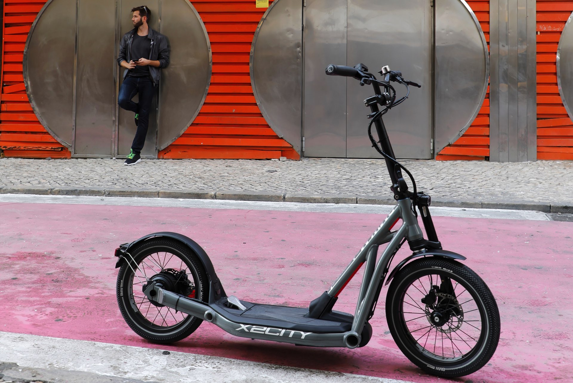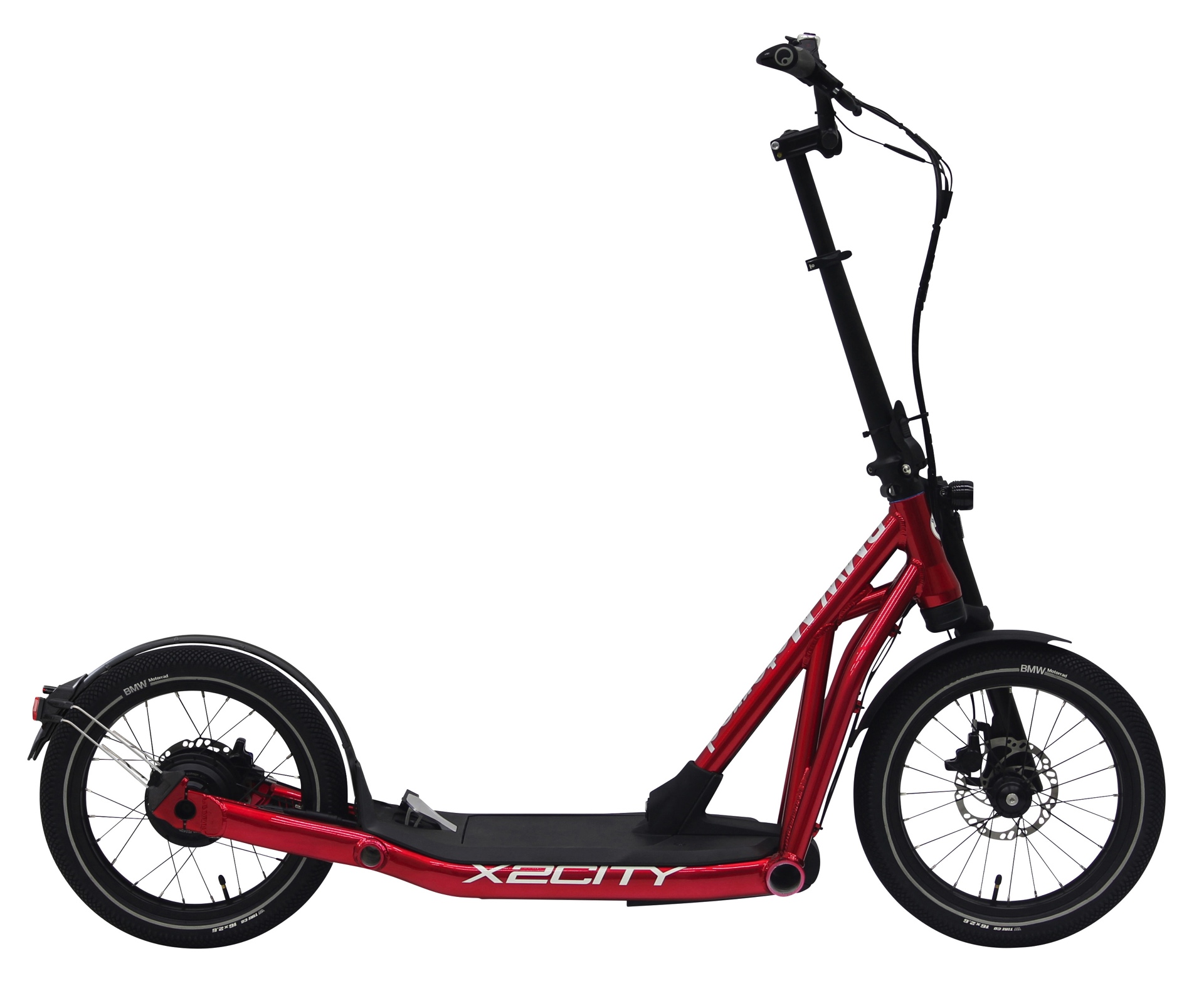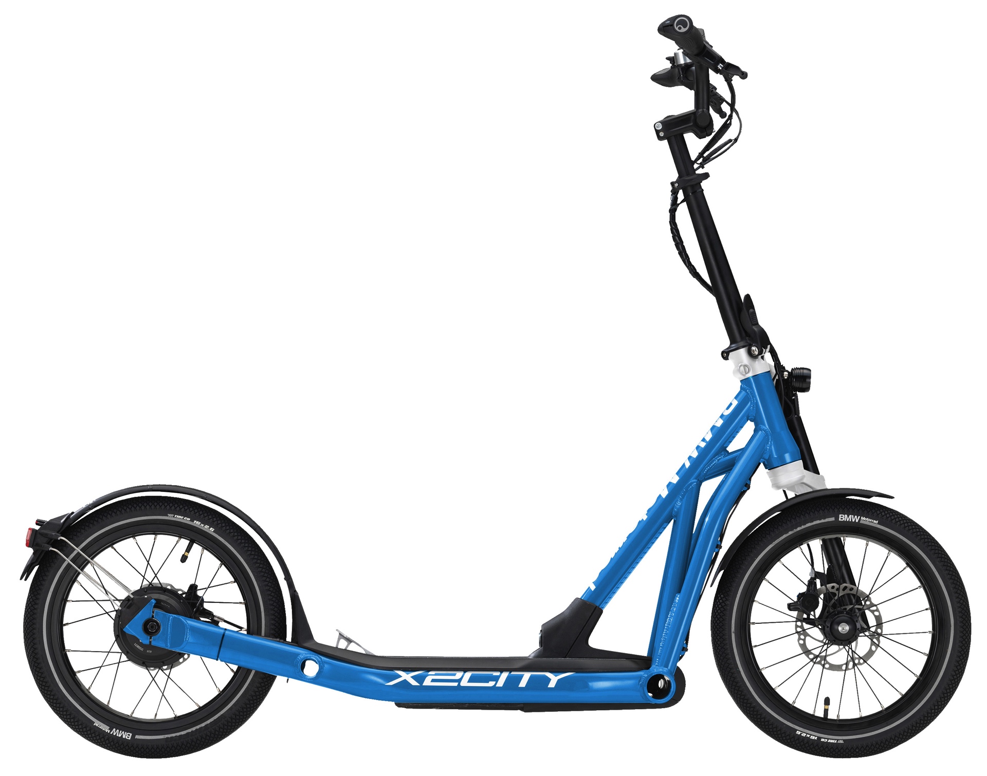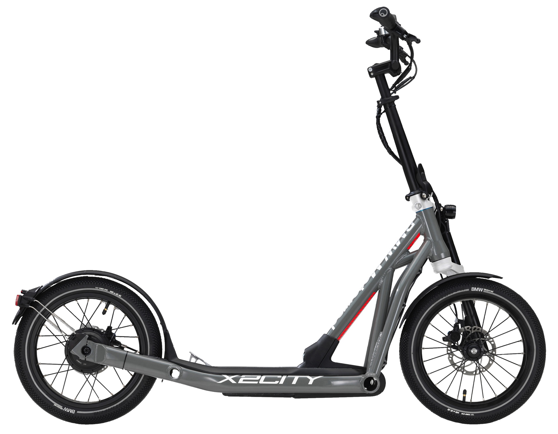 Herzstück des BMW X2City ist ein kleiner Elektromotor, der den Roller völlig ohne Anstrengung mit bis zu 20 km/h durch die Stadt flitzen lässt. Nachdem der Fahrer den Roller auf 6 km/h beschleunigt hat, kann er die Geschwindigkeit mit einem Pedal weiter steigern. Außerdem kann er am Lenker die Geschwindigkeiten 8, 12, 16, 18 und 20 km/h wählen.