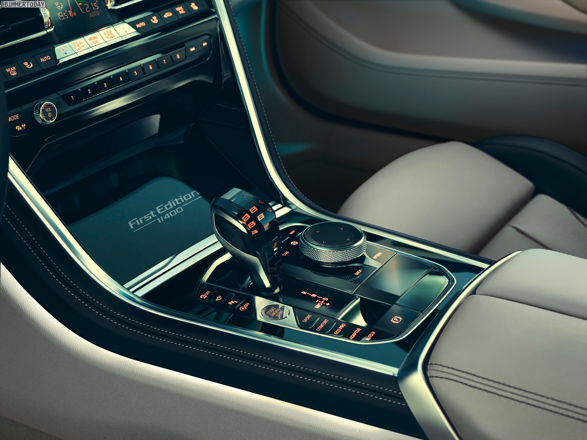 Im Innenraum trägt die First Edition die Individual Volllederausstattung Merino in der neuen Farbkombination Elfenbeinweiß / Nachtblau. Auch der Alcantara-Dachhimmel und das M Lederlenkrad sind in Nachtblau ausgeführt. Vor dem beleuchteten Gangwahlhebel mit ins Glas geschliffener 8 weist der Schriftzug “First Edition 1/400” auf die Sonderedition hin. Für den passenden Sound an Bord des exklusiven 8ers sorgt das Bowers & Wilkins Diamond Surround Sound System.