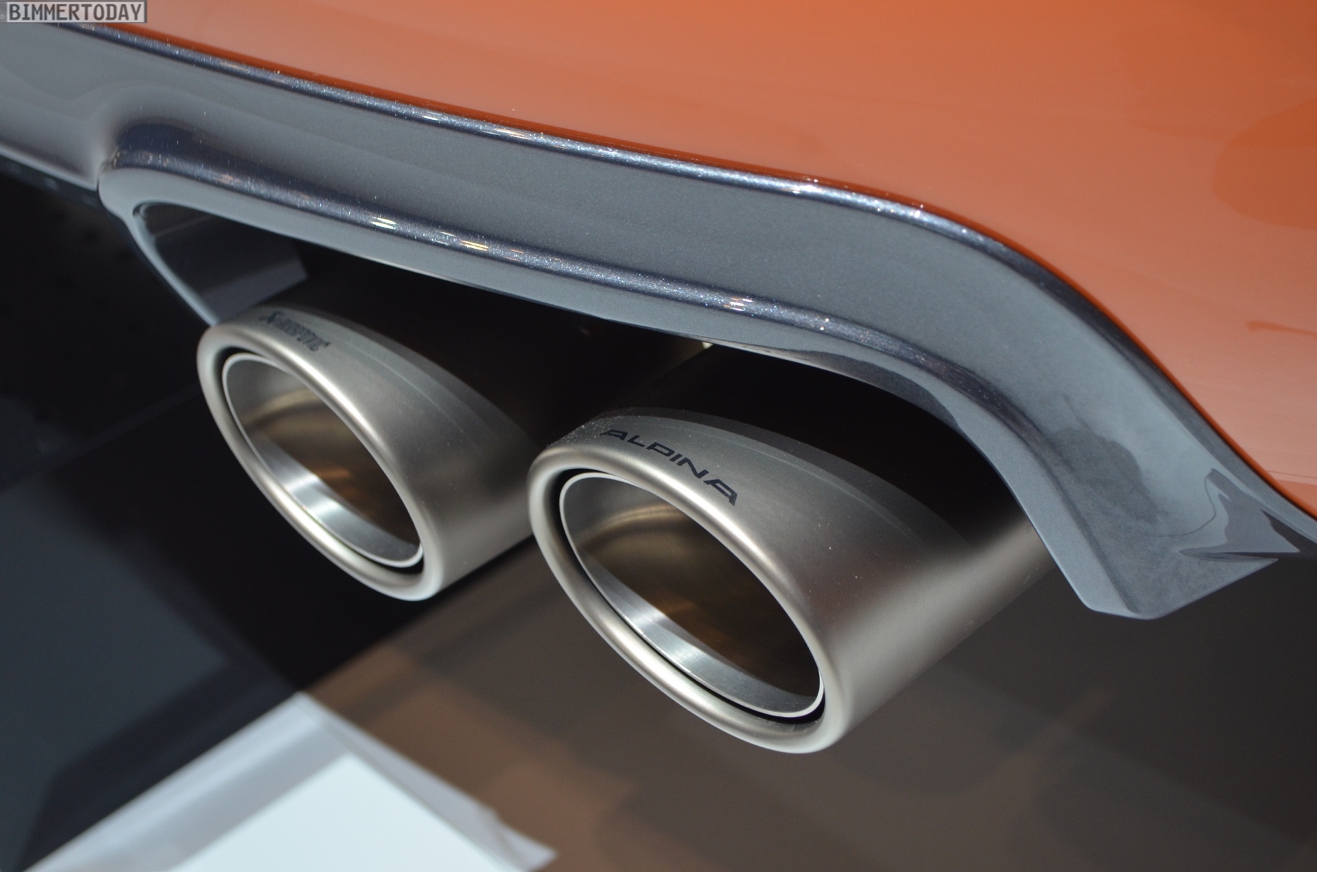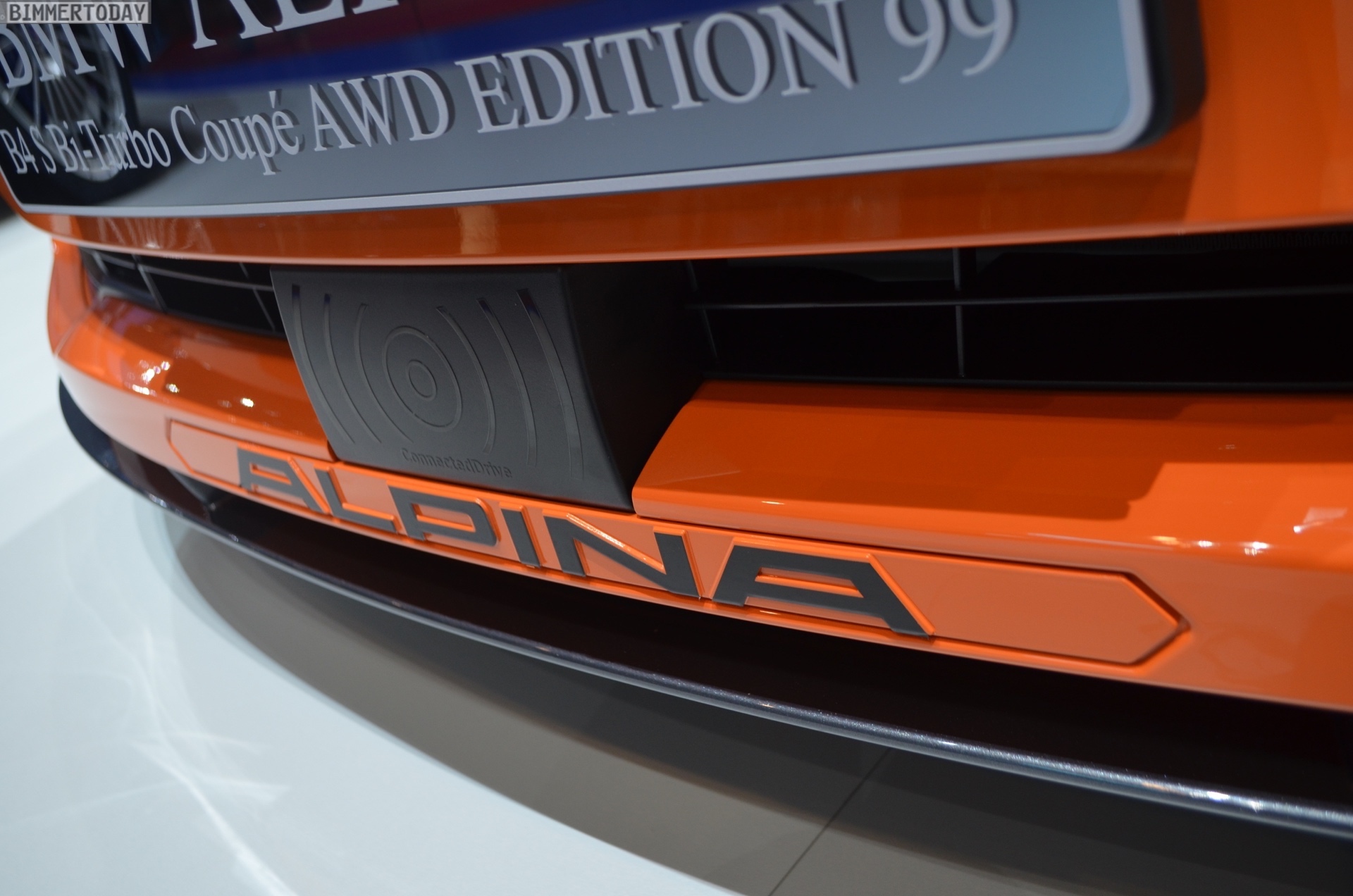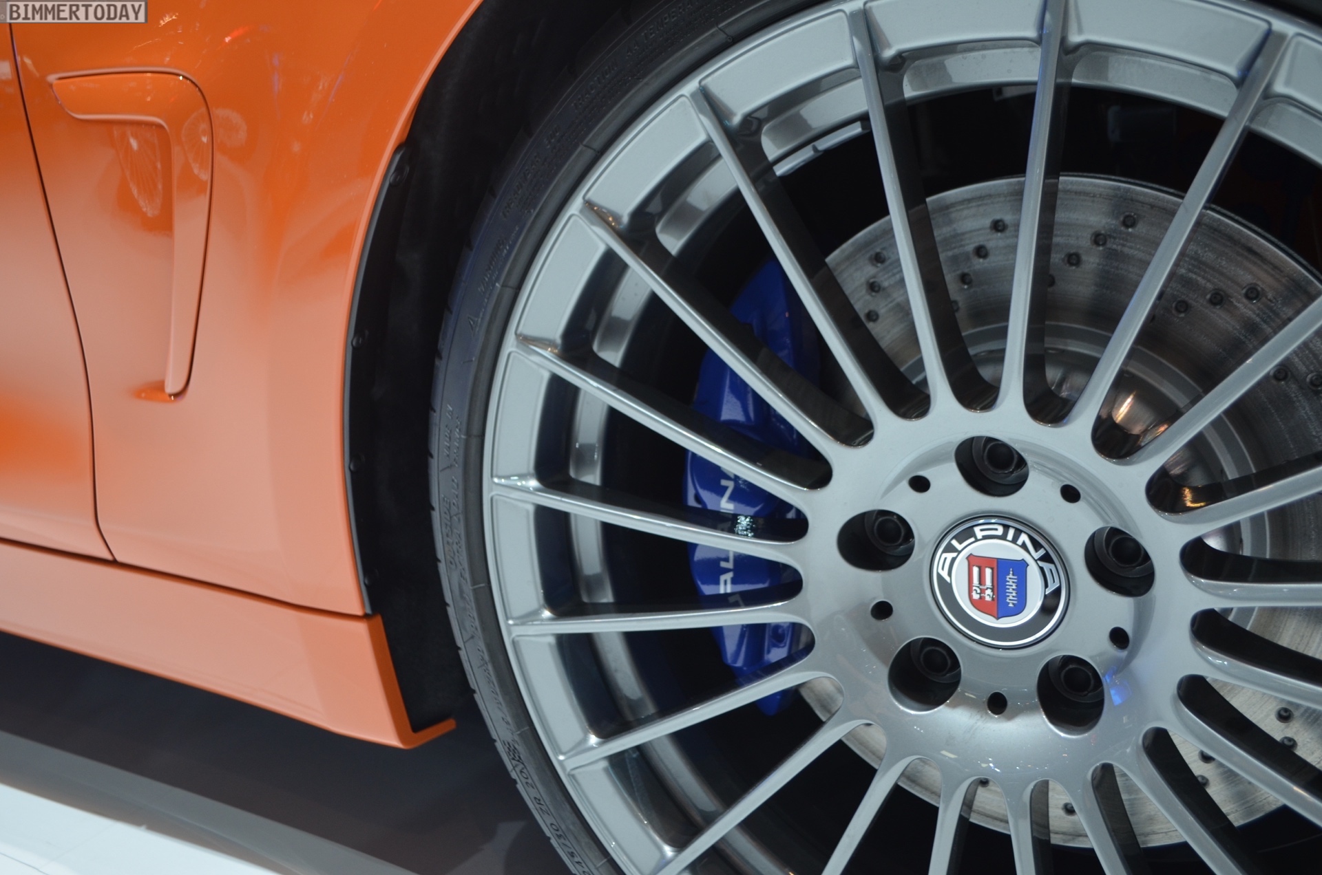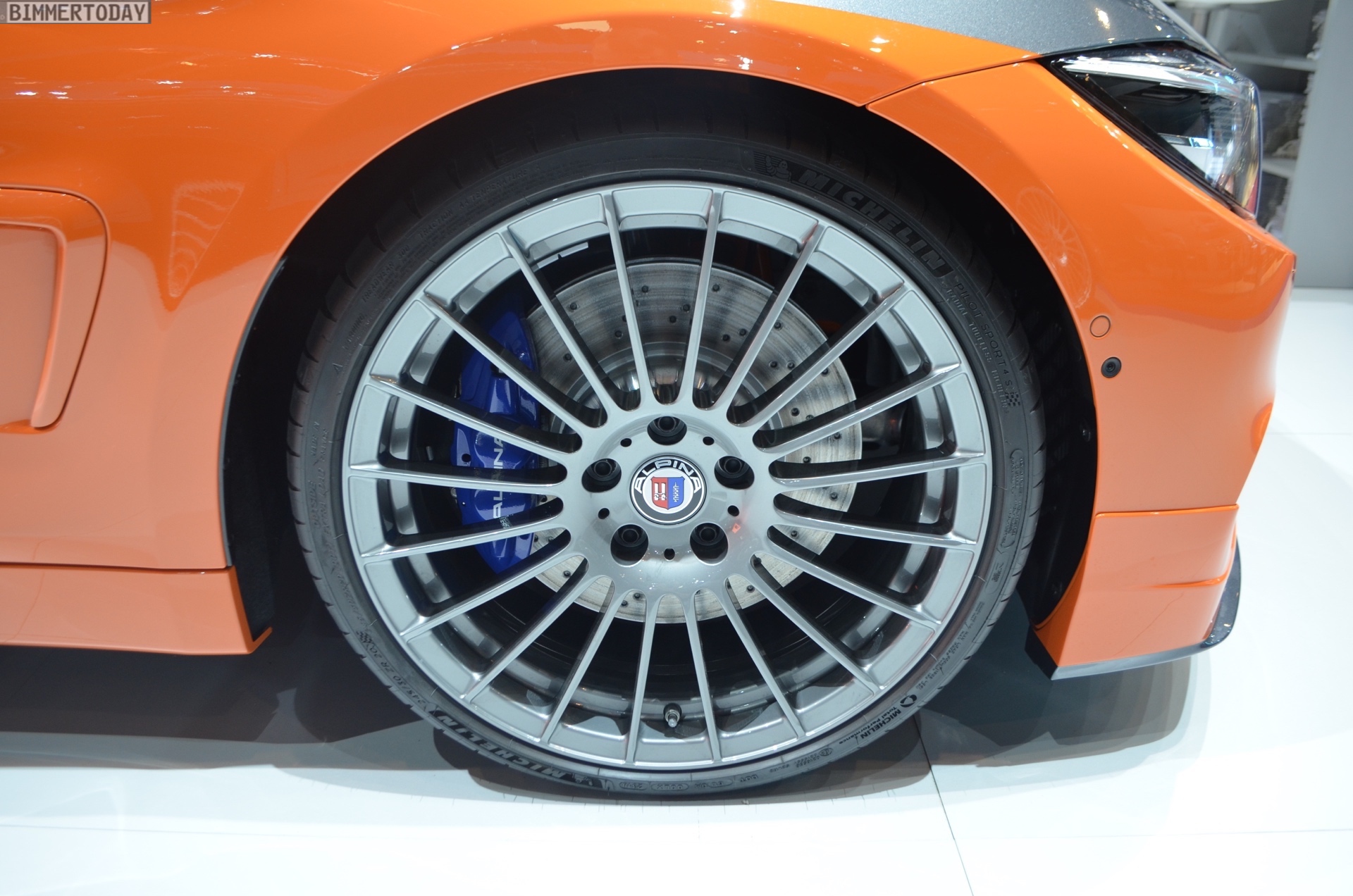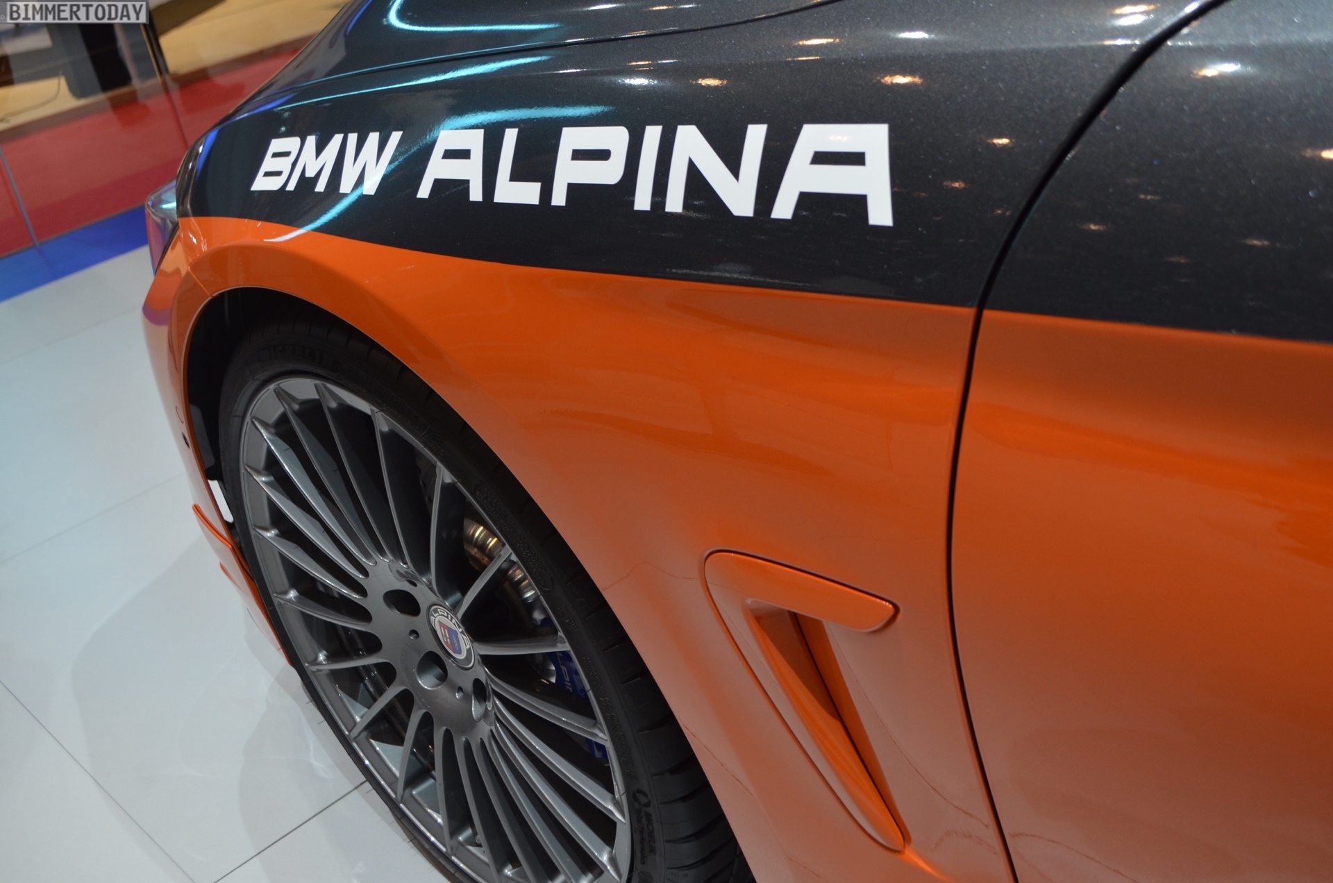 Der auf unseren Fotos zu sehende Alpina B4 S ist nur im unteren Bereich der Karosserie in Feuerorange lackiert, die obere Hälfte des exklusiven Sondermodells glänzt in dunklem Grau, was sehr gut mit den 20 Zoll großen Felgen in Ferric Grey harmoniert. Große BMW Alpina Schriftzüge auf den vorderen Kotflügeln bringen zusätzliches Motorsport-Flair und beseitigen letzte Zweifel am sportlichen Anspruch dieses ganz besonderen BMW Alpina B4 S.