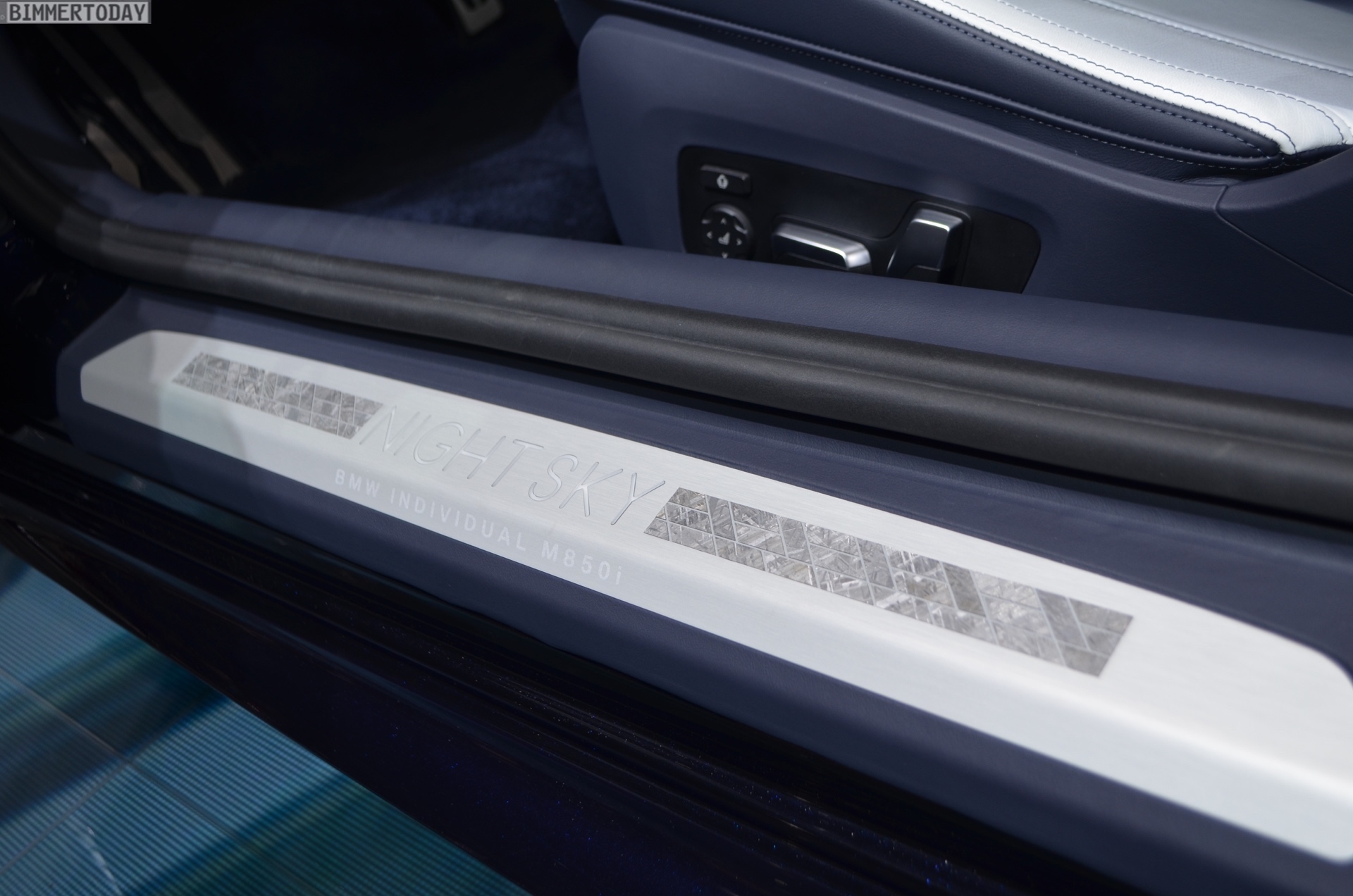 Im Innenraum setzt der BMW M850i Night Sky das Meteoriten-Thema konsequent fort. Die Meteoriten-Musterung an Dachhimmel und Dekorflächen wird mit beleuchteten Sternbildern auf der Mittelkonsole und echtem Meteoriten-Material an den Bedienelementen kombiniert. Die Lederausstattung der BMW Individual Manufaktur kommt in einem exklusiven Tricolor-Design, das eine Widmanstätten-Struktur mit den Farben Opalweiß, Nachtblau und Silber nachbildet.