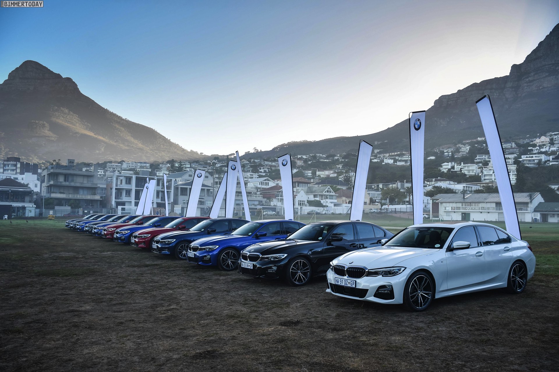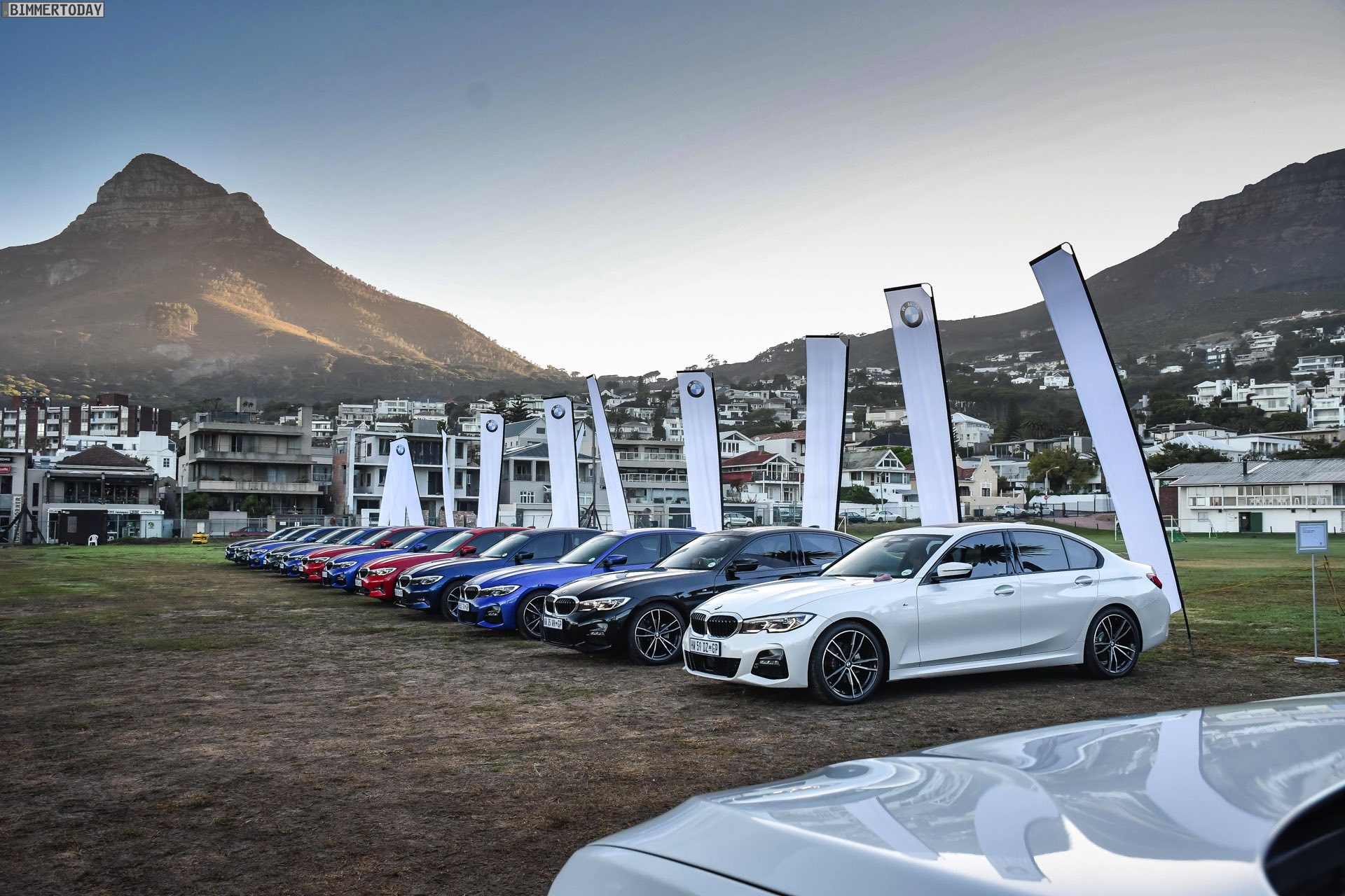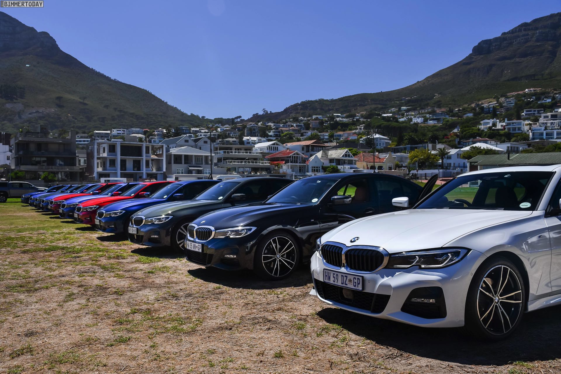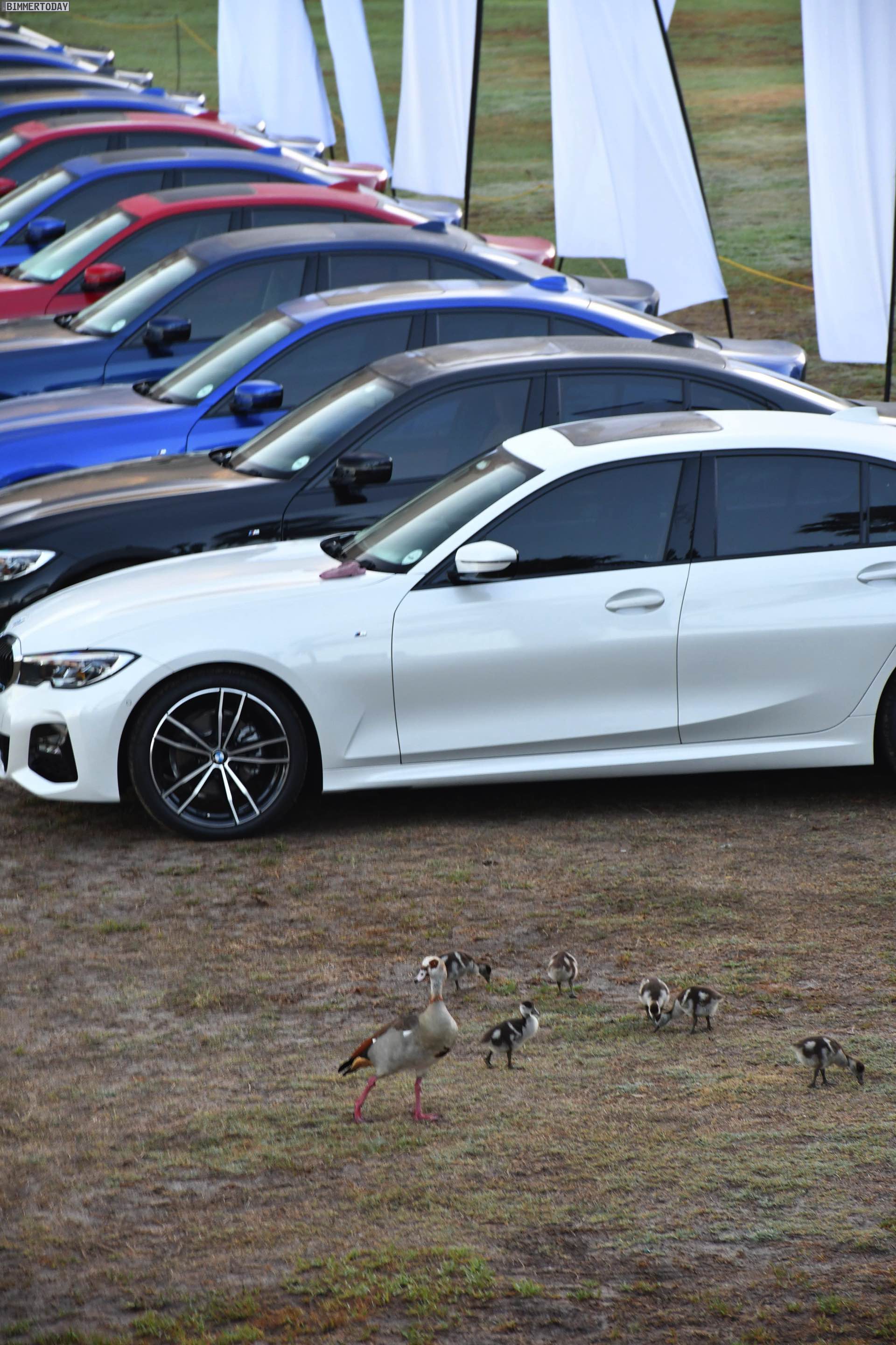 Im Fokus steht dabei ein BMW 320d G20 mit Sport Line, den BMW Südafrika gemeinsam mit vielen anderen Farb- und Ausstattungs-Varianten des BMW 3er G20 zu einem Gruppenfoto versammelt hatten. Der rote 3er trägt die 18 Zoll großen Leichtmetallräder V-Speiche 780 Bicolor, die den elegant-dynamischen Auftritt passend unterstreichen.