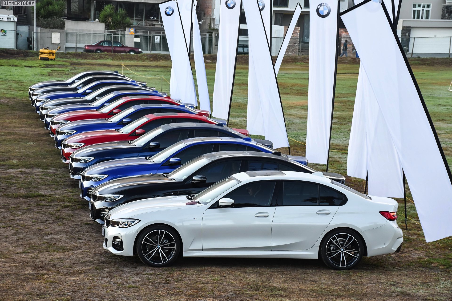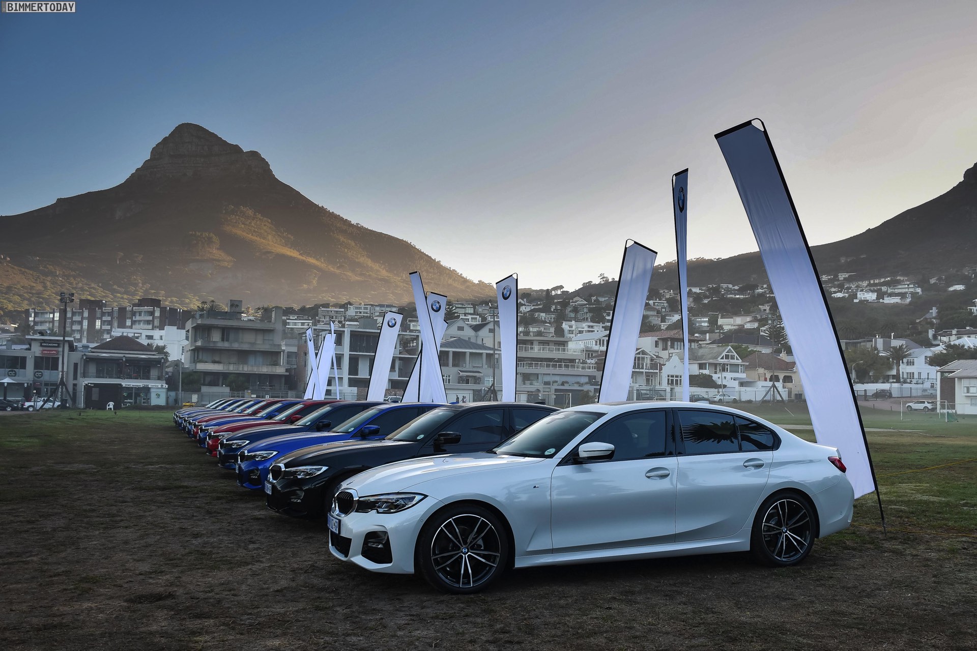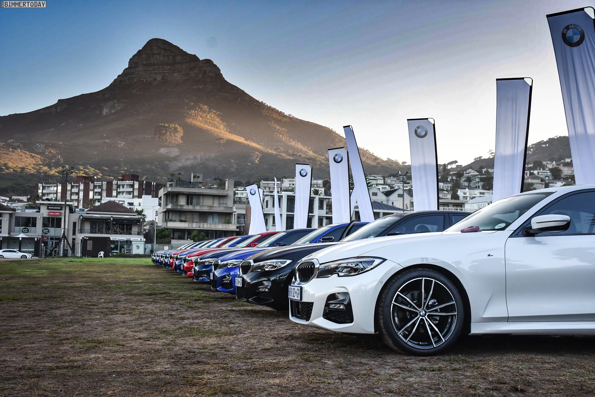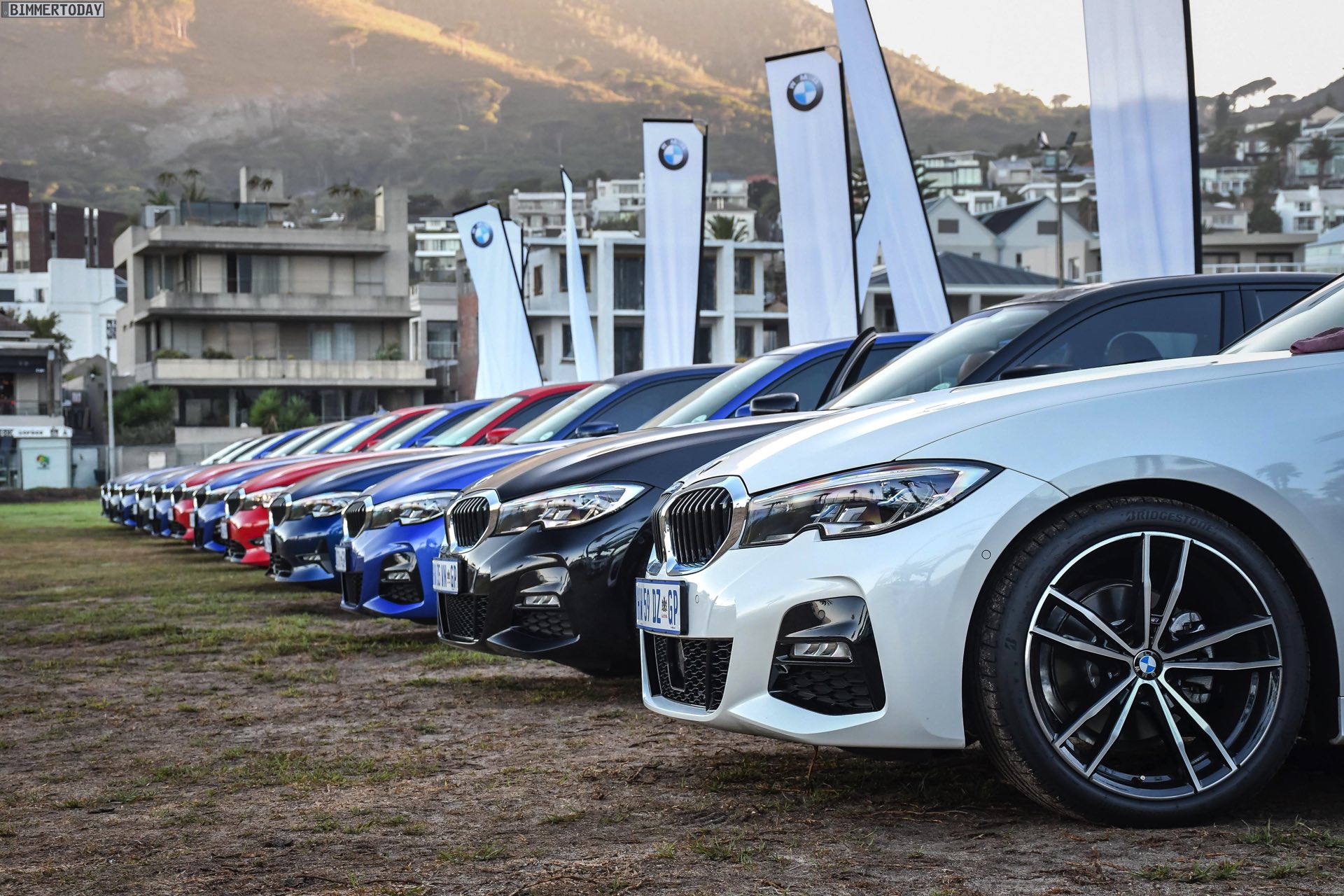Im Fokus steht dabei ein BMW 320d G20 mit Sport Line, den BMW Südafrika gemeinsam mit vielen anderen Farb- und Ausstattungs-Varianten des BMW 3er G20 zu einem Gruppenfoto versammelt hatten. Der rote 3er trägt die 18 Zoll großen Leichtmetallräder V-Speiche 780 Bicolor, die den elegant-dynamischen Auftritt passend unterstreichen.