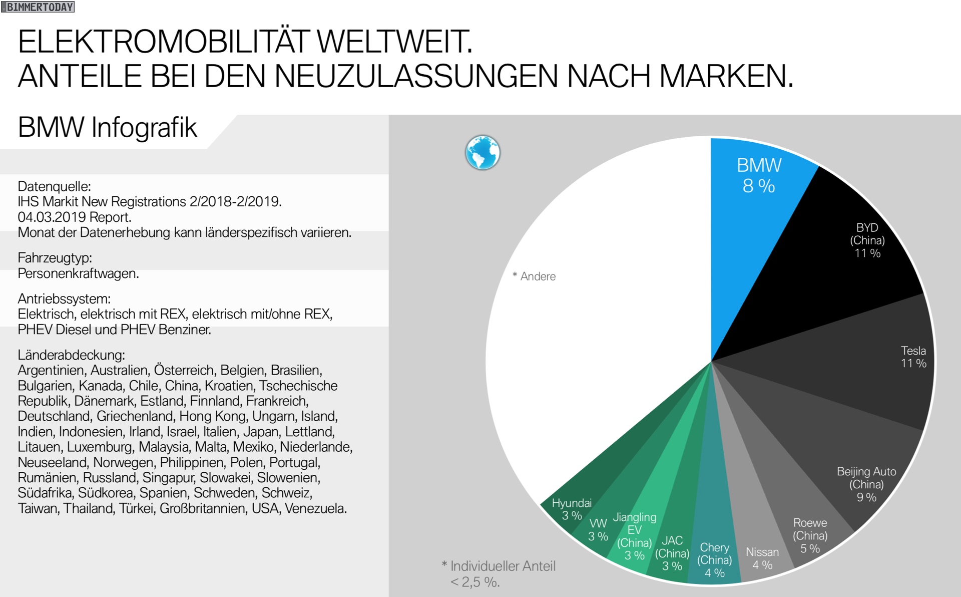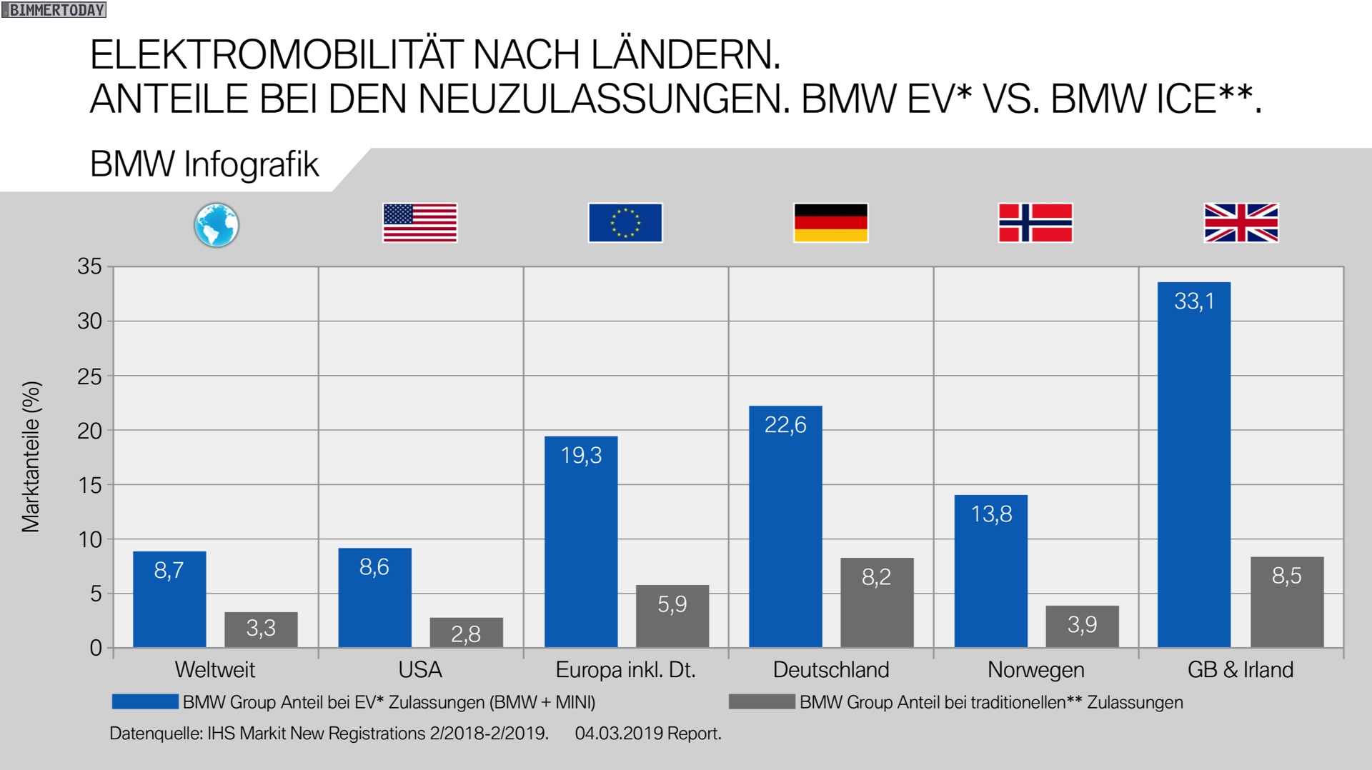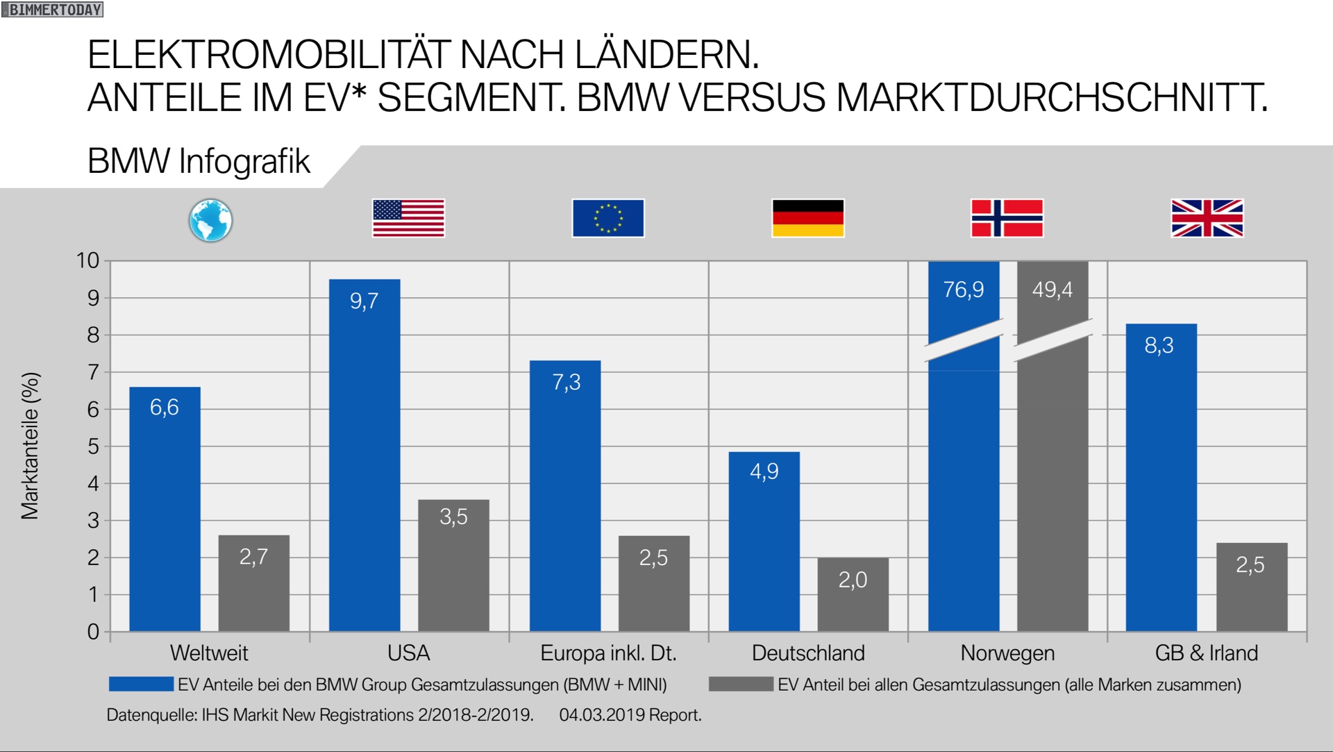 Ähnliche und zum Teil noch beeindruckendere Zahlen gibt es auch aus Norwegen und Großbritannien, auch für die gesamte EU liegt der Anteil von 19,3 Prozent am Elektro-Markt deutlich höher als beim Blick auf den Gesamtmarkt. In den USA steht die BMW Group für 2,8 Prozent aller konventionell angetriebenen Neuzulassungen, bei den elektrifizierten Fahrzeugen ist der Anteil mit 8,6 Prozent mehr als drei Mal so hoch. Ein ähnliches Verhältnis sehen wir auch beim Blick auf die weltweiten Zahlen.