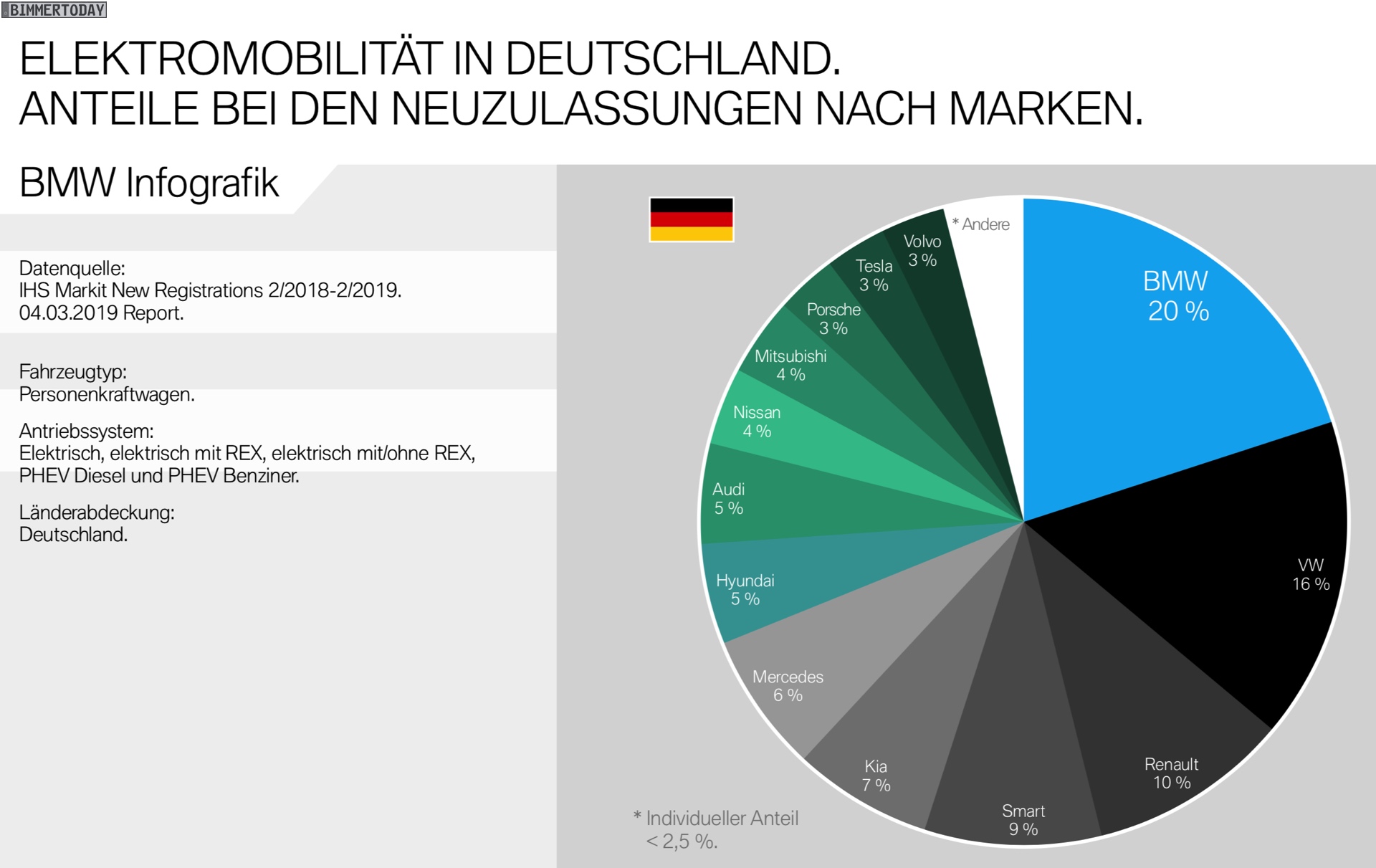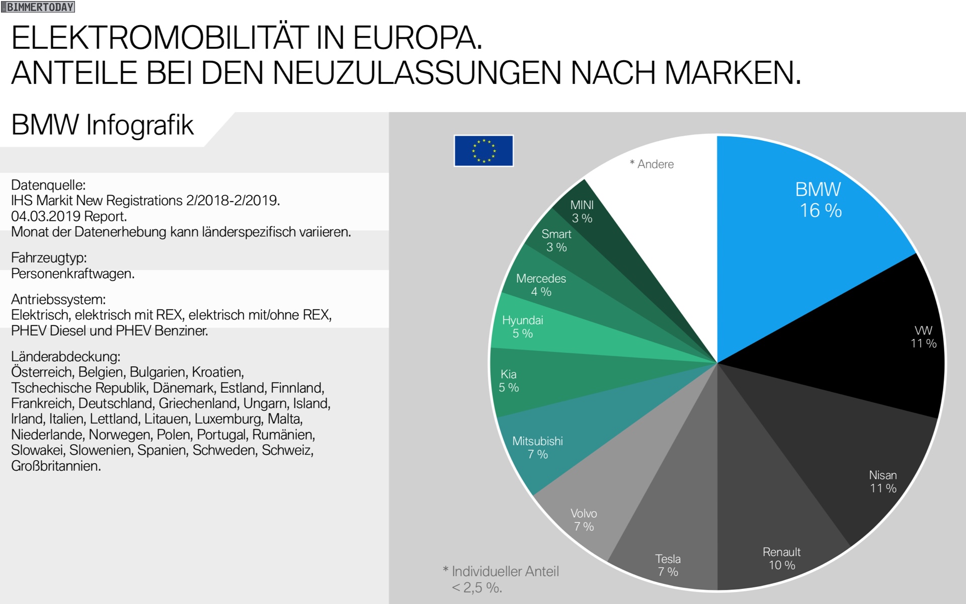 Kaum anders sehen die Zahlen in Europa aus: Mit 16 Prozent des elektrifizierten Gesamtmarkts ist BMW auch hier unumstrittener Marktführer vor Volkswagen, Nissan und Renault. Mercedes kommt hier immerhin auf 4 Prozent und liegt damit nur knapp vor den 3 Prozent von MINI, während Audi mit weniger als 2,5 Prozent unter “Andere” fällt.